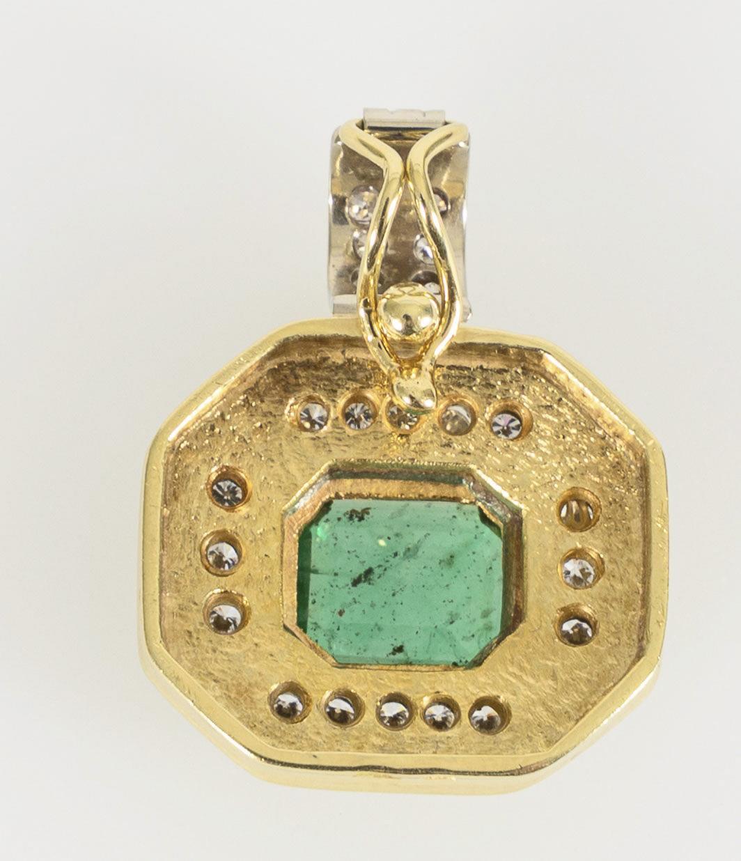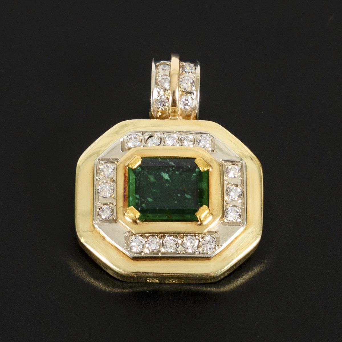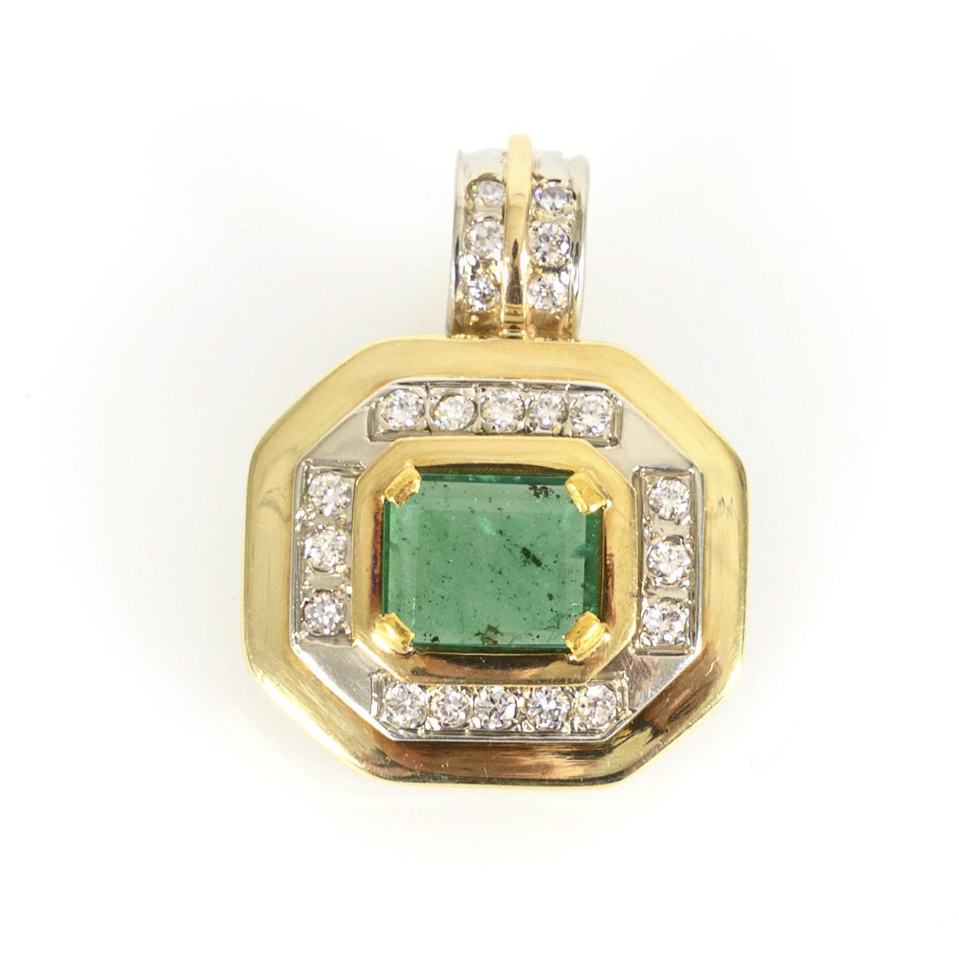 Gelb- und Weißgold 585 gestempelt. 19,61 x 17,49 mm (ohne Öse gemessen), der Smaragd (in der Fassung gemessen) 8,25 x 6,70 x 1,79 mm, die Brillanten zusammen ca. 0,33 ct. 6,89 g.