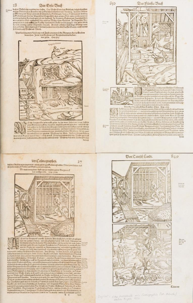 4 Seiten aus "Cosmographia" zum Thema Bergbau