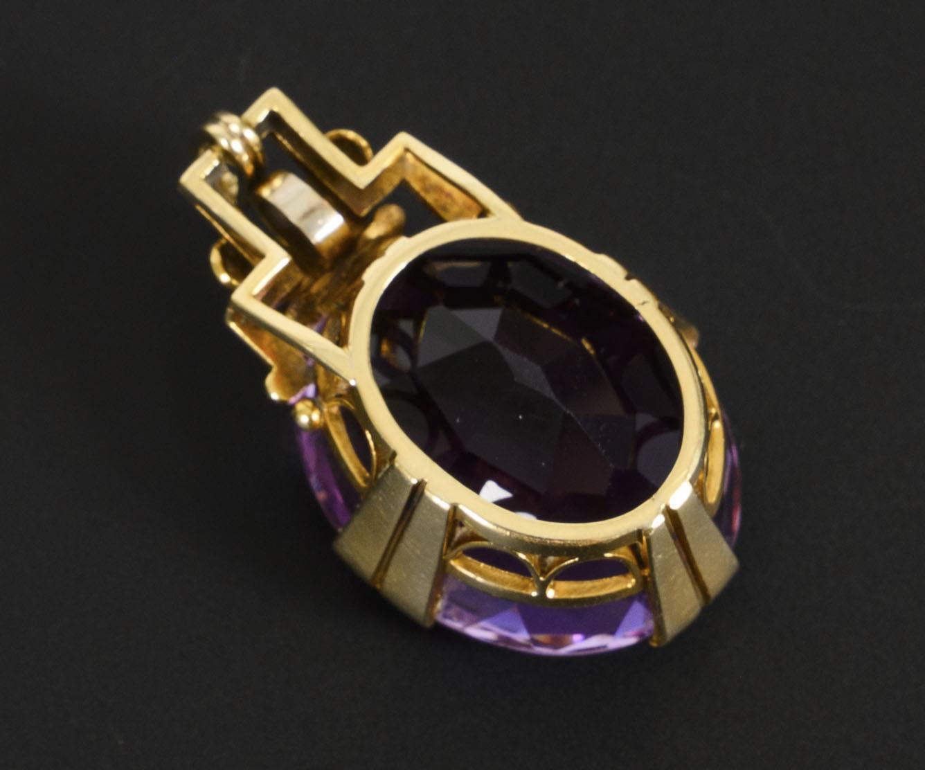 Anhänger, wohl des späten Art déco, mit einem großen, oval-facettierten Amethysten. Die Öse beweglich.