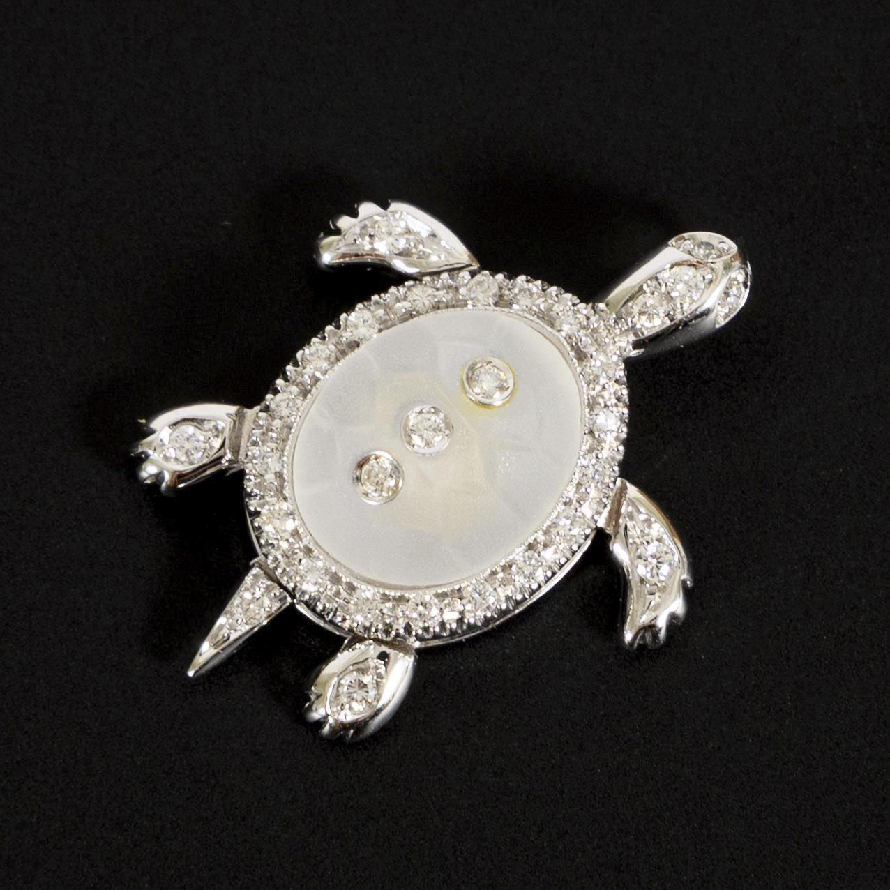 Anhänger in Form einer Schildkröte. Der Schild aus Bergkristall mit 3 eingelassenen, zargengefassten Brillanten, sowie umläufig und auf den Extremitäten mit insgesamt 30 pavégefassten Brillanten besetzt. Die Glieder, Kopf und Schwanz sind beweglich gearbeitet.