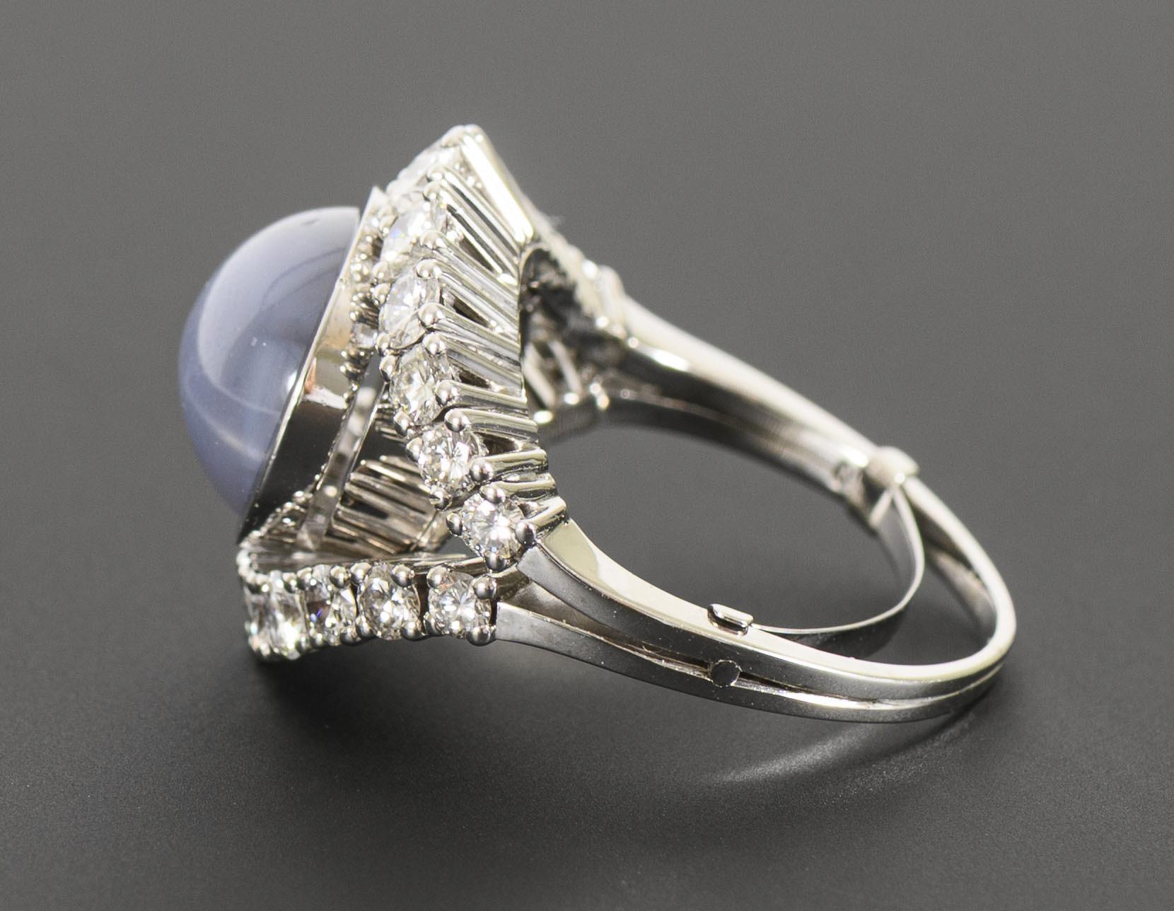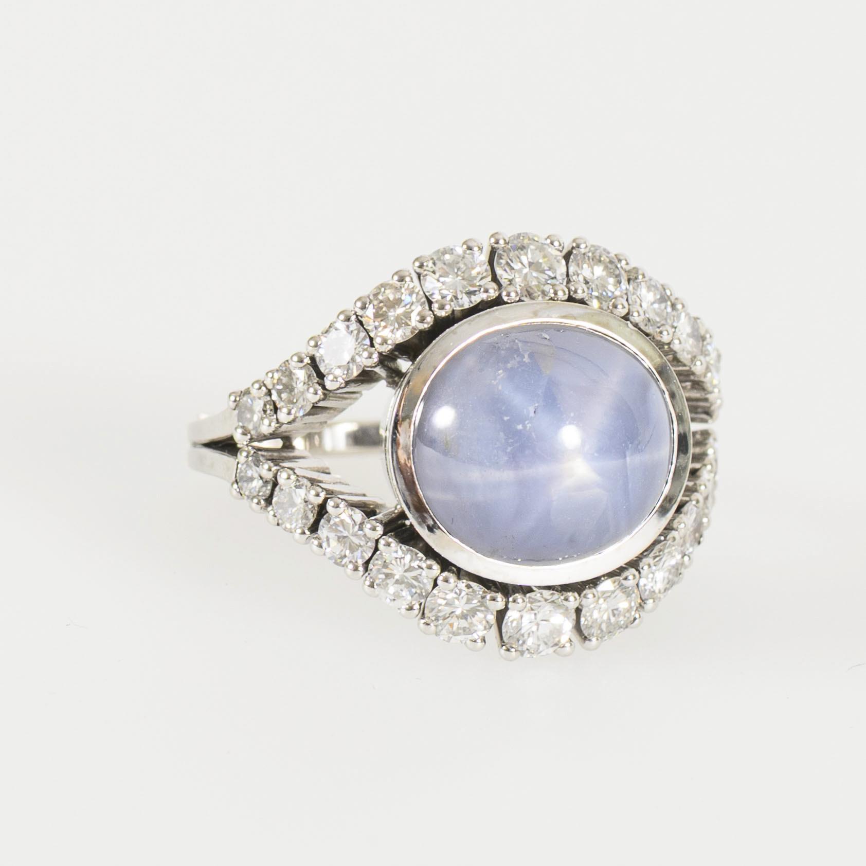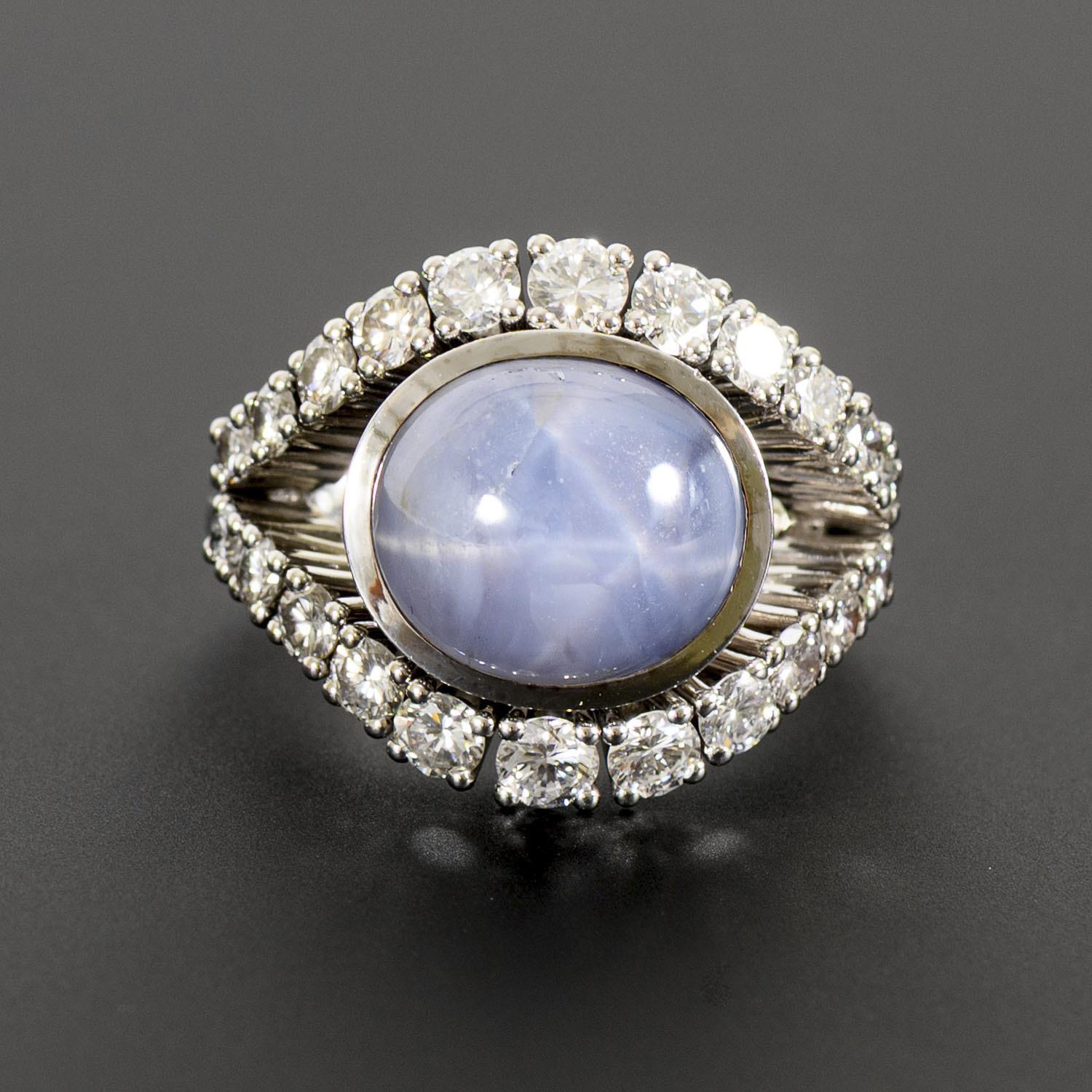 Ring mit zargengefasstem sogenannten Sternsaphir-Cabochon (bei entsprechendem Lichteinfall, besonders durch eine punktförmige Lichtquelle, zeigt sich im Stein ein an einen Stern erinnernder Lichtreflex), umgeben von 2 Bändern, besetzt mit je 11 chatongefassten Brillanten.