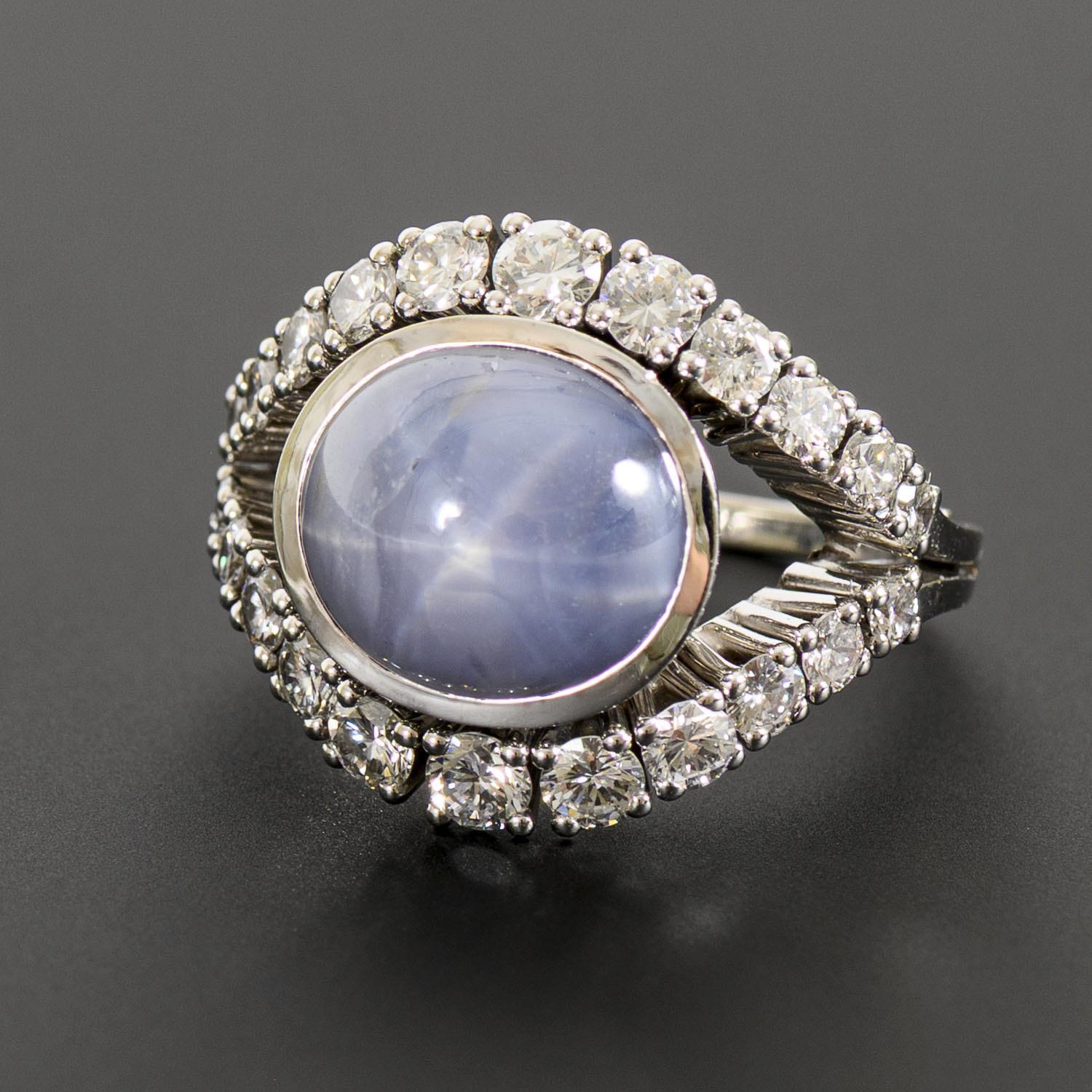 Weißgold 750 gestempelt. Ringgröße 57, durch zusätzliche Ringeinlage auch bei etwas kleineren Ringgrößen tragbar; der Sternsaphir (in der Fassung gemessen) ca. 12,0 x 10,5 x 6,1 mm; die Brillanten zusammen ca. 1,50 ct. 11,92 g.