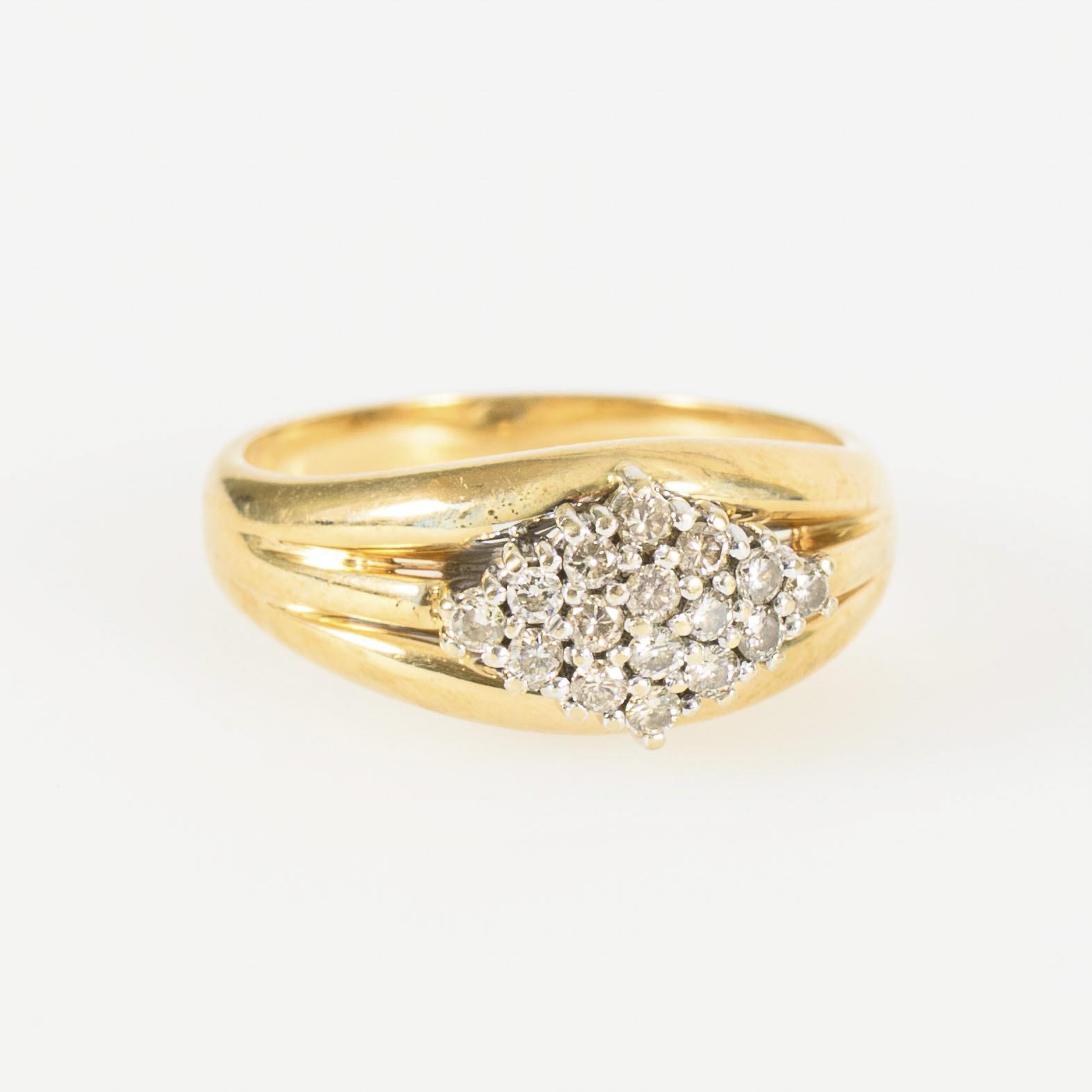 Breiter Ring in Gelbgold mit in Weißgold gefasstem rhombenförmigem Besatz aus 16 Brillanten. Leichte Tragespuren an der Ringschiene.