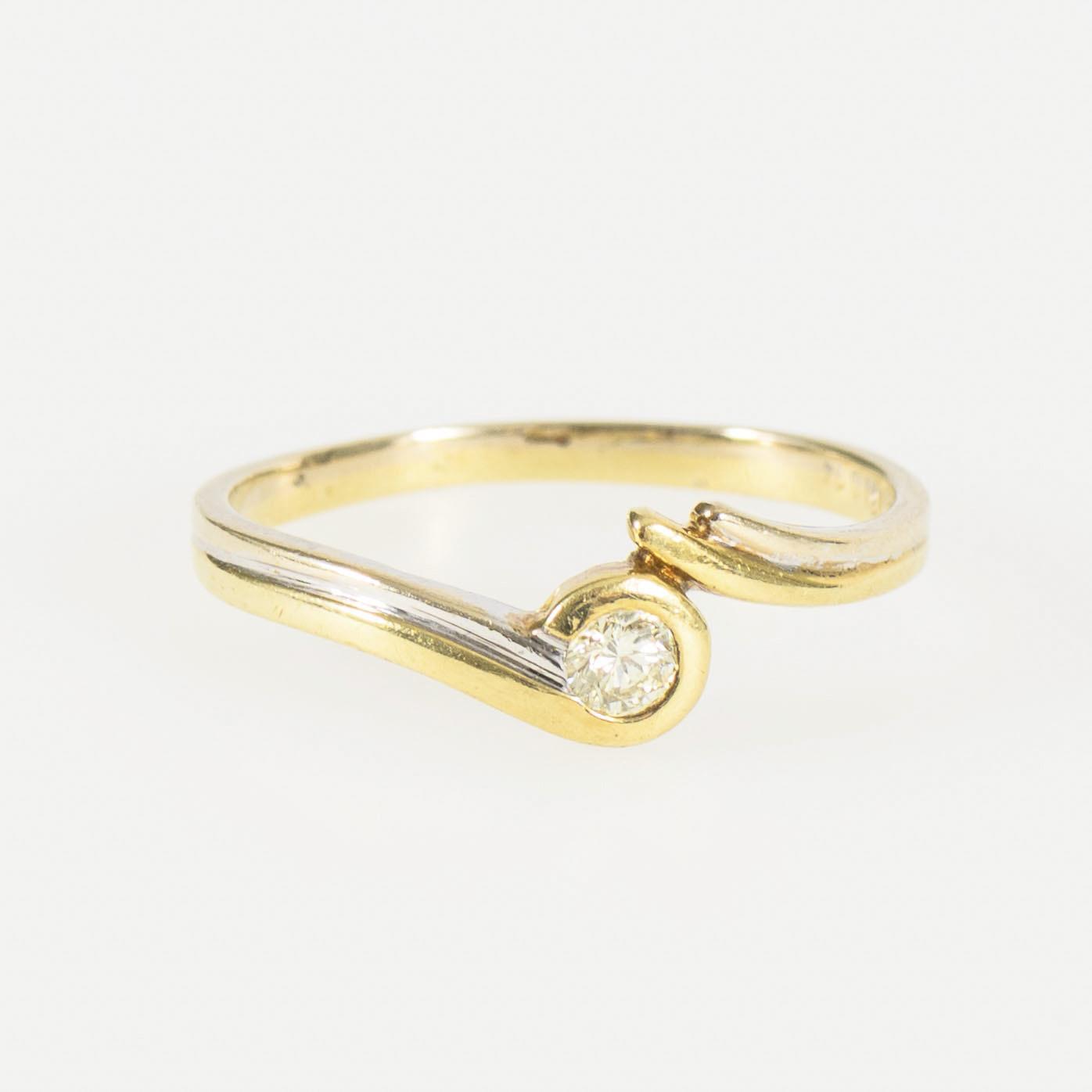 Zweifarbiges, schlangenartig geführtes Ringband mit einem zargengefassten Brillanten. Leichte Tragespuren.