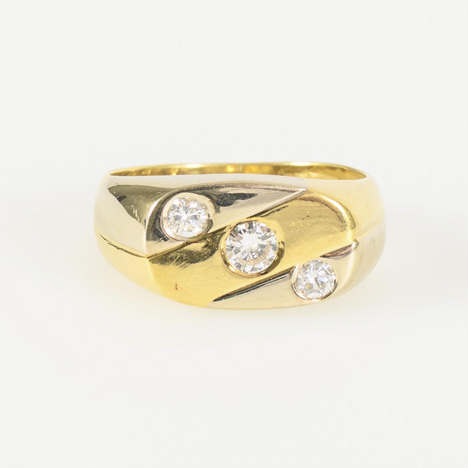 In 3 farblich alternierenden Schrägbändern gestalteter Ringkopf, gegenläufig mit 3 Brillanten besetzt, an einer breiten Schiene. Leichte Tragespuren.