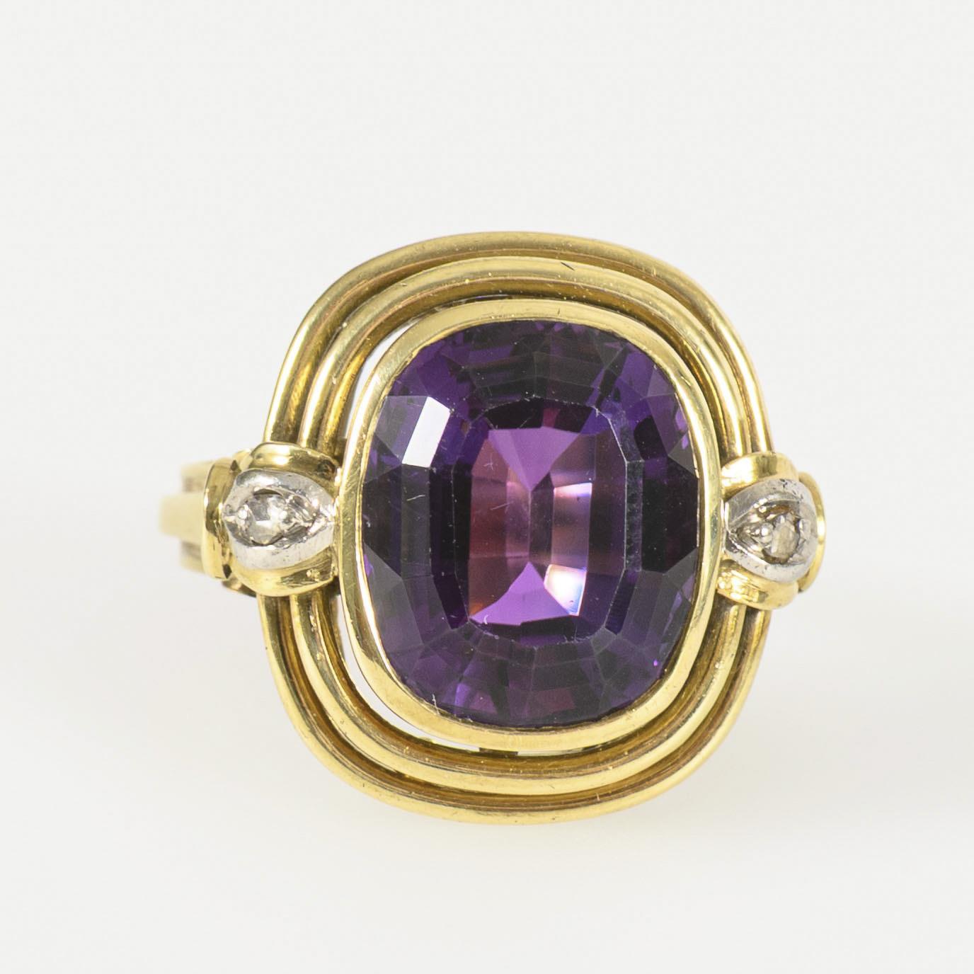 Gelbgold 585 gestempelt. Ringgröße 55, der Ringkopf ca. 19,1 x 19,3 mm, der Amethyst (in der Fassung gemessen) ca. 13,0 x 11,0 mm. 8,77 g.
