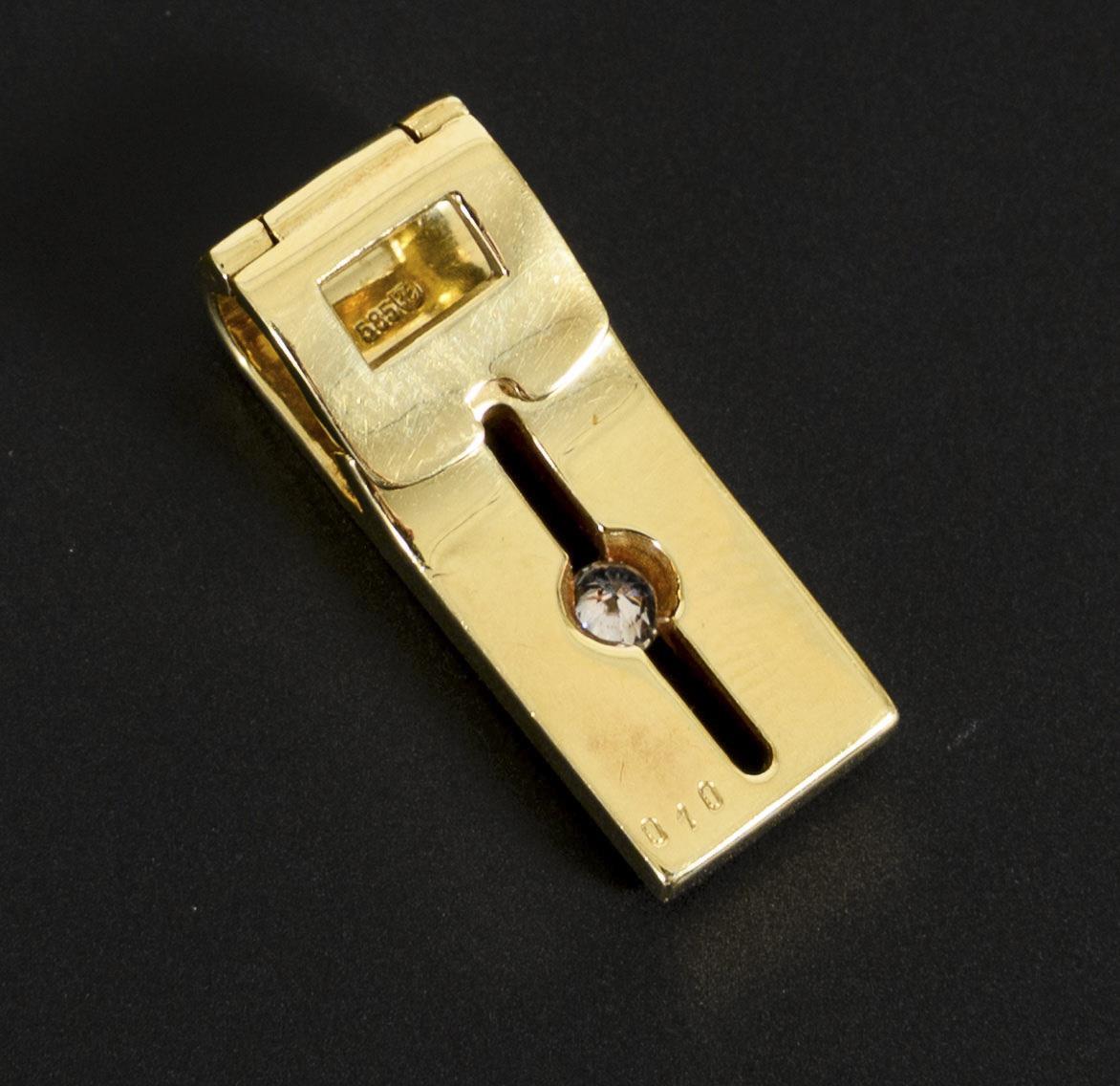 Gelbgold 585 gestempelt. Max. ca. 24,58 x 9,55, der Brillant 010 [0,10 ct] gestempelt. 8,42 g.