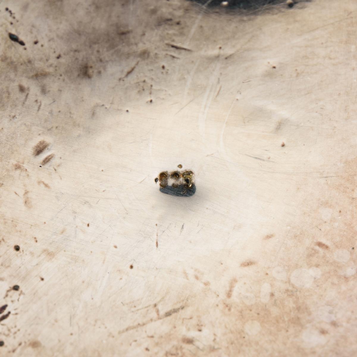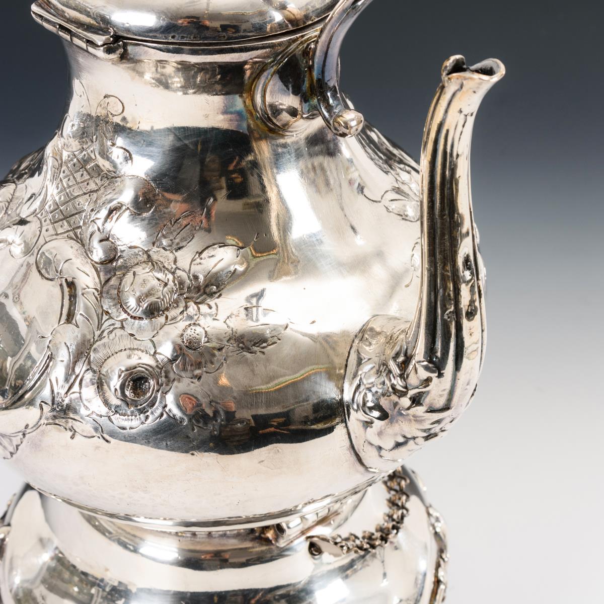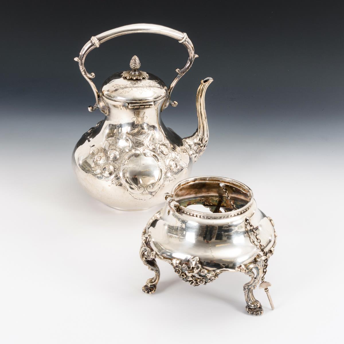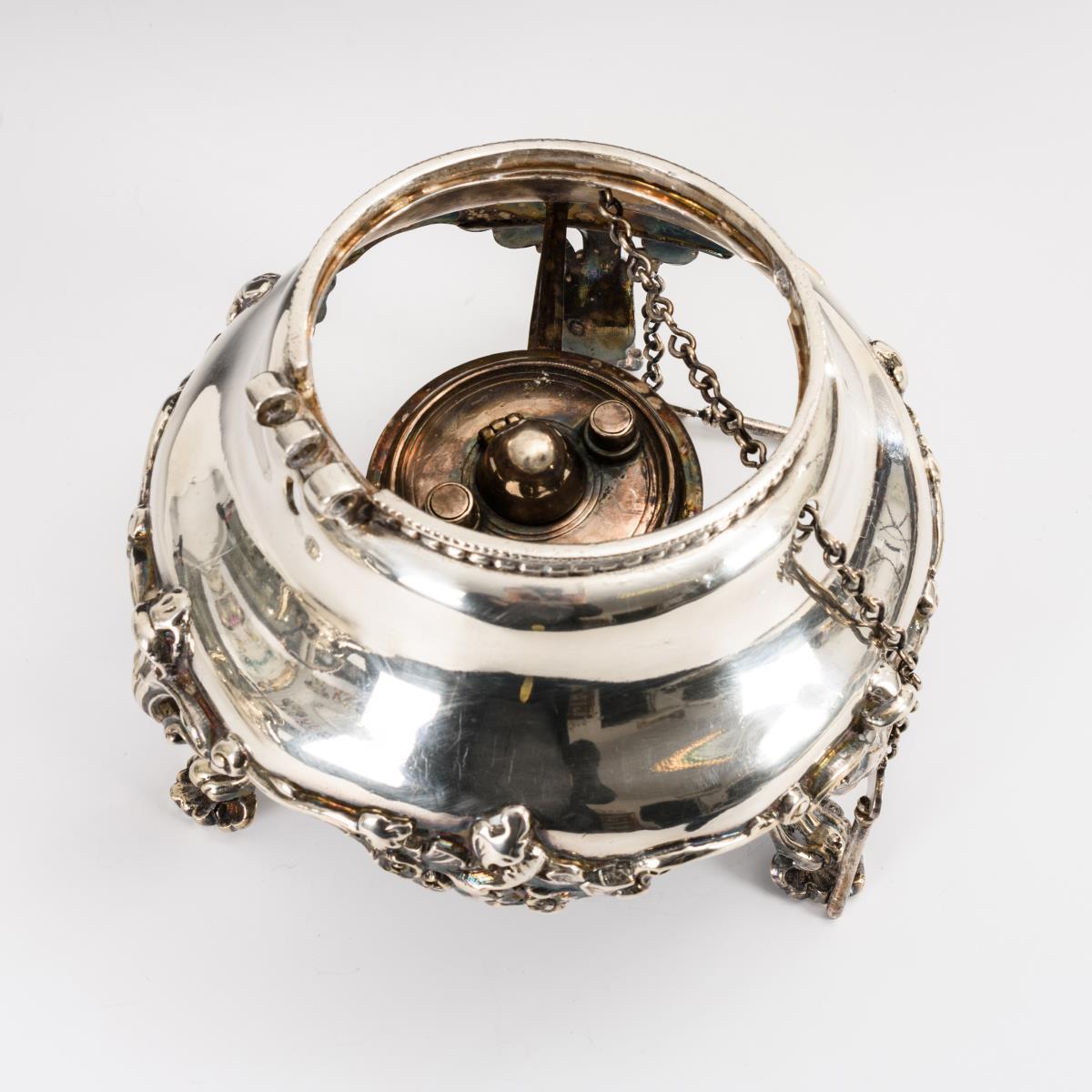 Reich reliefierter, bauchiger Teekessel mit festem Bügelhenkel. Auf versilbertem Rechaud mit Brenner. Dellen, einige alte Lötstellen, silberne Brennerhalterung ergänzt.