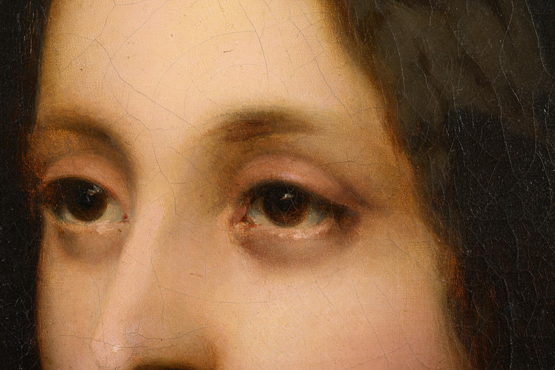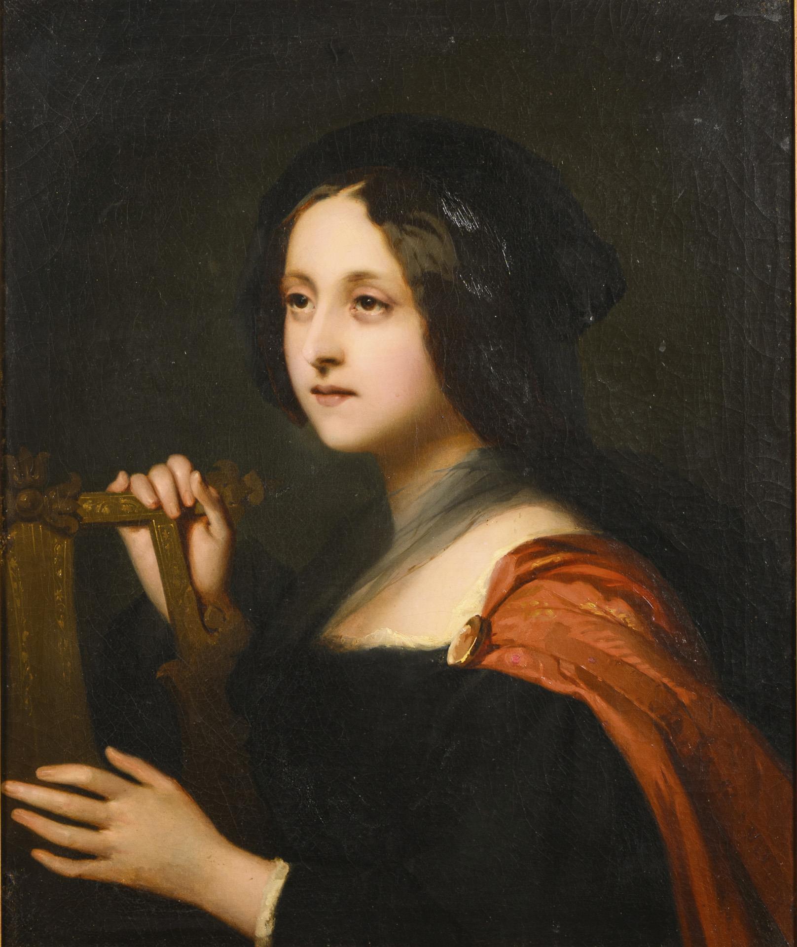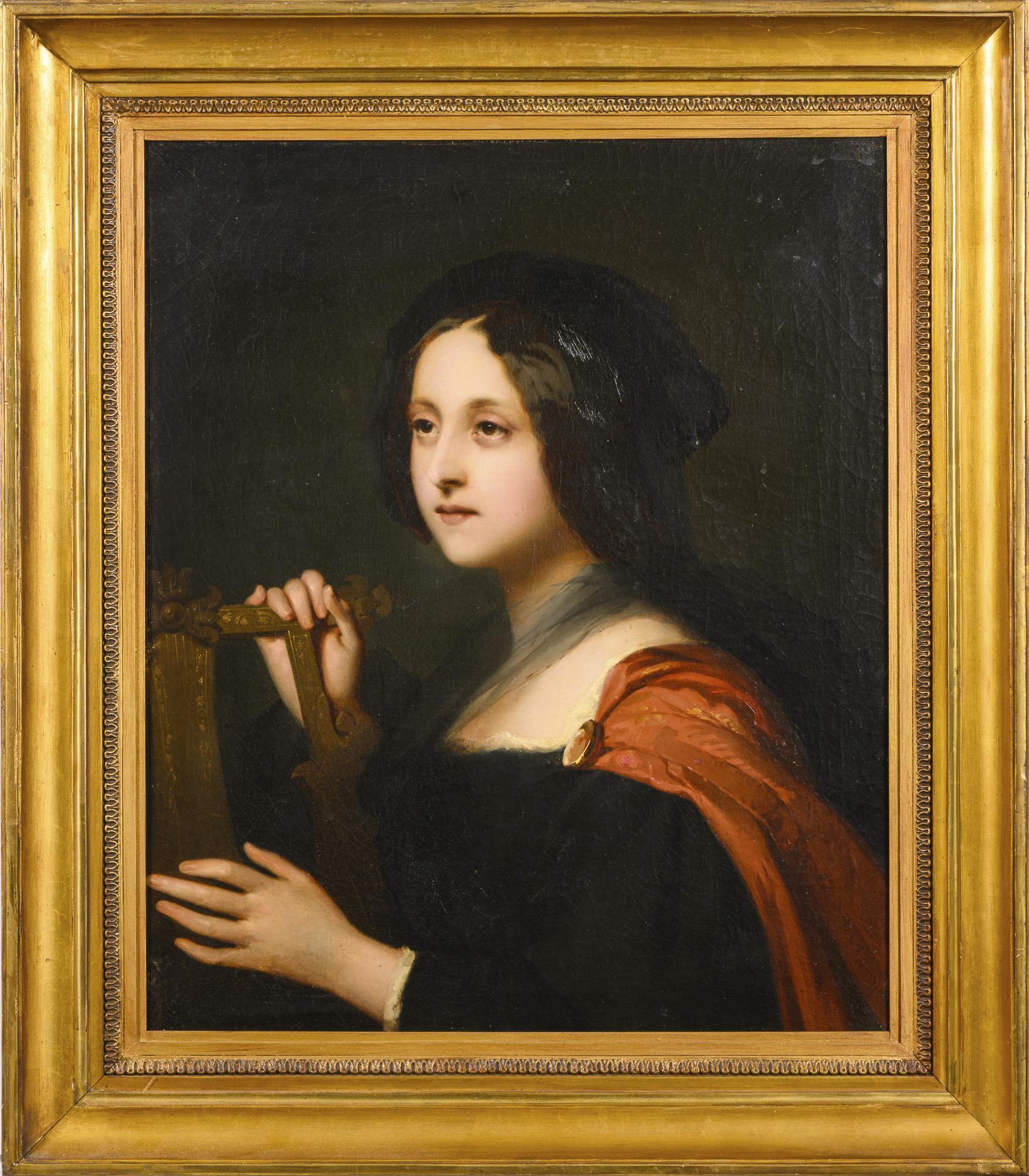 Porträt der dunkelhaarigen Frau im schwarzen Kleid mit rotem Mantel und einer Harfe in den Händen. Eine sehr kleine restaurierte Stelle.