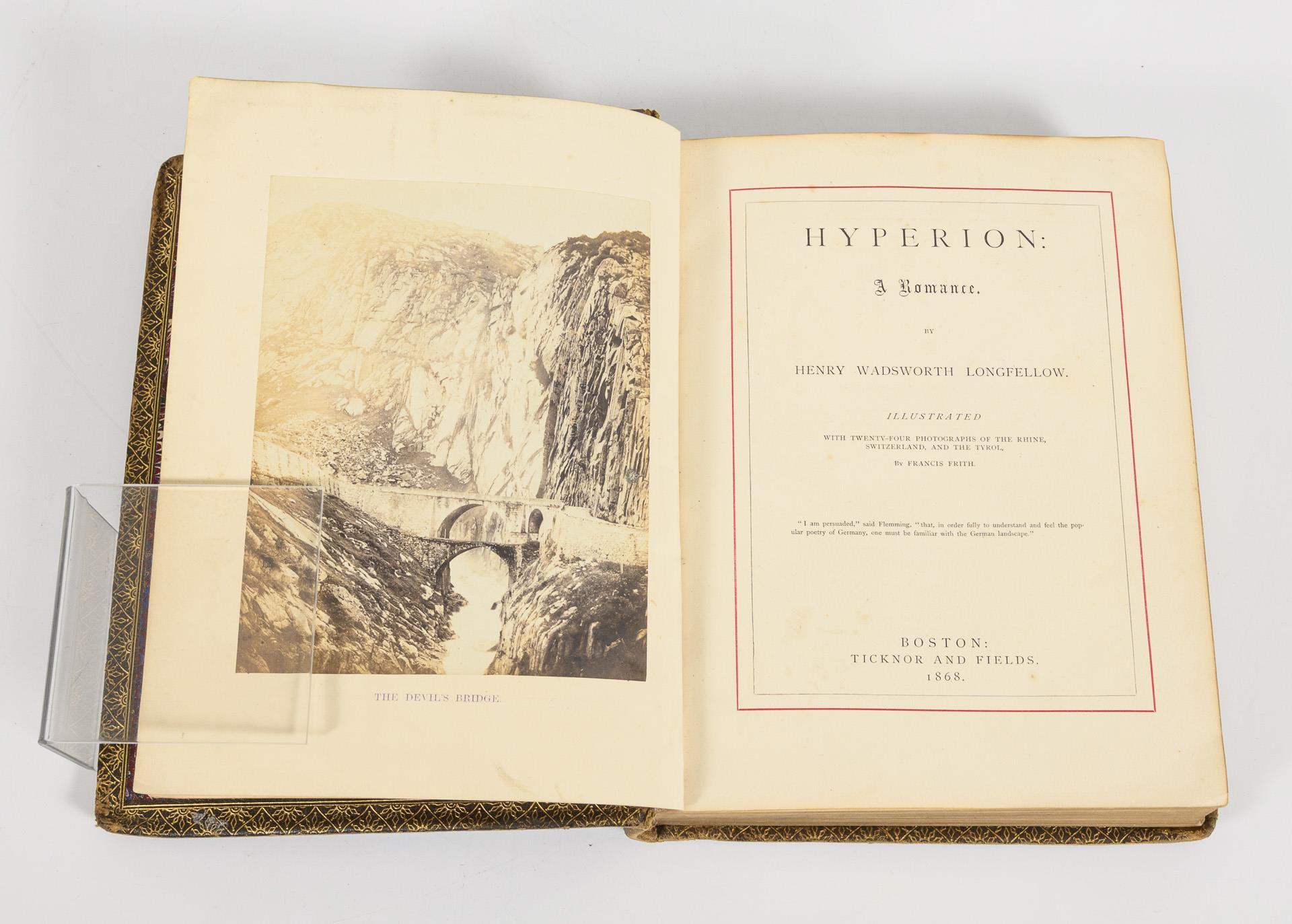 270 Seiten in englischer Sprache, mit 24 frühen Landschaftsfotografien (Albuminabzüge), im geprägten Ledereinband mit Goldschnitt. Die Fotos zeigen: Teufelsbrücke (Frontispiz), Drachenfels, Andernach (2), Stolzenfels, Liebenstein und Sternenfels, Heidelberg (3), Birkenau (2), Neckartal, Rohnegletscher, Meiringen, Interlaken (2), Staubbach, Innsbruck (2), Landeck, St. Gilgen, St. Wolfgang und Stuttgart (2). . Einband abgegriffen, Fotoseiten schwach stockfleckig.