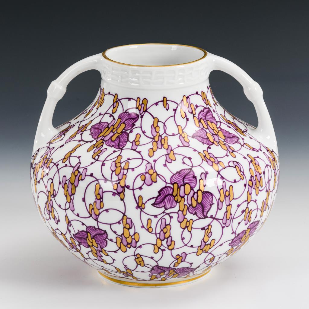 Gedrückt gebauchte Vase mit zwei Henkeln. Bemalt mit stilisiertem Rankenwerk.
