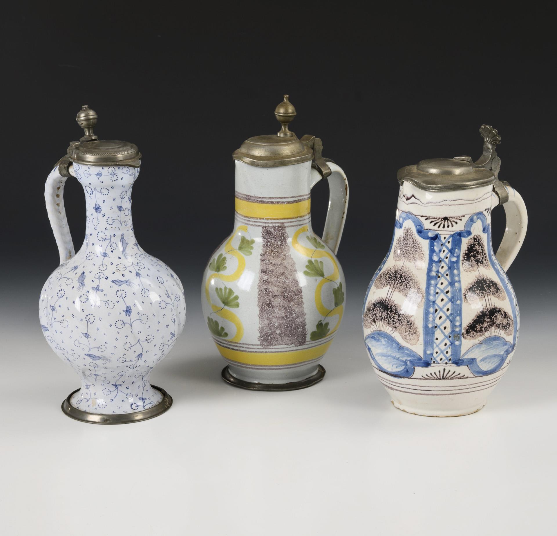 2 Birnkrüge mit Bandhenkel und Pilasterdekor mit stilisierten Blumenranken und Etagenbäumen. 1 Kugelbauchkrug mit Enghals, godronierter Wandung, geflochtenem Henkel, abgesetztem Rundstand und Vögelesdekor. Jeweils mit Zinndeckel, 2x mit Zinnstandring. Teils leichte Randbestoßungen.