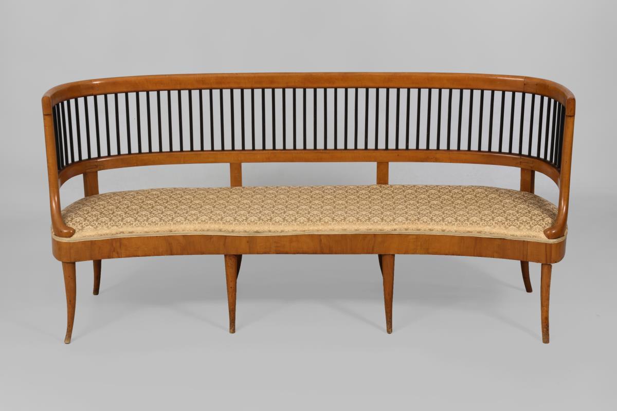 Sitzbank und 2 Stühle im Design-Jugendstil mit ebonisierter Lehnenverstrebung und konischen, leicht ausgestellten Beinen; Sitzbank mit champagnerfarbenem Bezug und kleinteiligem Floralmuster, Stühle mit gestreiftem champagnerfarbenem Bezug. Alters-/Gebrauchsspuren, Furnier teils mit Ergänzungen, inaktiver Anobienbefall.