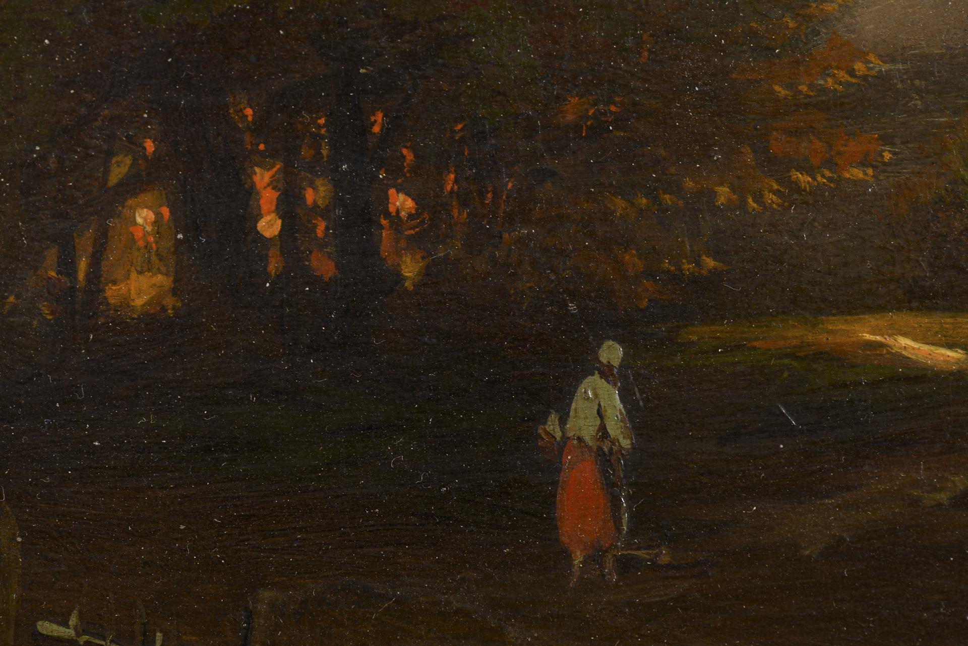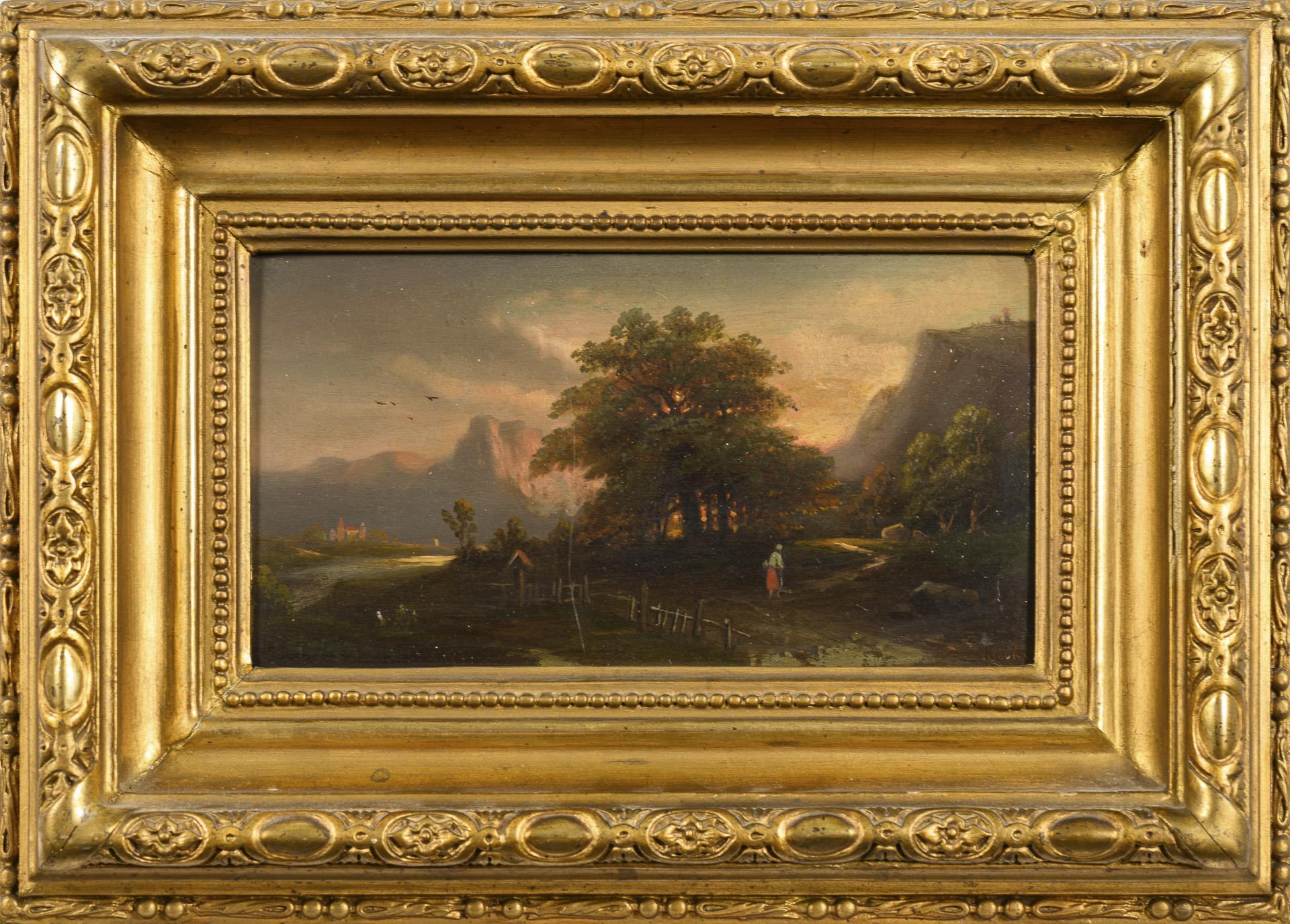 Staffagefigur am Abend nahe dem Dorf im Gebirge. Kratzer.