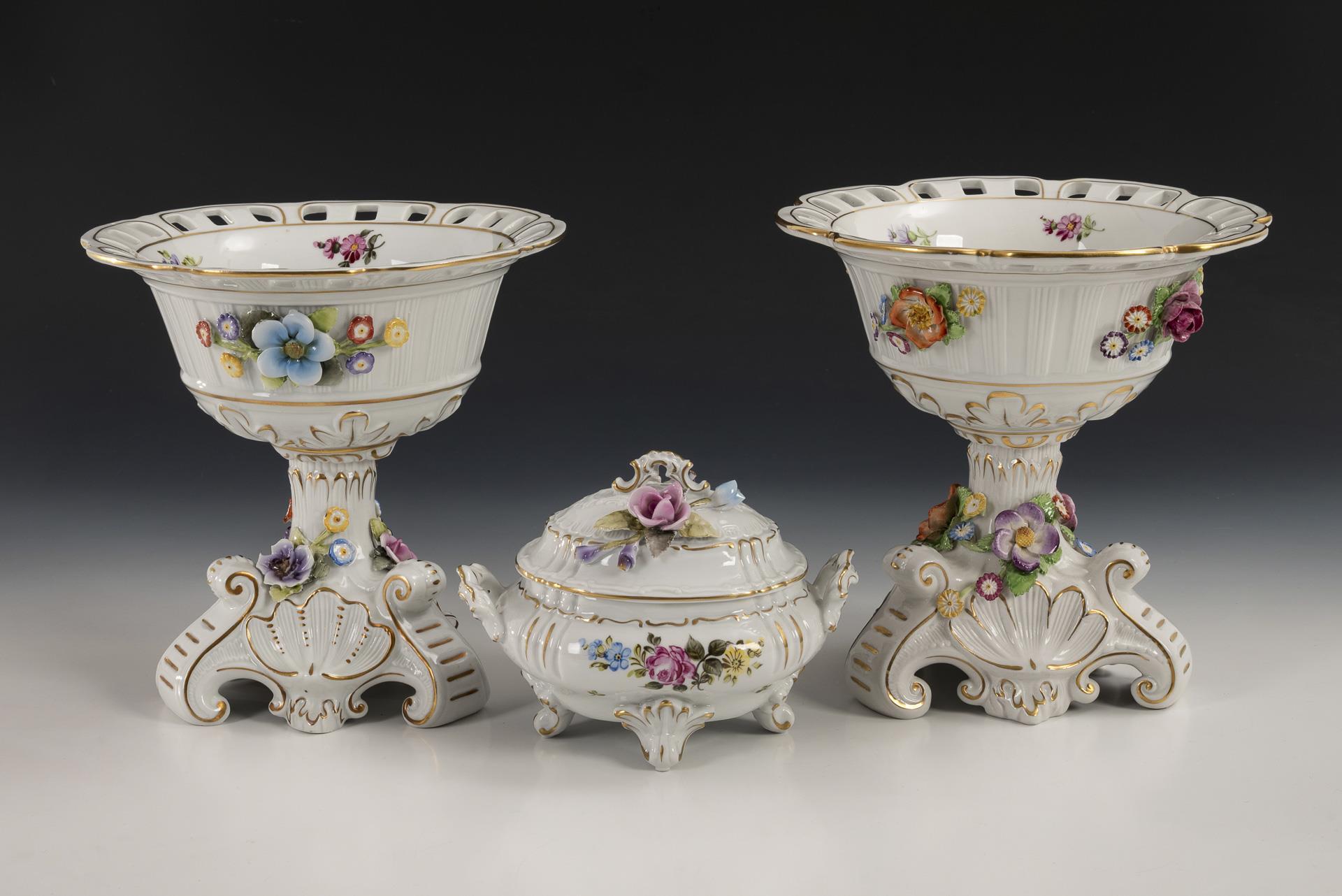 Polychrom bemalt, goldstaffiert. Paar Fußschalen (H 20,5 cm), Rocailledose (H 12 cm).