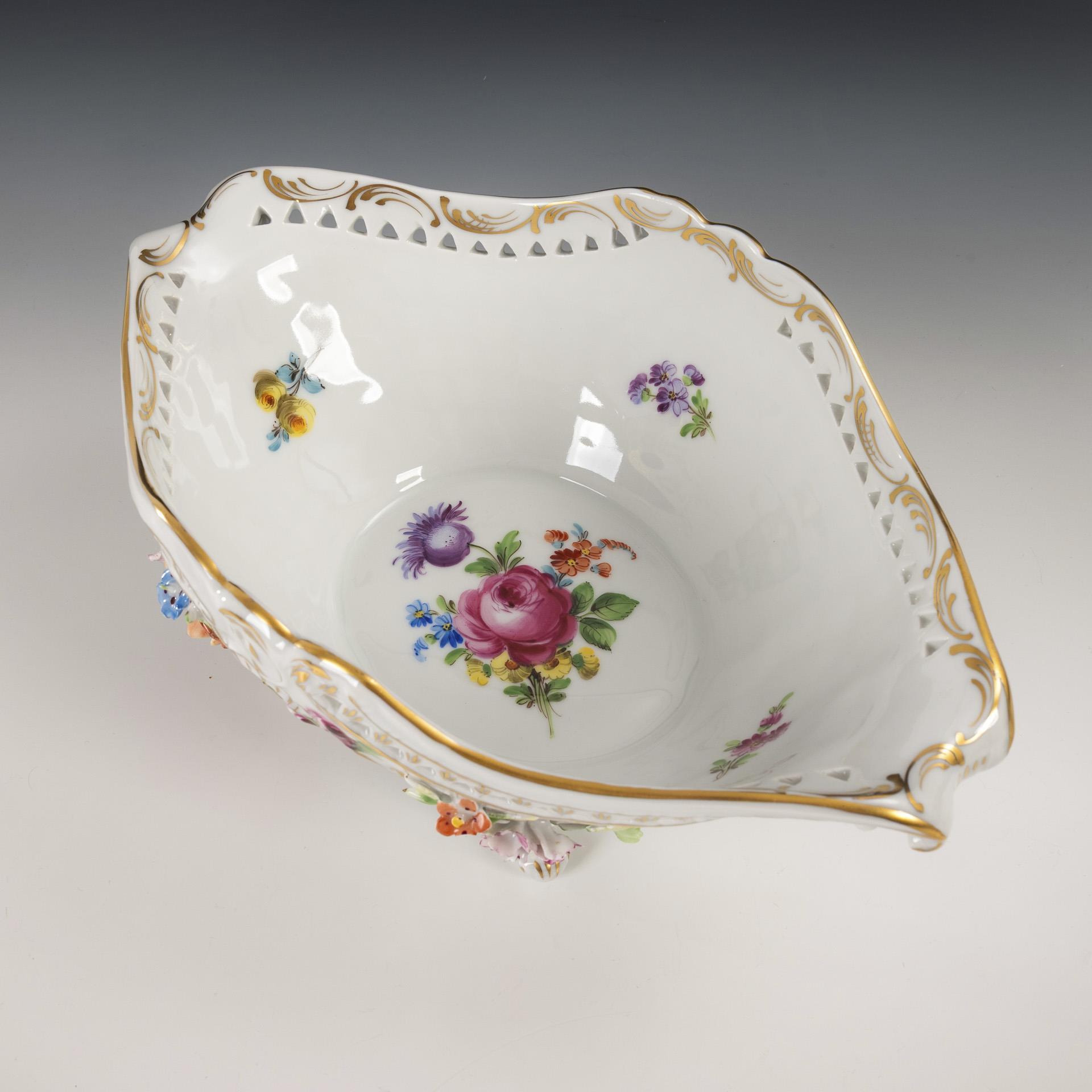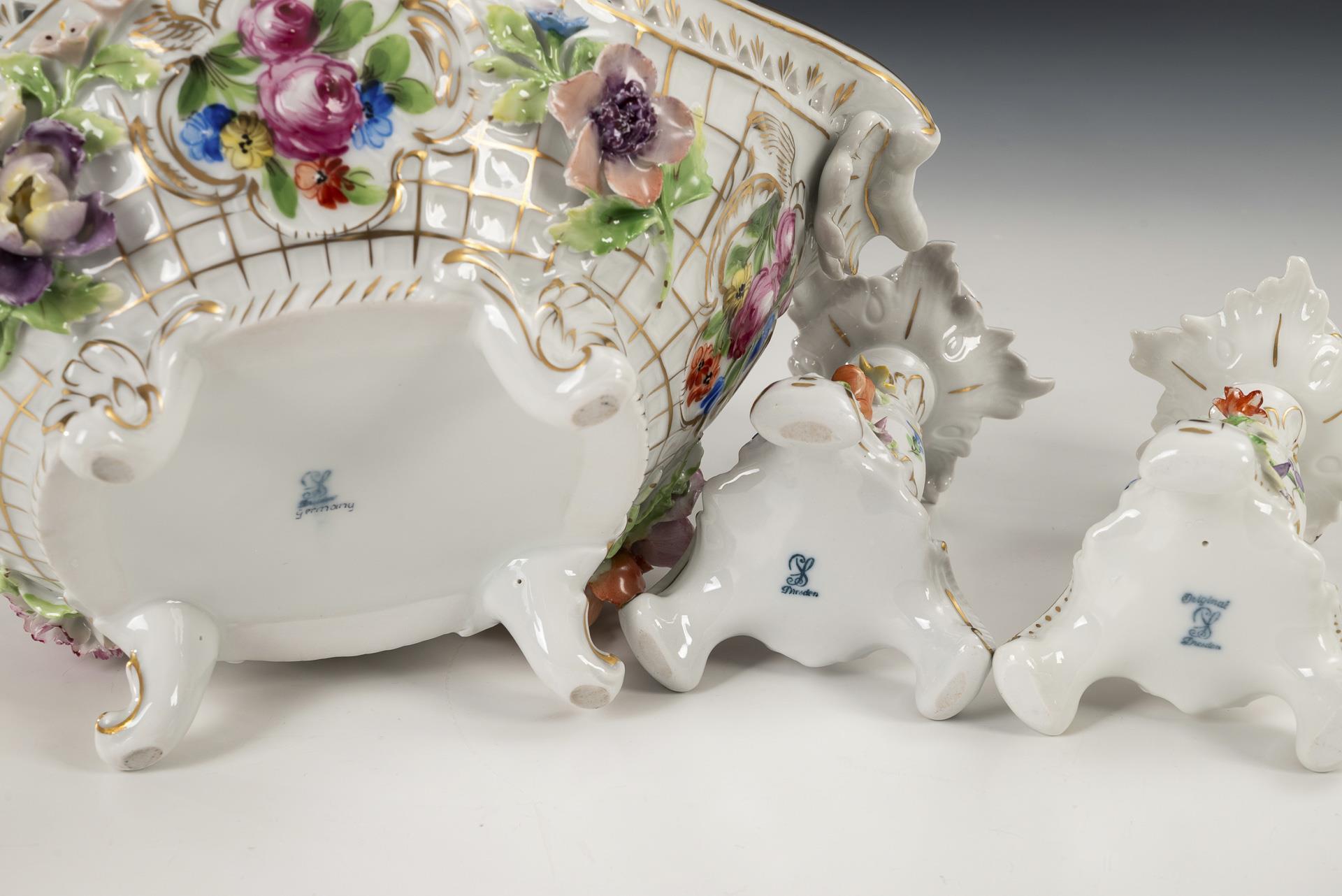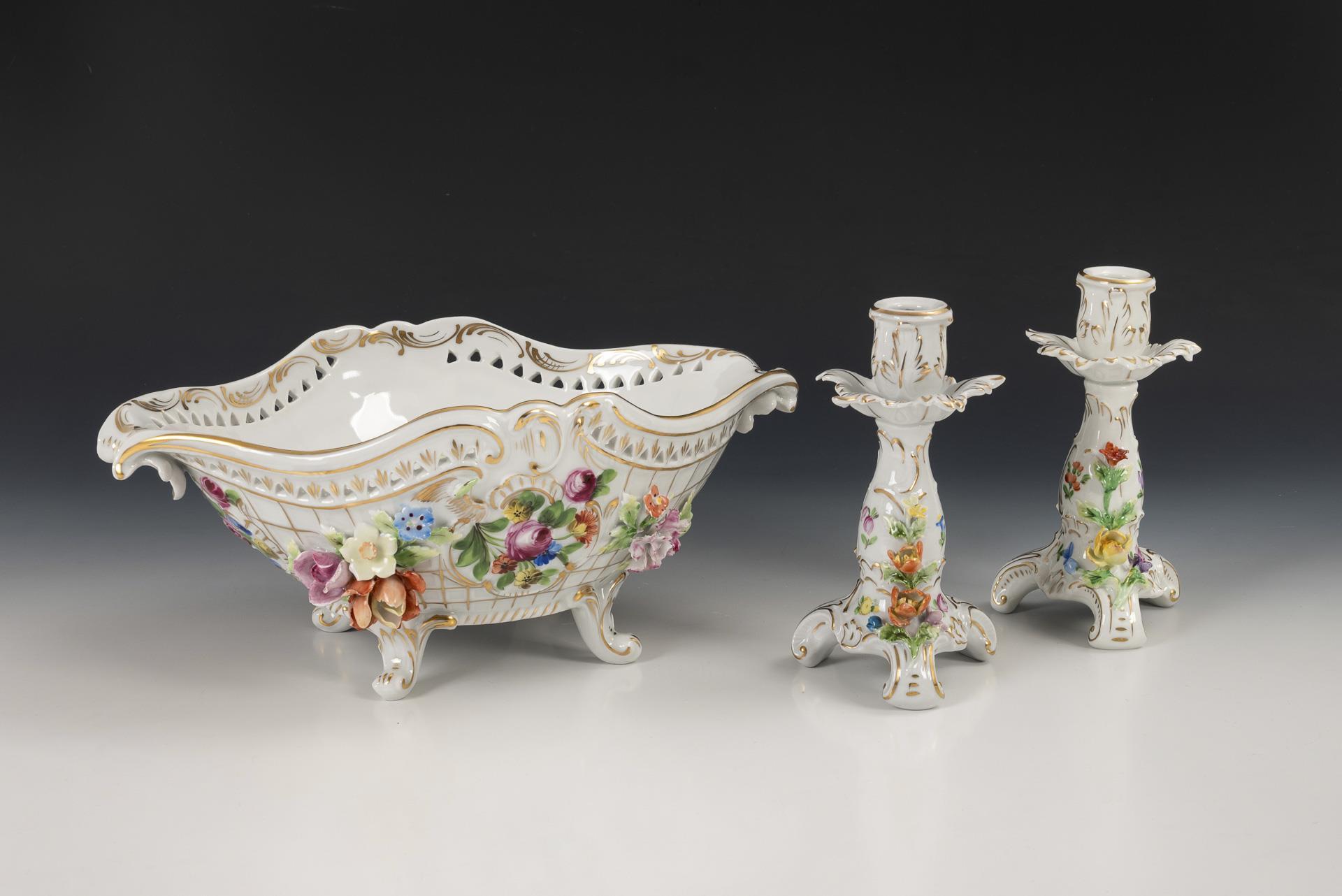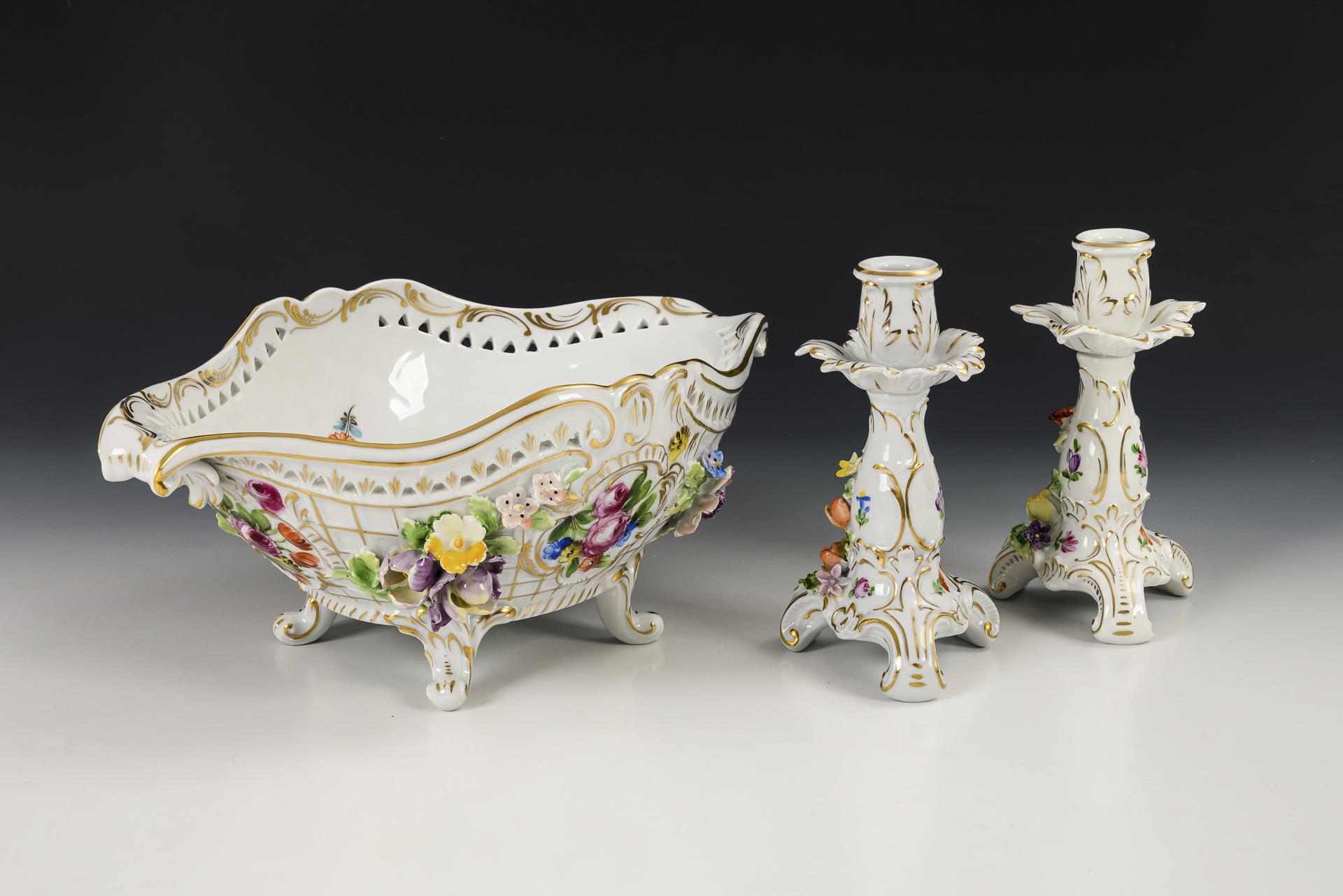 Polychrom bemalt, goldstaffiert. Schale (H 13,5 cm, L 30,5 cm), 2 Tischleuchter (H 16 cm).