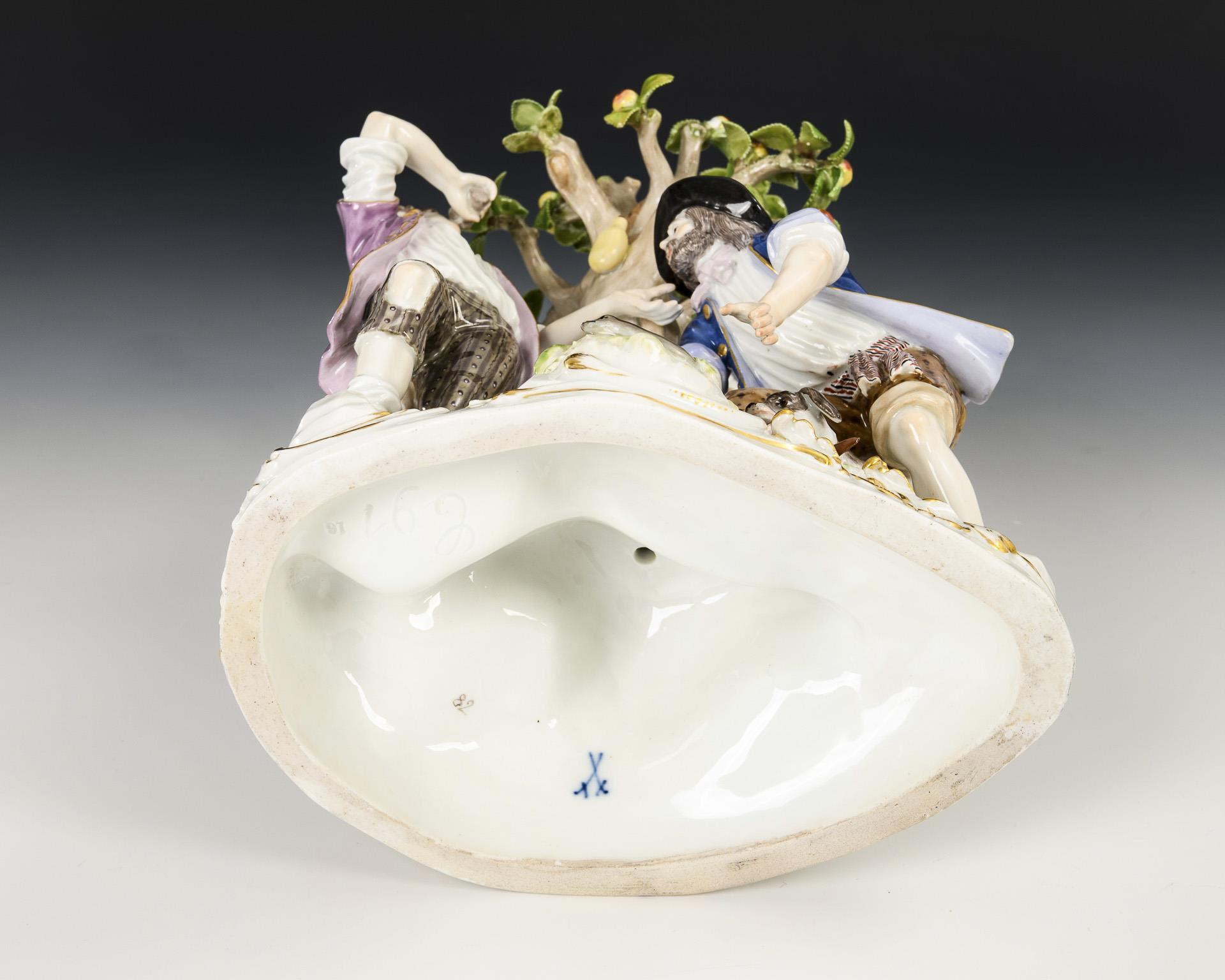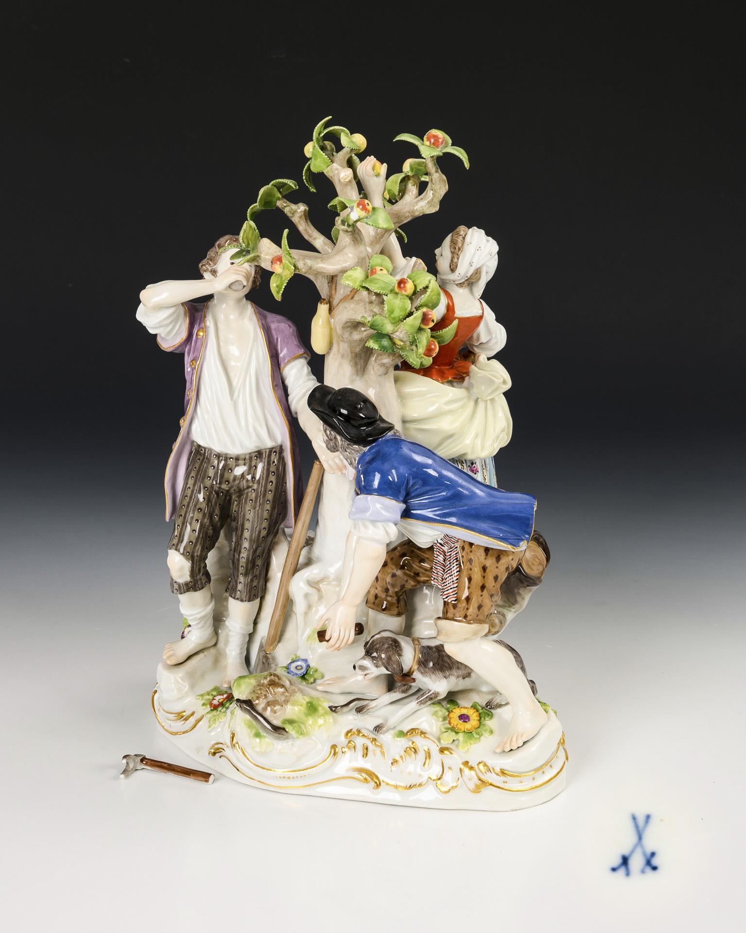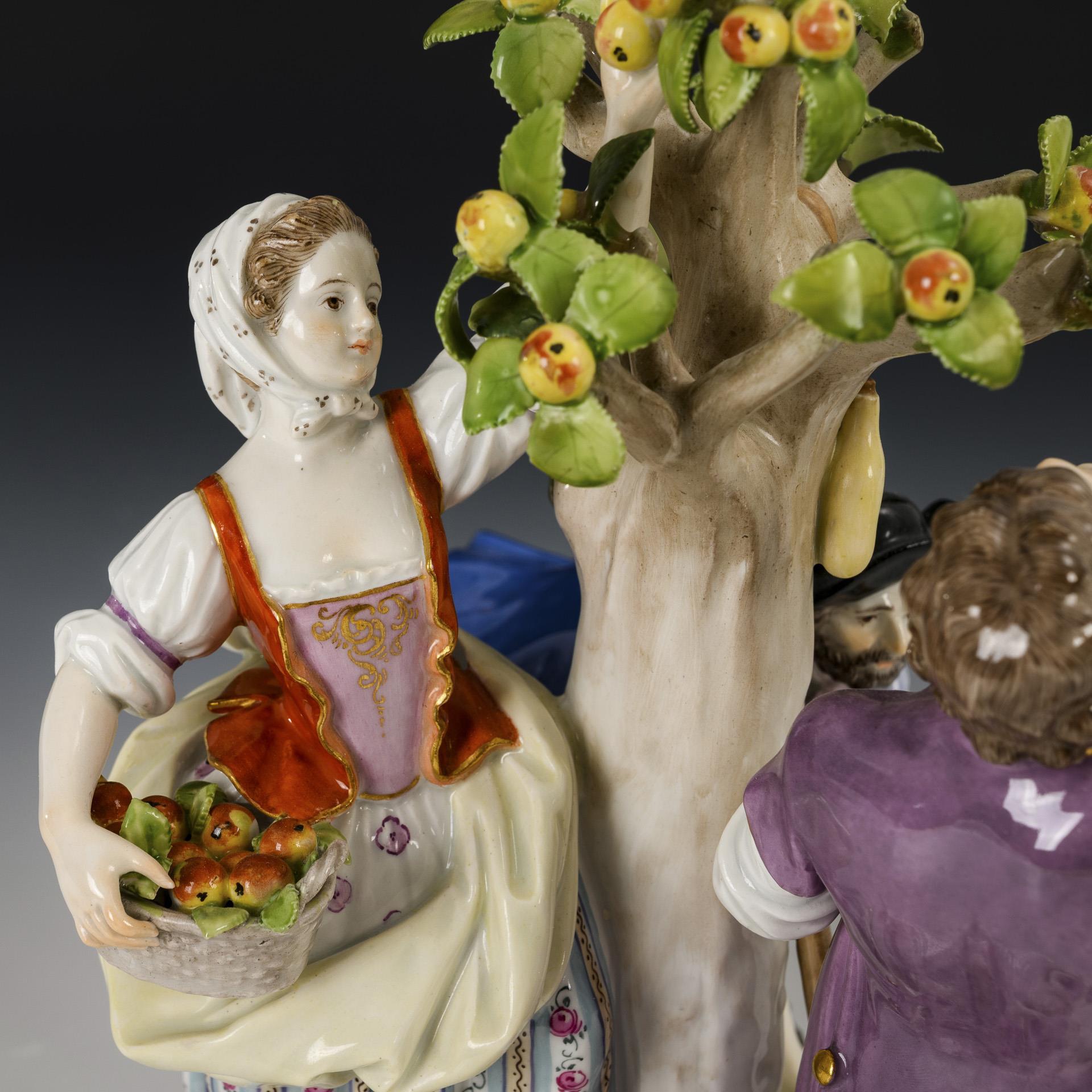 Drei an einem Apfelbaum stehende Figuren, die Frau Äpfel pflückend, der Gärtner mit Spaten aus einem Becher trinkend und ein Gärtner mit Hund, den Boden mit einer Hacke bearbeitend. Hacke abgebrochen (Lose anbei), Sockelrand verso, 1 Schafkopf, Blätter, Äpfel und Äste überwiegend restauriert, linker Arm des Gärtner mit Hacke restauriert.