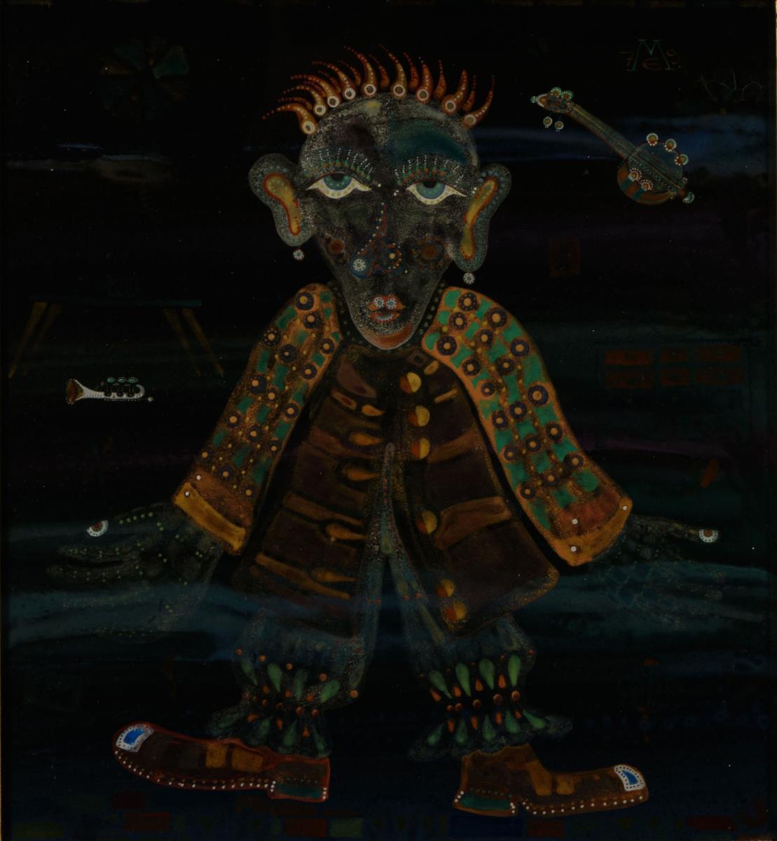 Darstellung zweier abstrakter Figuren mit Musikinstrumenten.