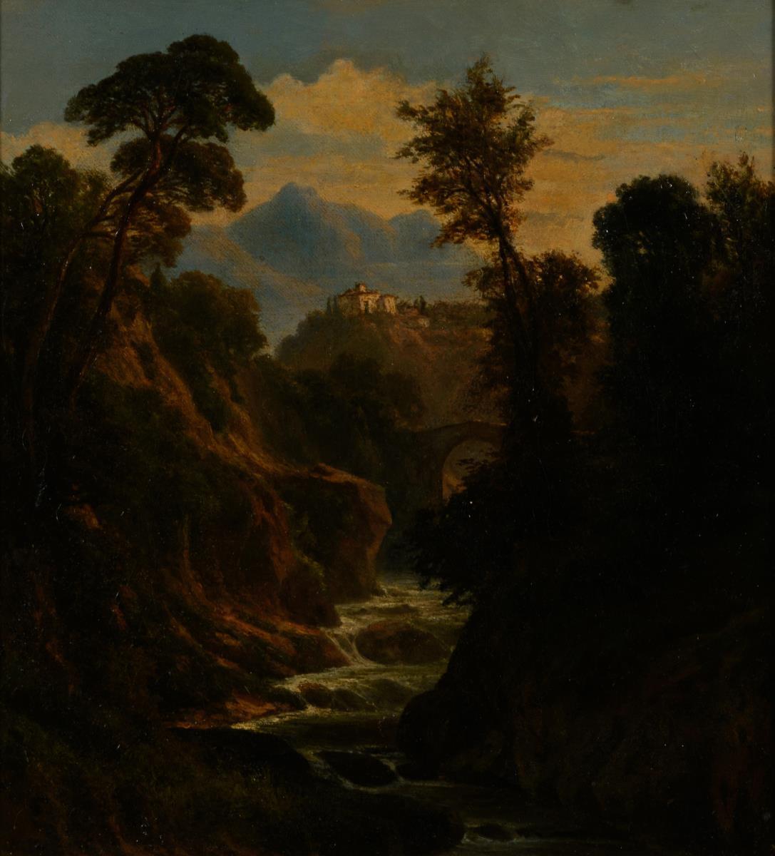 Romantische Gebirgslandschaft mit Bogenbrücke und Villa im idyllischen Licht. Leichte Altersspuren.