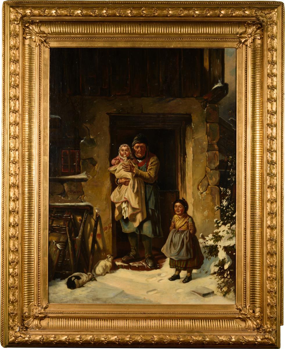 Vater mit den beiden erstaunt in die Natur blickenden Kindern vor der Haustür im Neuschnee. Leinwand doubliert.