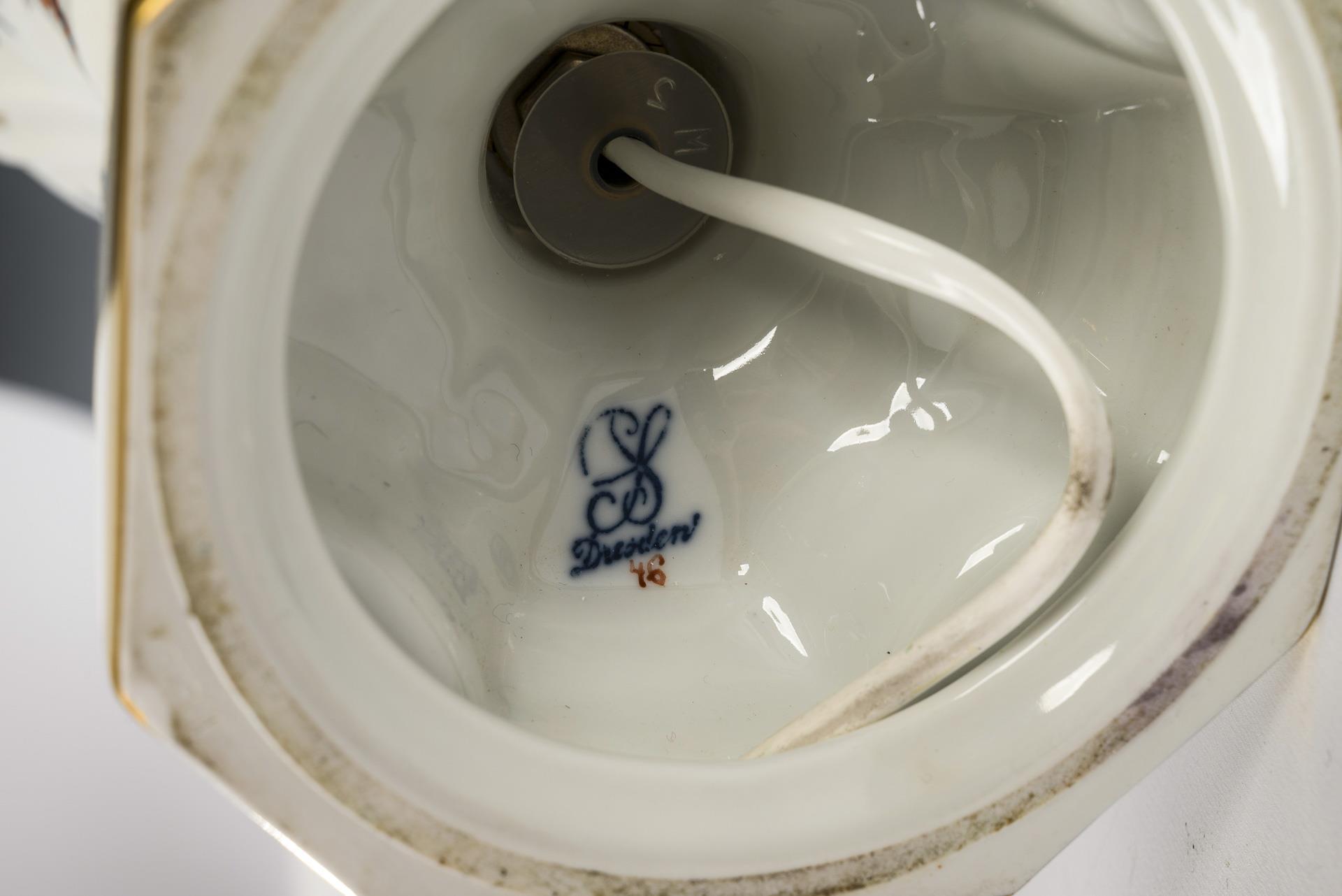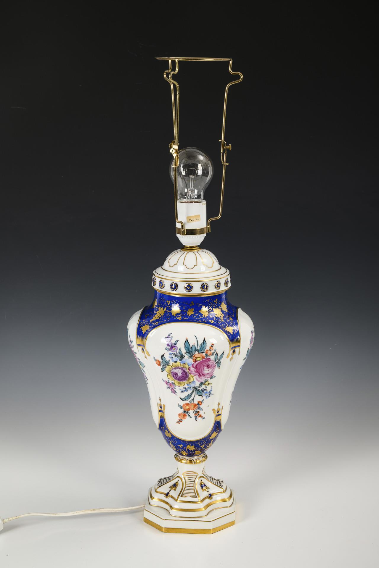 Balusterlampenfuß auf oktogonaler Plinthe, mit goldener Weinlaubmalerei auf königsblauem Teilfond, allseitig die Darstellung eines Blumenbuketts. Weißer, originaler Stoffschirm. Elektrifiziert (Funktion nicht geprüft).