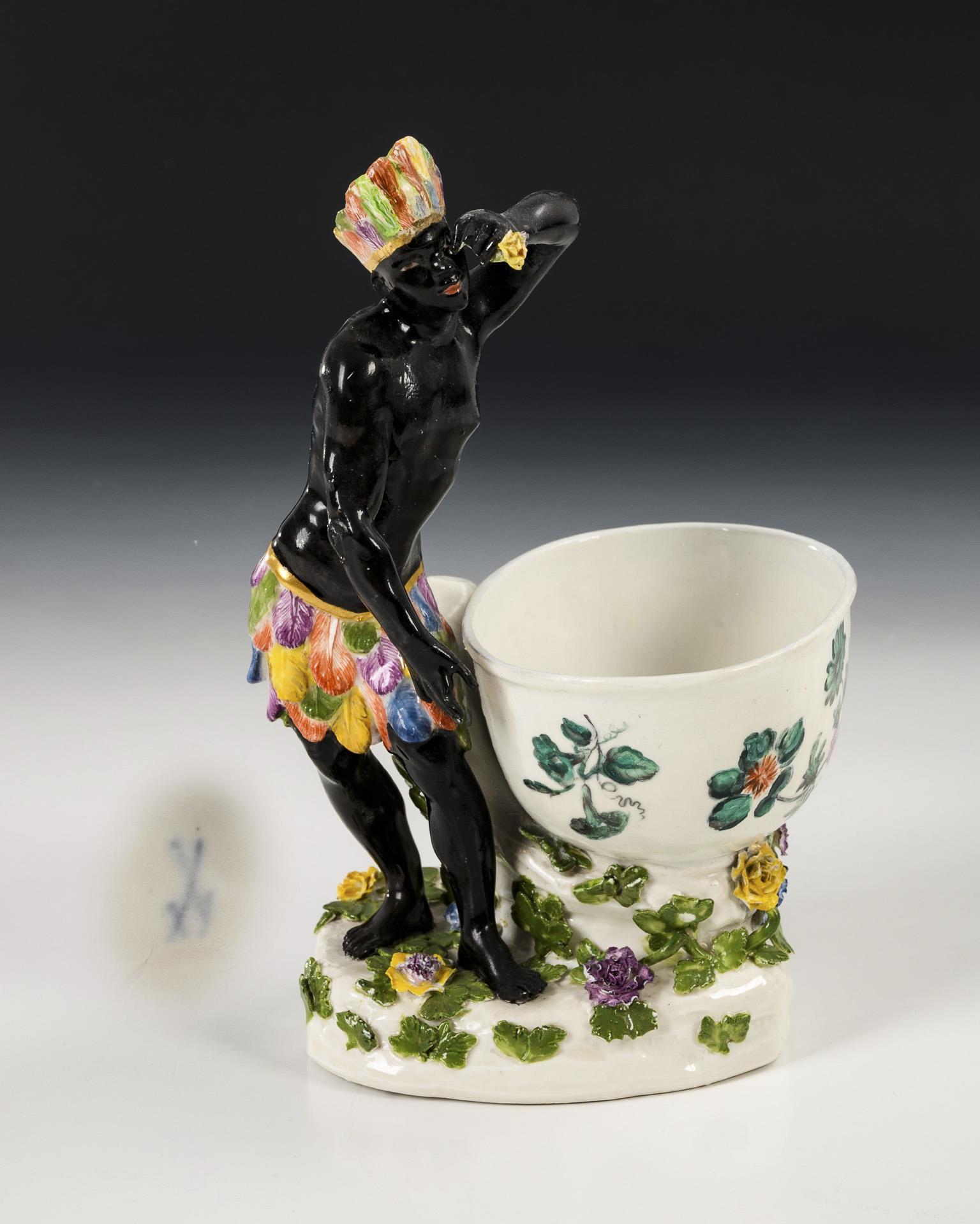 An einer Dose (Deckel fehlt) mit Blumenmalerei stehender farbiger Mann mit Federschmuck, blütenbelegter Sockel. Schale, linkes Bein, linker Arm und Kopf der Figur restauriert.