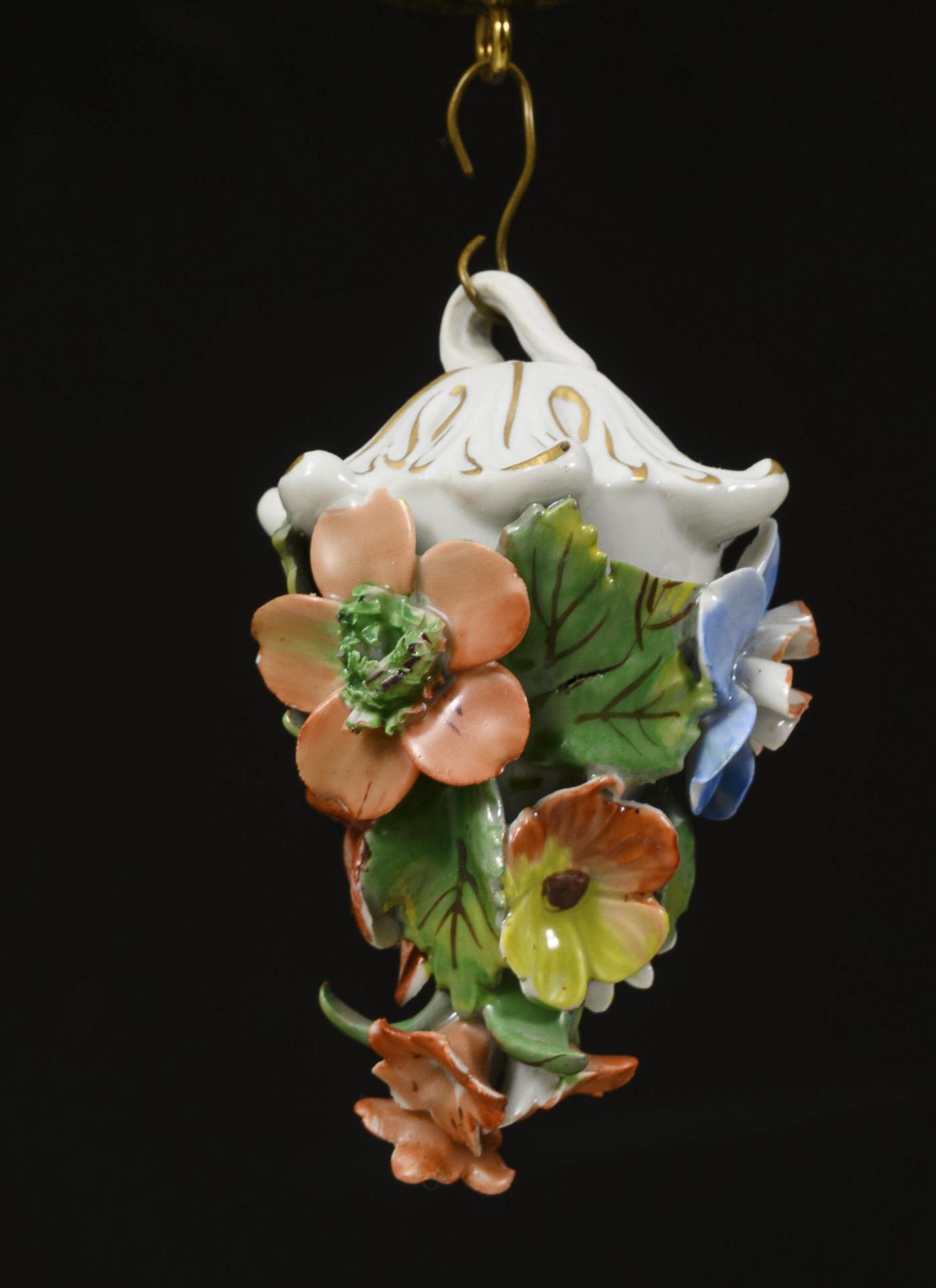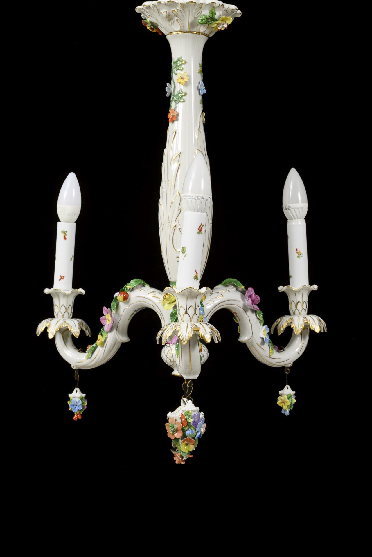 3-armiger, blütenbelegter Leuchter mit Akanthusblatt- und Grillagerelief, 4 Abhängungen sowie elektrischen Tüllen. Haarriss in einem Kerzenzylinder, Ausbruch an einem Kerzenzylinder, 1 Blüte defekt.