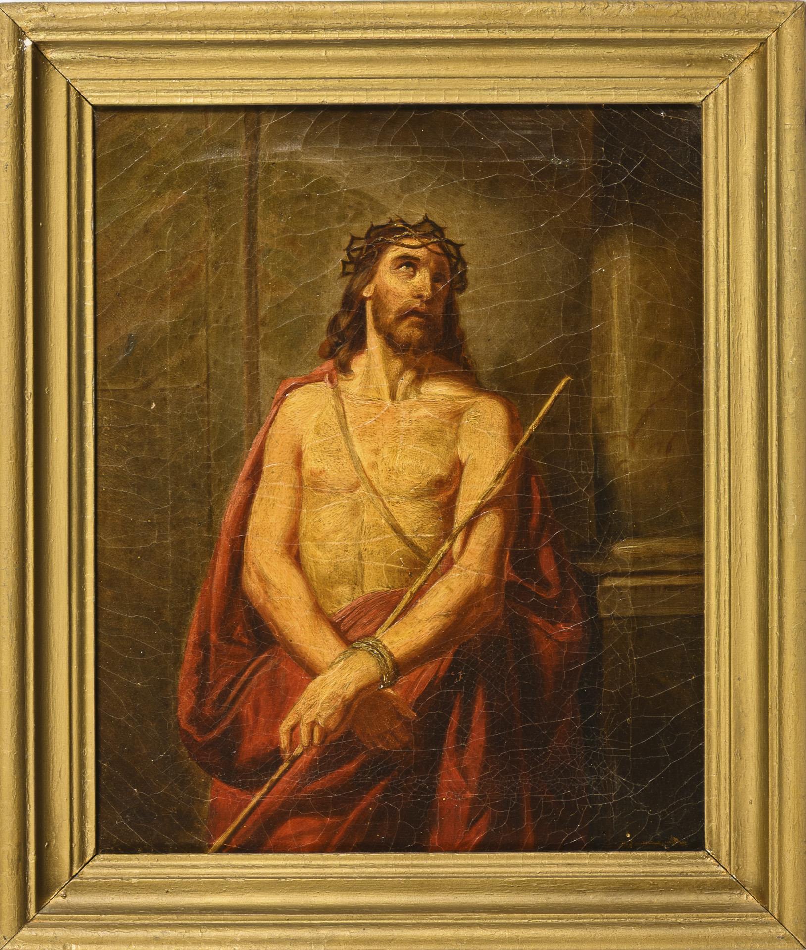 Jesus in Fesseln mit Dornenkrone und rotem Mantel und nach oben gerichtetem Blick. Altersspuren.