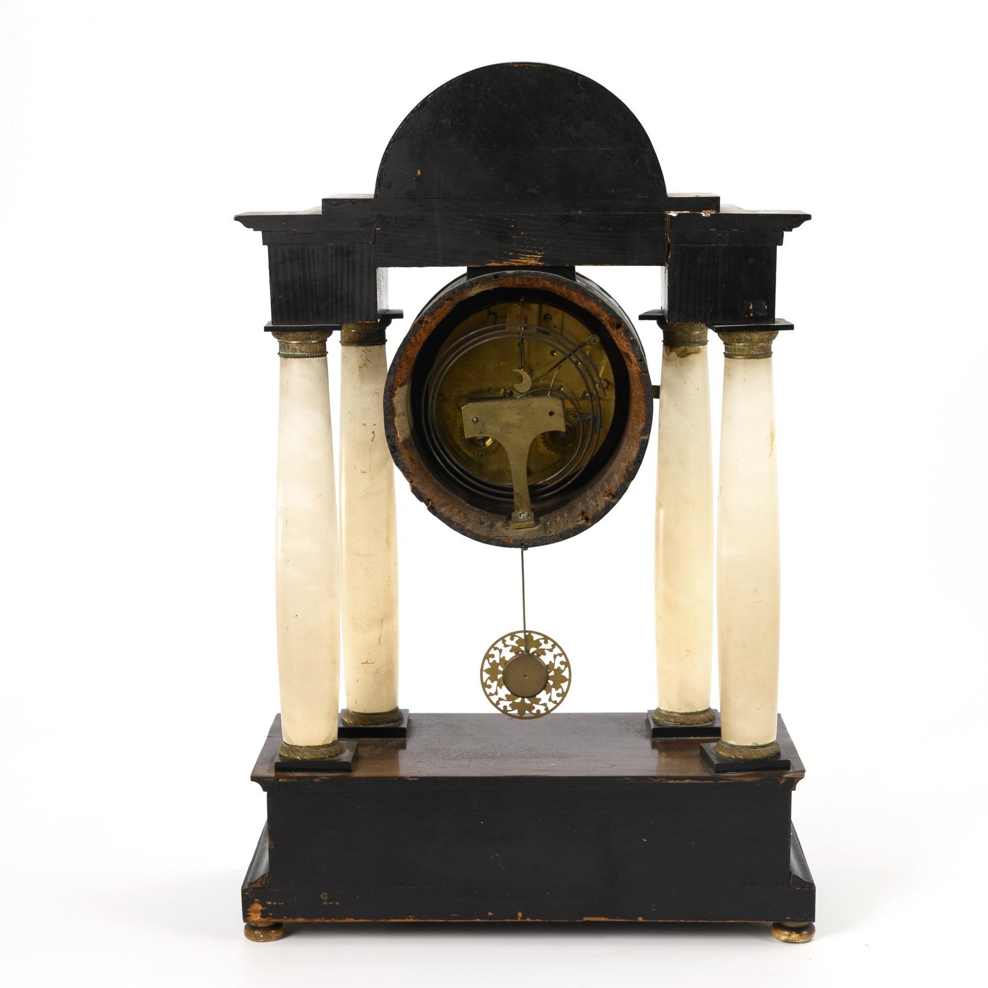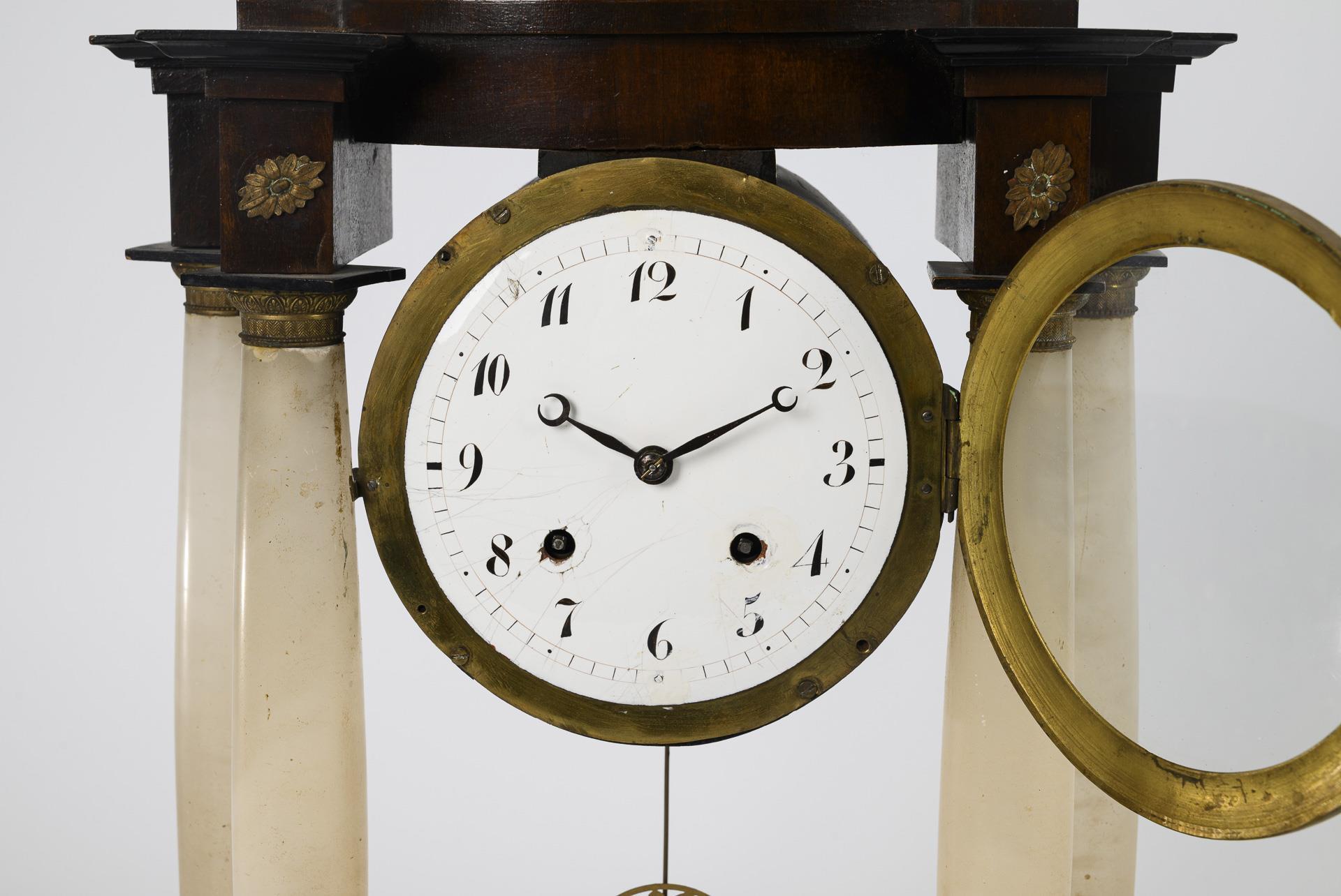 Klassizistische Portaluhr mit Rundbogengiebel, 4 Alabastersäulen und schlichtem Stufensockel, auf 4 Scheibenfüßchen. Messingbeschläge mit Blumen und Füllhörnern. Alters- und Gebrauchsspuren, Defekte, Bekrönungen fehlend. Restaurierung empfohlen.