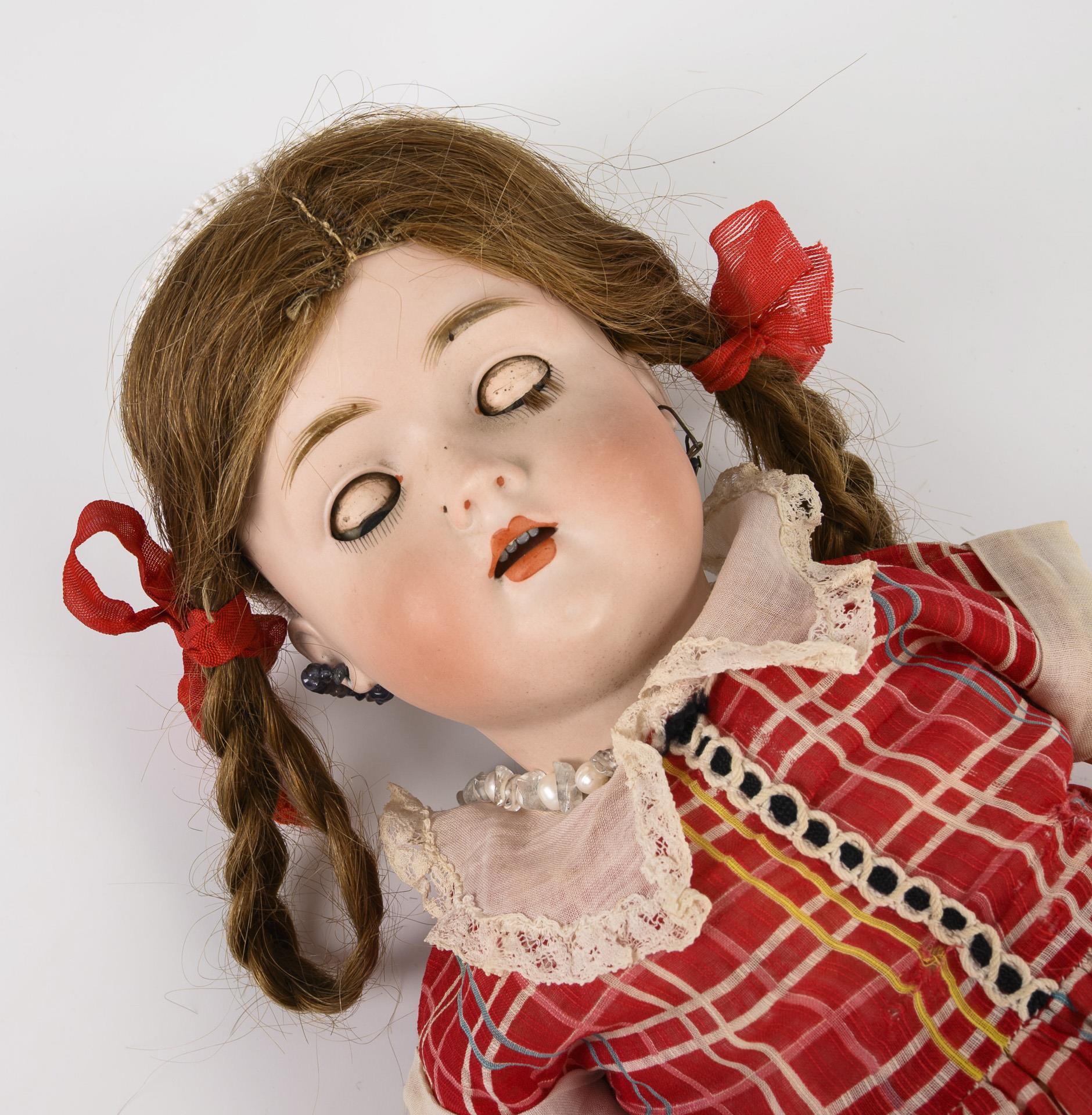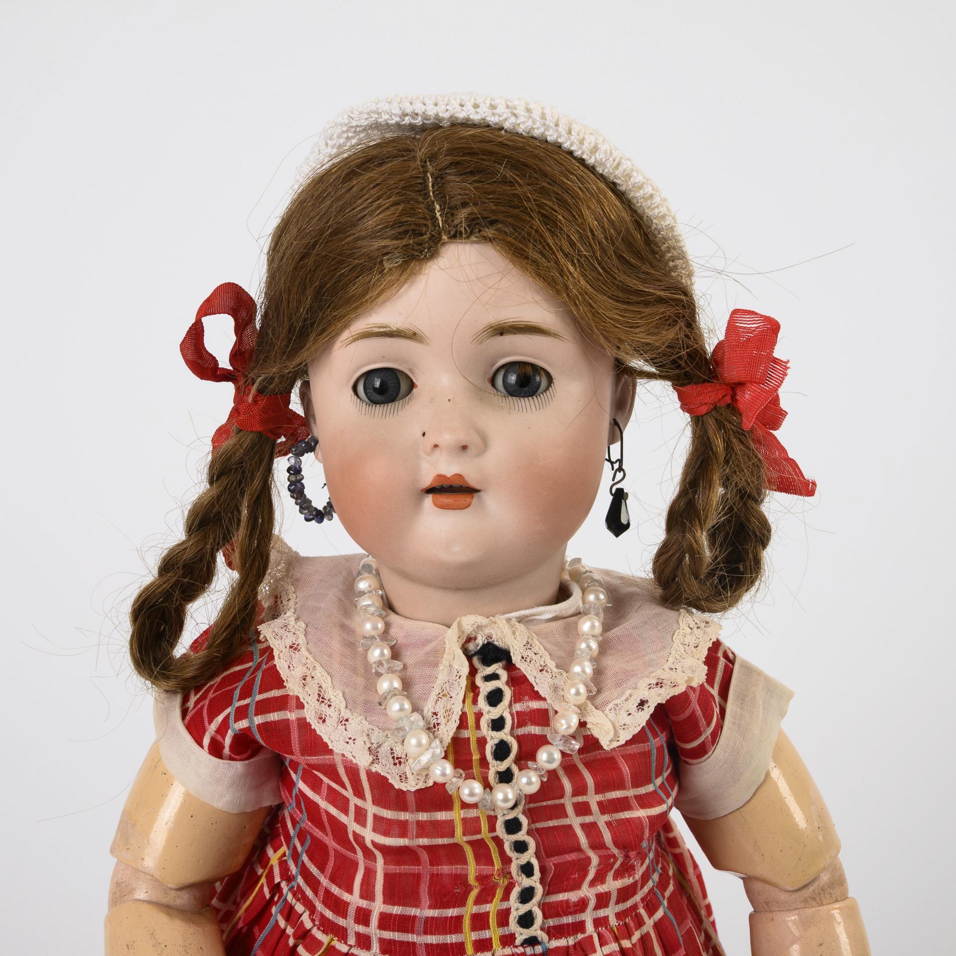 Kurbelkopf, blaue Schlafaugen, modellierte Augenbrauen, Ohrringe, braune Echthaarperücke mit Affenschaukeln. 15-teiliger Gliederkörper. Rot-kariertes Kleid mit weißem Spitzenkragen, weiße Häkelmütze, weiße Lederschuhe. Am Hinterkopf herstellungsbedingte "Naht" (kein Riss!), Kopfkrone und Ohrläppchen mit kleinen Chips. Torso übermalt.