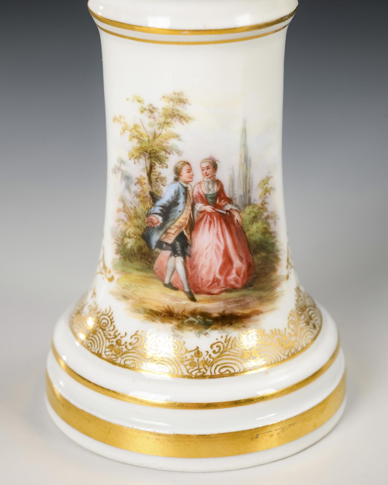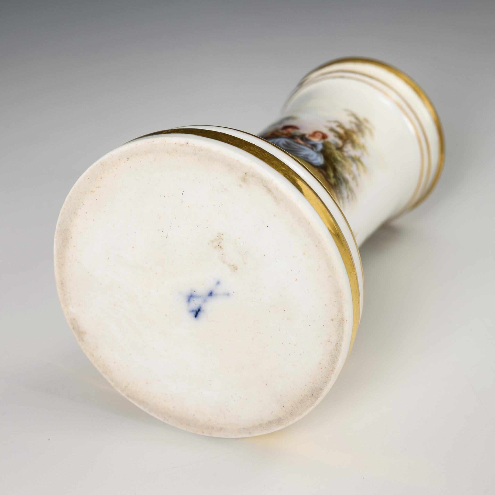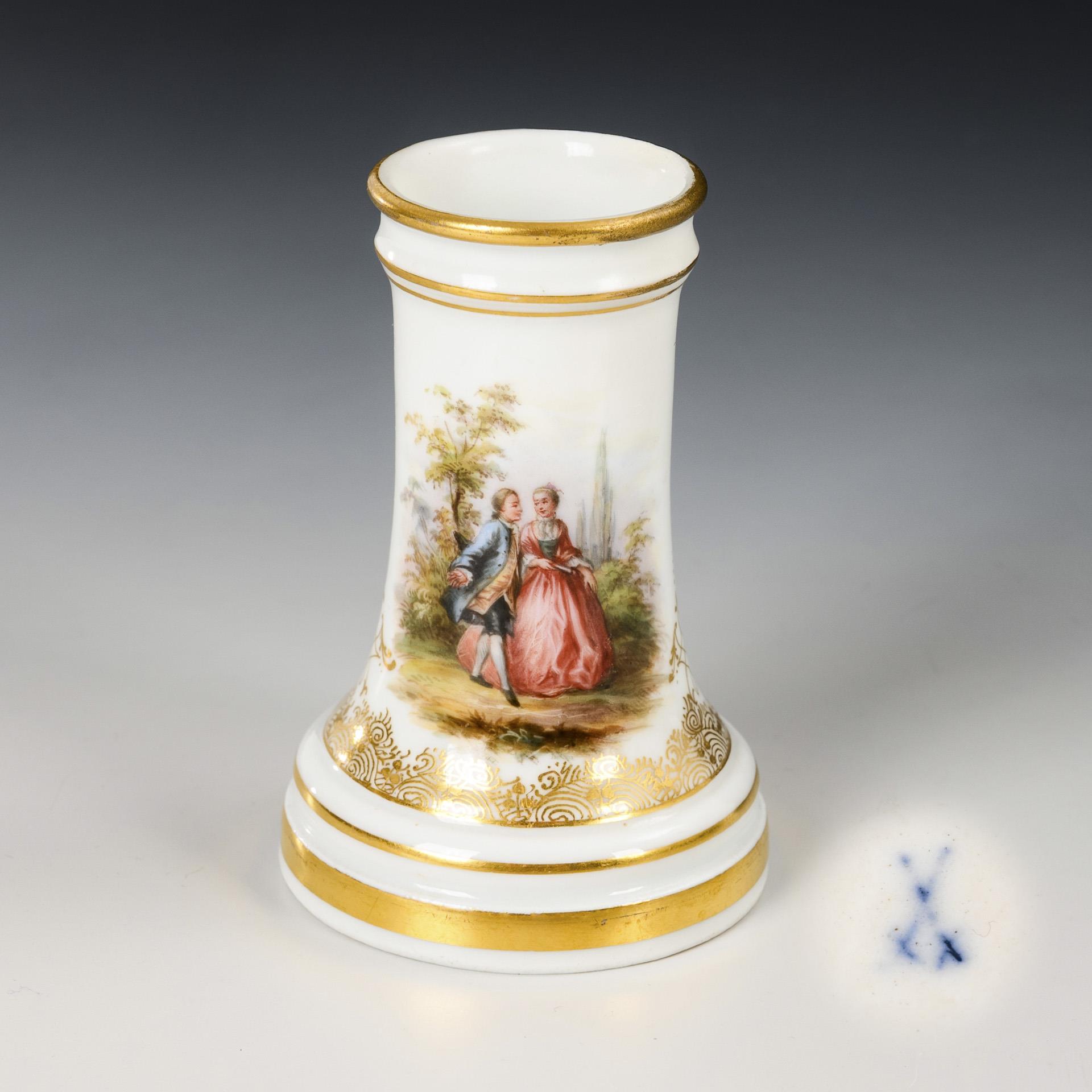 Vase in Form eines Säulenstumpfes. Über einer Goldspitzenbordüre zwei kleine Parklandschaften mit galanten Paaren. Rand restauriert.