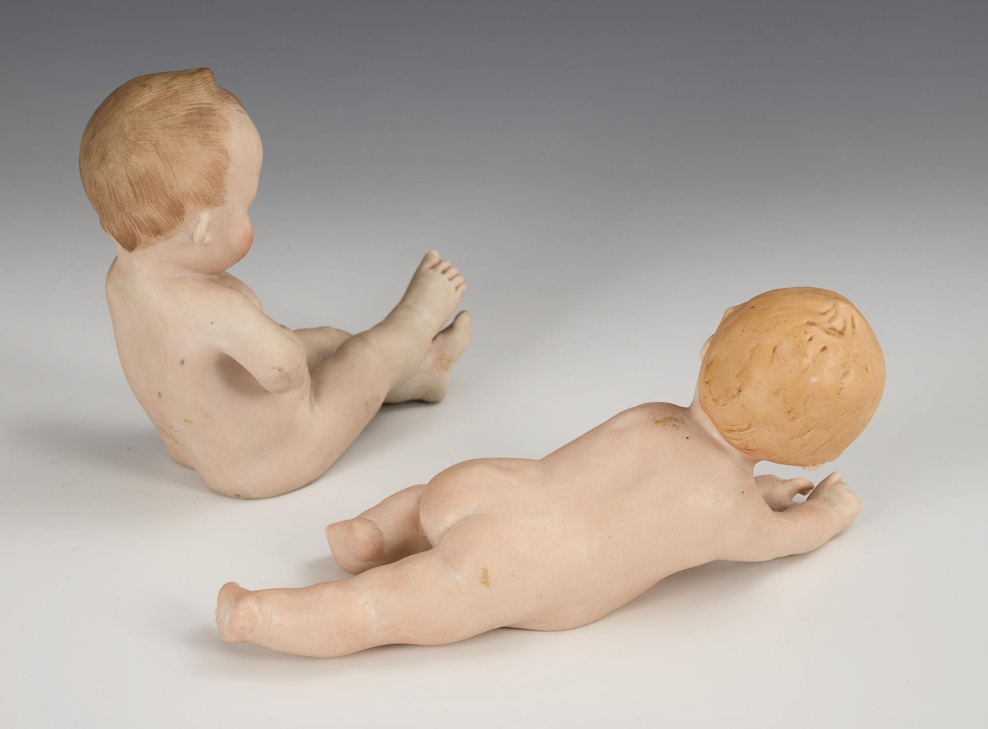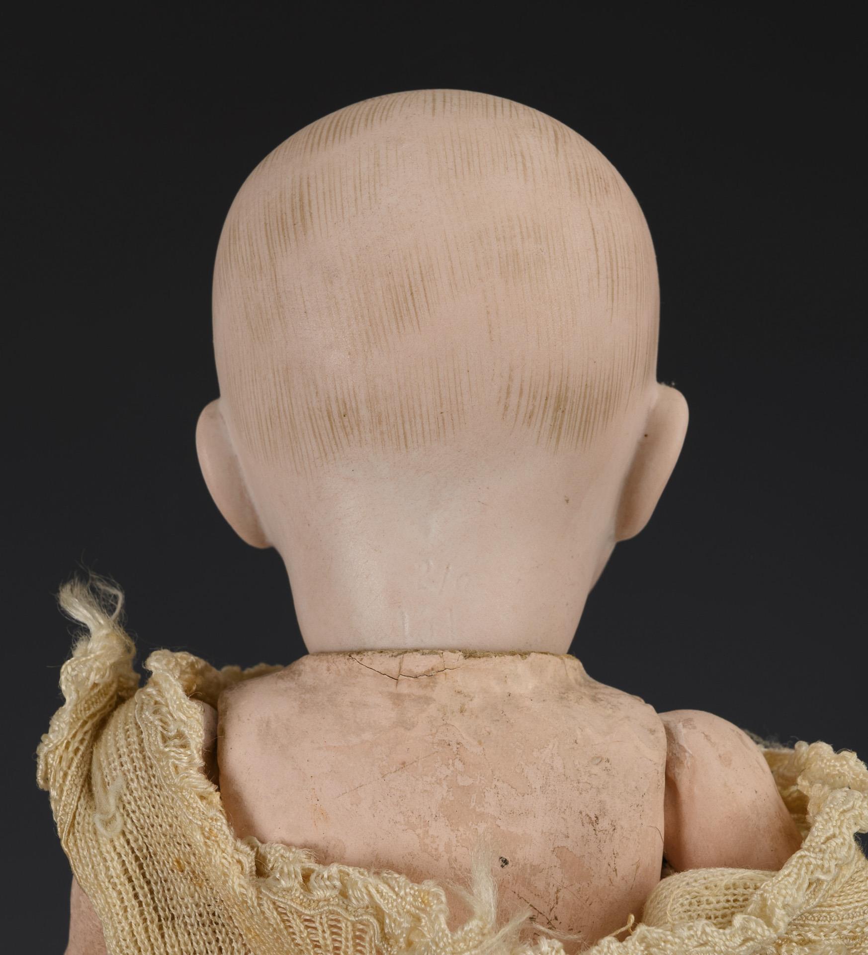 Vollkopf-Baby (Hertel, Schwab & Co) mit gemalten Augen, 5-teiligem Sitzbabykörper und hellem Strickhemdchen. Kleine Chips an der Halskurbel, Finger etwas berieben. L 23 cm. / Sitzendes Aktionsbaby (ungemarkt) mit modellierter Stirnlocke. H 12 cm. / Liegendes Aktionsbaby (F & W Goebel) mit gemalten blauen Schielaugen. 1 Zeh bestoßen. H 8 cm.