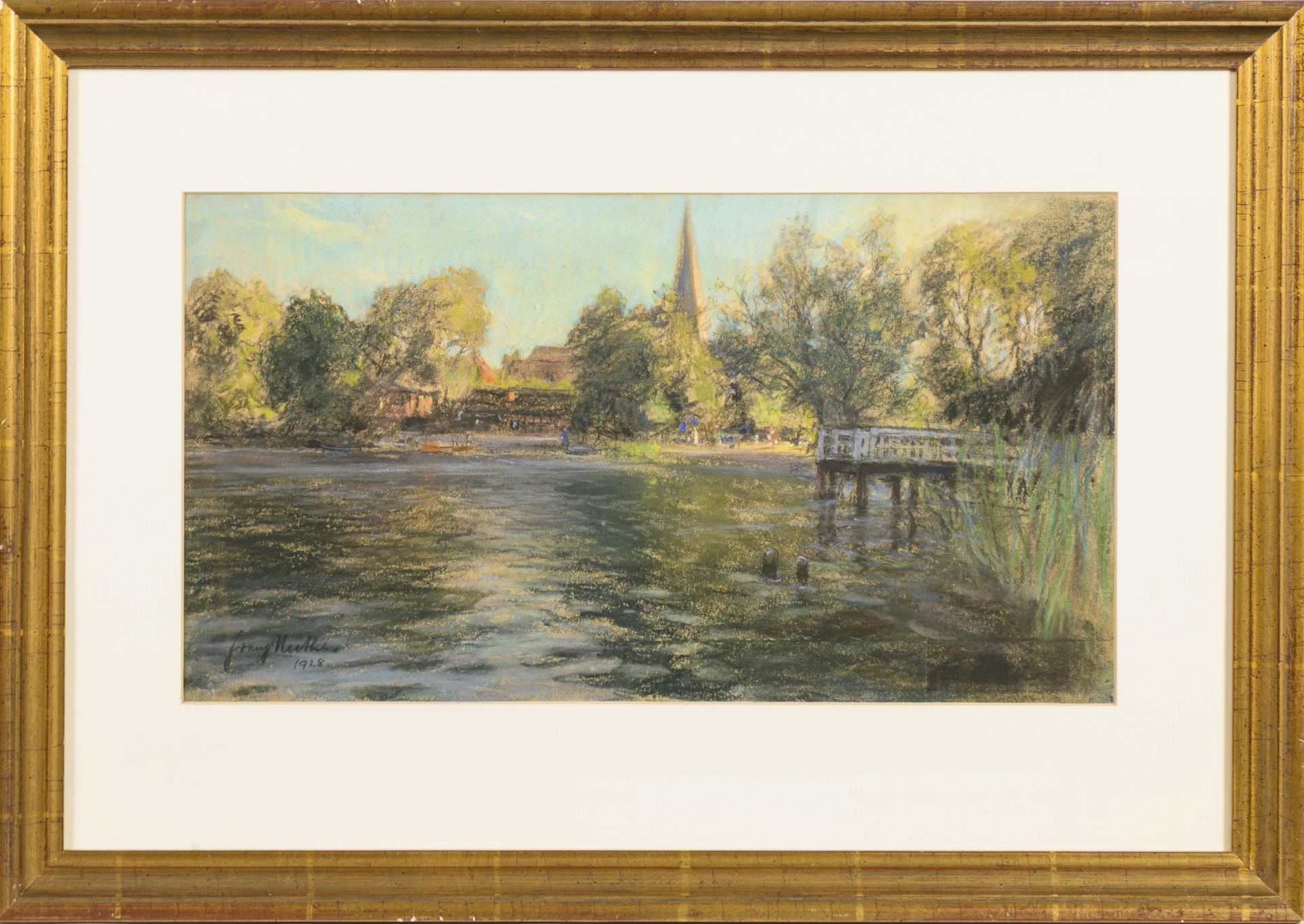 Blick über das Wasser mit dem Steg zur Kirche hinter Bäumen im Sonnenschein.