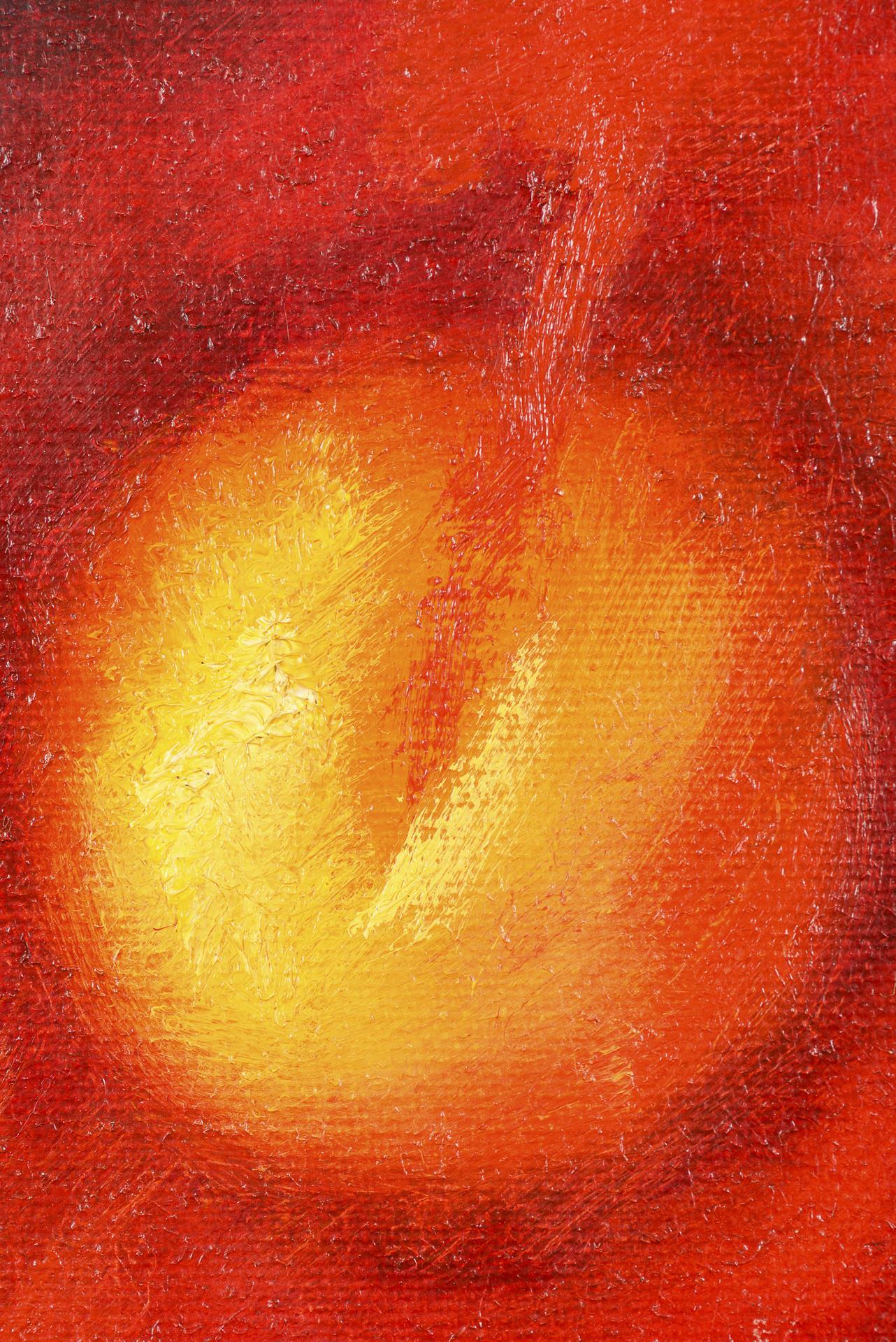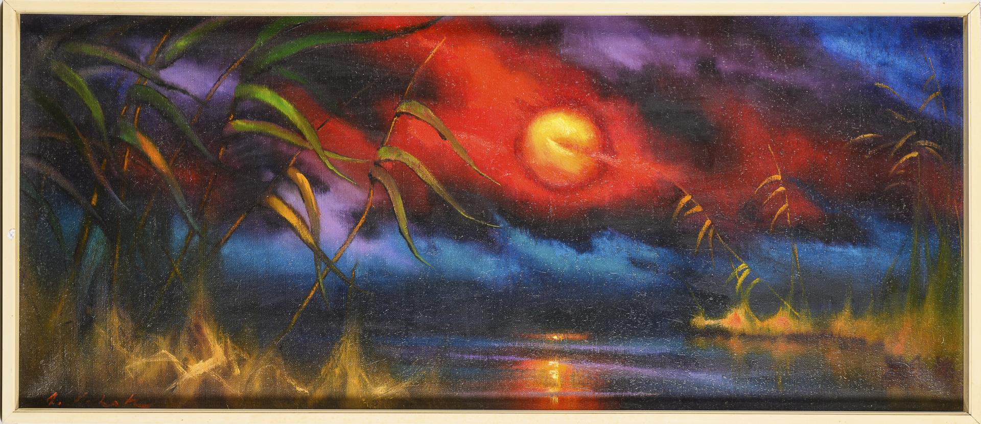 Farblich expressiv gemalte Seelandschaft mit rötlicher Sonne über dem Schilf.