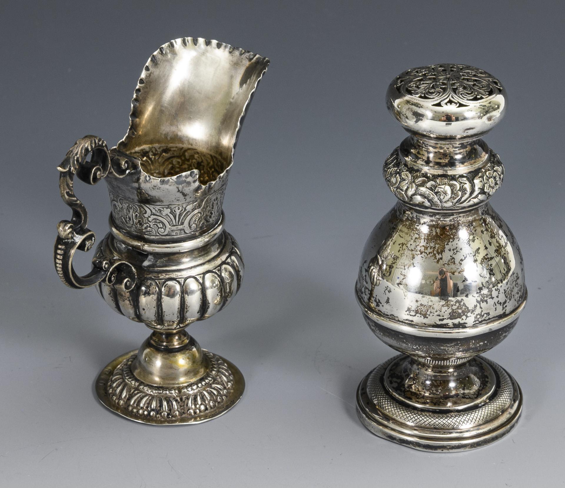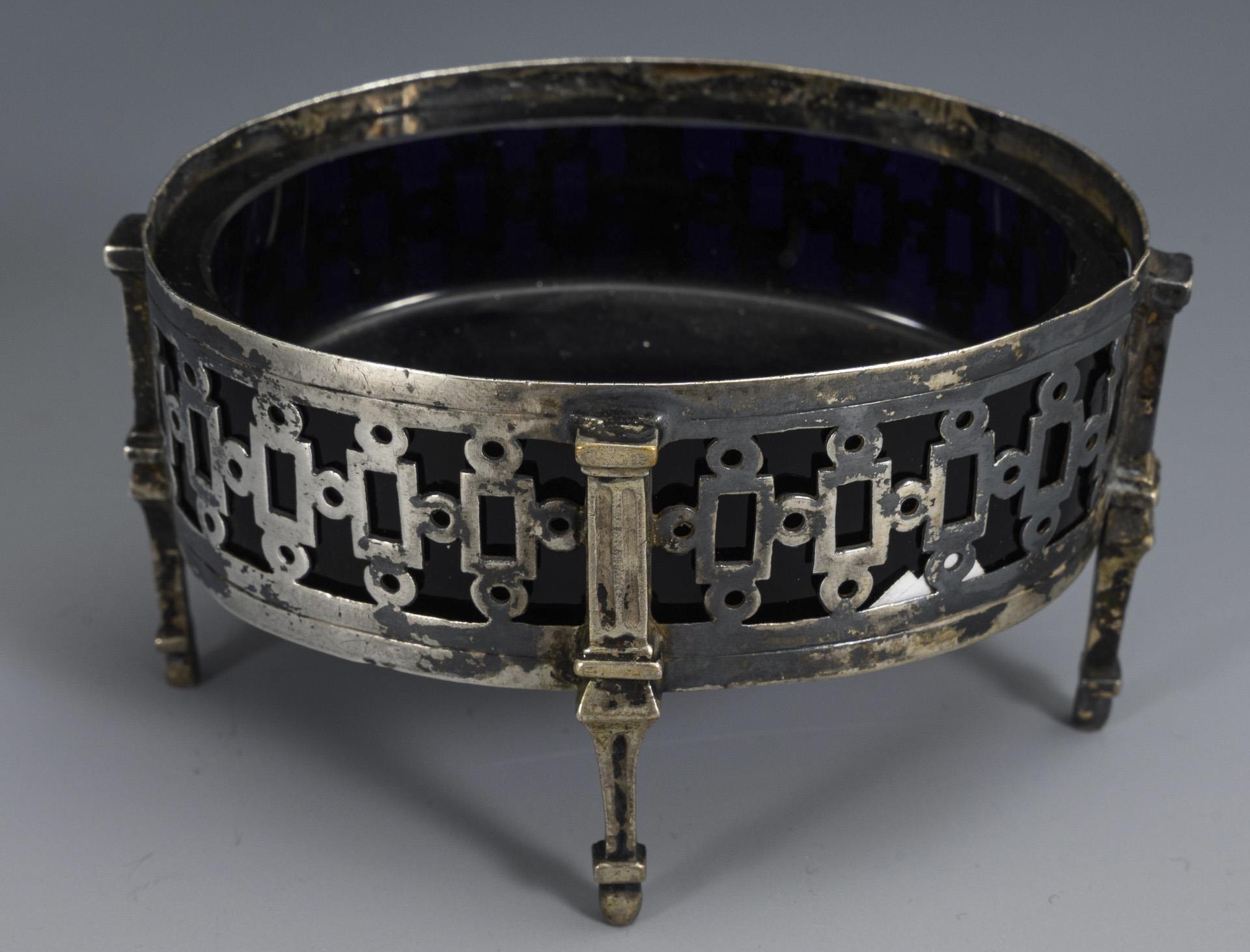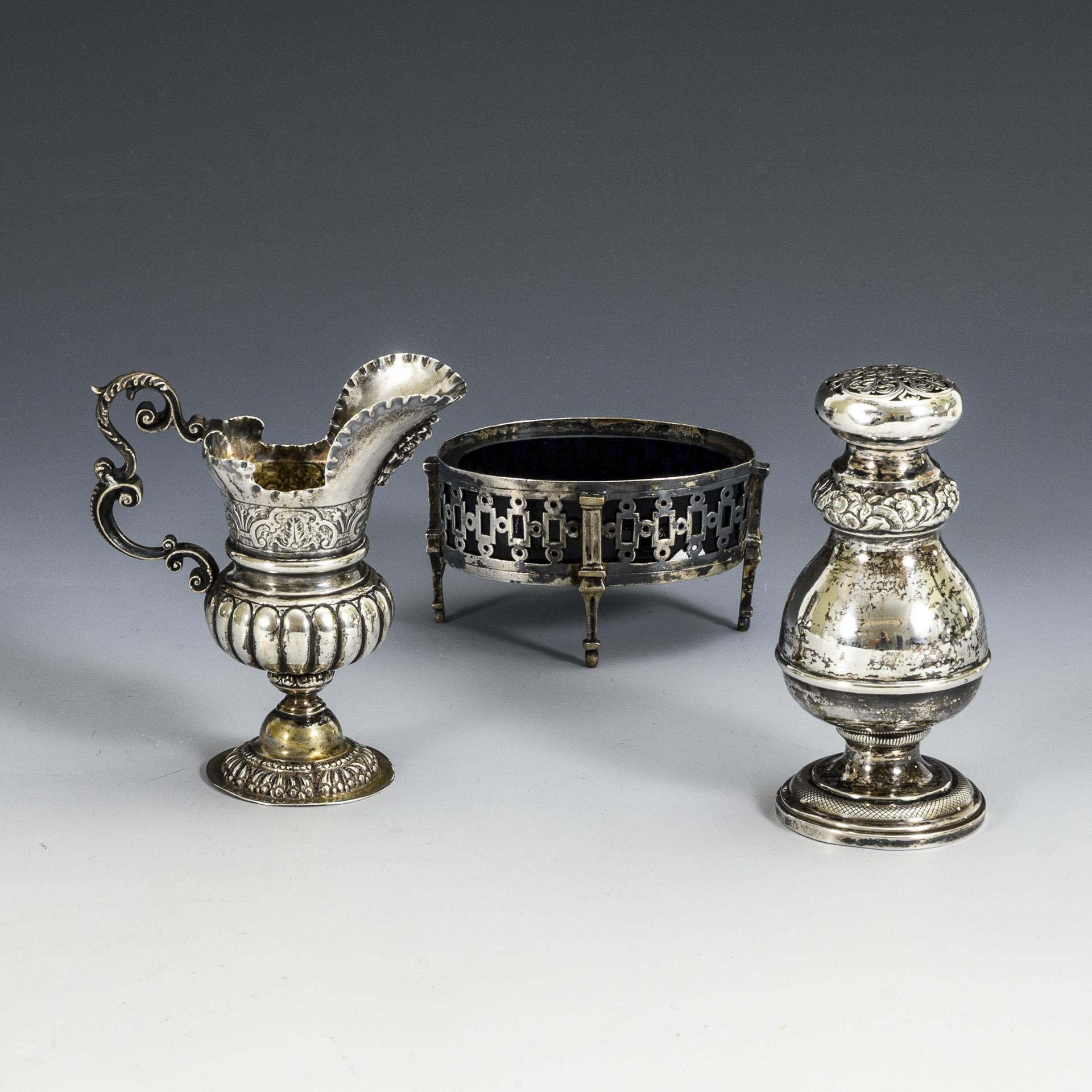 Klassizistische Saliere mit Kobaltglaseinsatz (Georg Ignatius Baur, Augsburg 1783-85), 4,8 x 9 x 7 cm. / Hanauer Helmkännchen (3 Historismuspunzen), H 10,2 cm. / Gewürz-Streuer (Silber geprüft), H 11 cm. Altersspuren. Saliere mit Lötspuren und Wandungsriss, Glaseinsatz bestoßen.