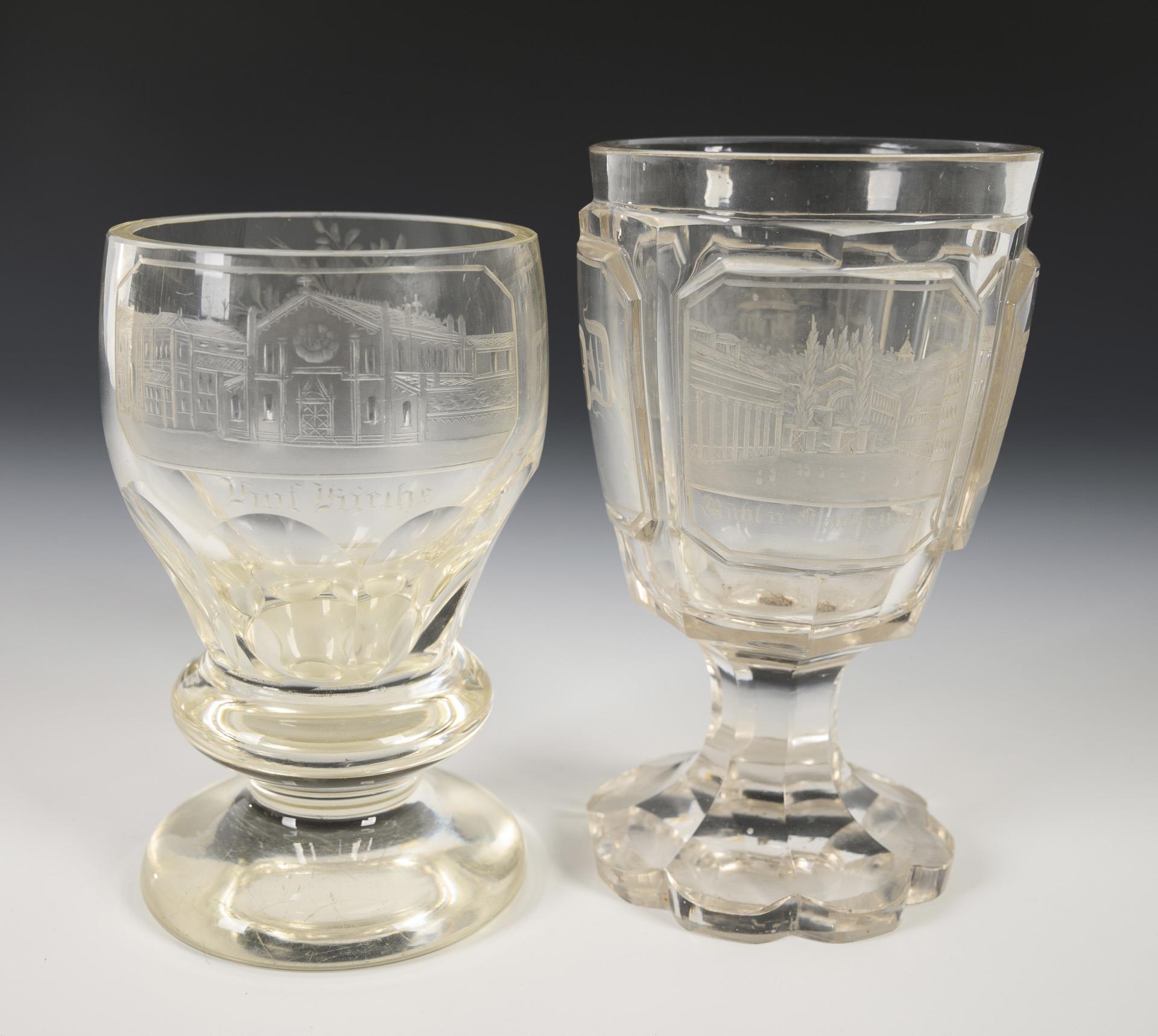 1x Zylinderglas, Ende 18. Jh.: schauseitig ein bekröntes Medaillon mit dem Monogramm "WK" (H 13,5 cm). / 1x Biedermeier-Kelchglas mit Facetten, Kerb- Oliven- und Steinelschliff: schauseitig ein hochgeschliffenes Medaillon mit gravierten Darstellung einer Landschaftsinsel mit Kreuz und Anker sowie der Bezeichnung "Dulde und hoffe", verso der Name "Eleonore Reissig" (H 12,5 cm). / 2x um 1850: 2 Ansichtenkelchgläser, 1x mit Ansichten von Karlsbad und 1x mit der Ansicht der Hofkirche in München (H 14 und 12,5 cm). 2 minimale Randbestoßung am Zylinderglas (Ø ca. 1 mm), Chip am Rand des Biedermeier-Glases.