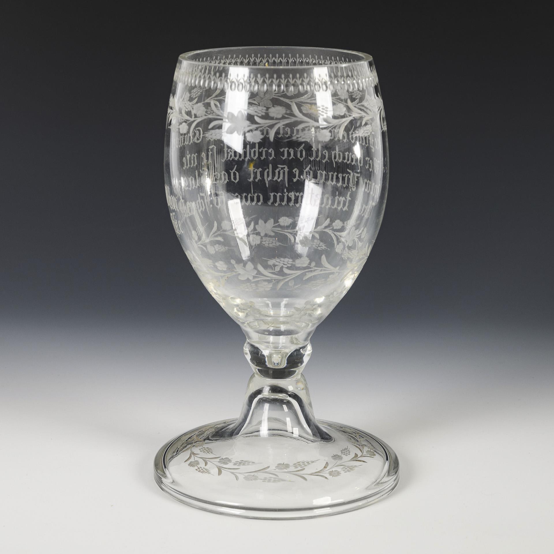 Ovoide Kuppa, konischer Nodus, glockenförmiger Rundfuß. Auf Kuppa und Fuß gravierte Ähren- und Blütenbänder sowie eine Olivenlinsenbordüre mit Stecknadelblumen an der Mündung, schauseitig der gravierte Spruch "Die Freude wohnet auf dem Grunde / Wer heuchelt, der erblickt sie nie / Drum Freunde führt das Glas zum Munde / Und trinkt rein aus so schmeckt ihr sie.". Minimale Bestoßung am Mündungsrand (Ø 1 mm).