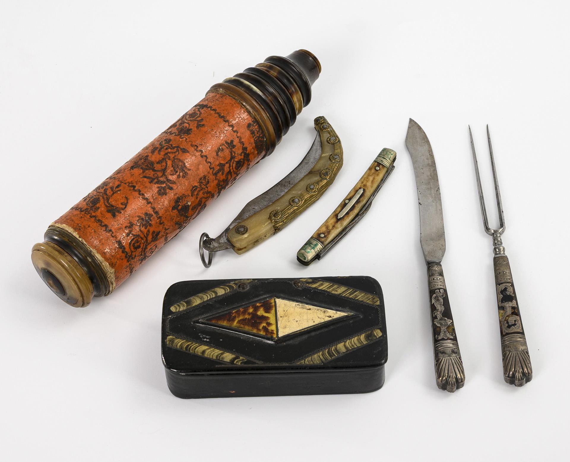 Barockes terrestrisches, 5-zügiges Fernrohr aus Pappe mit gedrechselten Hornführungen sowie Objektiv-Schraubkappe aus Horn. Tubus mit ornamental geprägtem, rot gefärbten Papier beklebt und undeutlich "Leonardo Semitecolo" gemarkt, Auszüge mit hell gesprenkeltem Papier beklebt. Im Inneren 3 Linsen zusätzlich zum Objektiv. Wohl offenes Okular, dessen Schraubkappe fehlt. Einige Fehlstellen an der Tubus-Zier. / Barockes Besteck des 18. Jh. (Messer und lange Fleischgabel), an den Griffen beidseitig je mit Eisenschnitt und Horn verziert (Figuren auf Sockel bzw. Hund mit Ranke); die Klinge mit Kreuzmarken. Fehlstellen am Horn. / Biedermeier-Tabatiere aus schwarz lackiertem Papiermaché mit Messingscharnier; auf dem Deckel Rautenmuster mit Horn-, Elfenbein-Imitat und Malachit-Imitat sowie Zinn-Piqué. Einige Alters-/Gebrauchsspuren sowie Ausbruch im Deckel. / 2 Klappmessser: Spanisches Navaja mit Messingbeschlag am hellen Horngriff (kleine Ausbrüche) bzw. kleines Taschenmesser mit 4 Klingen am Geweihgriff.