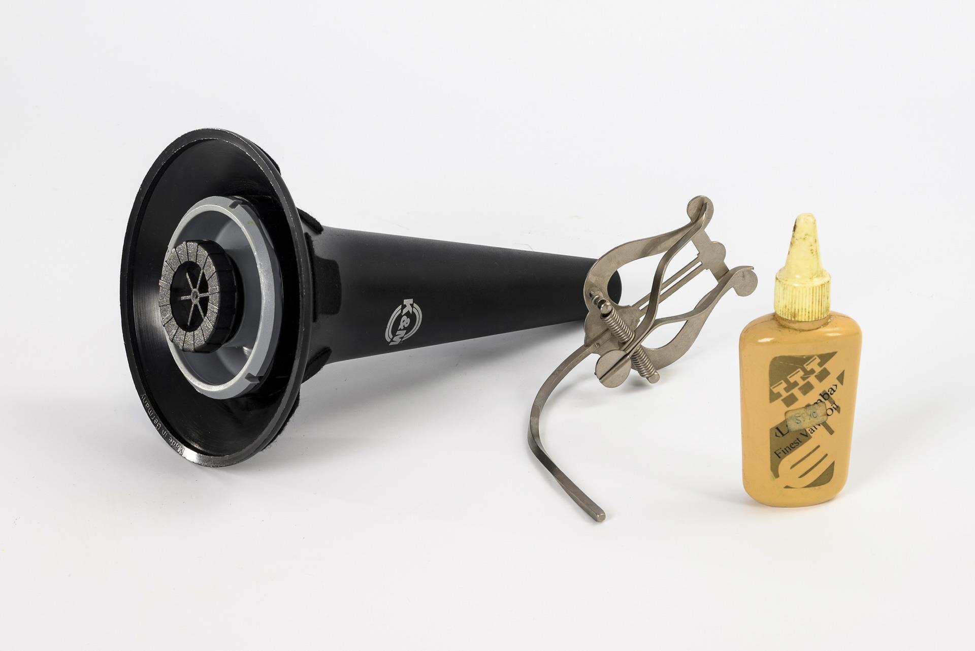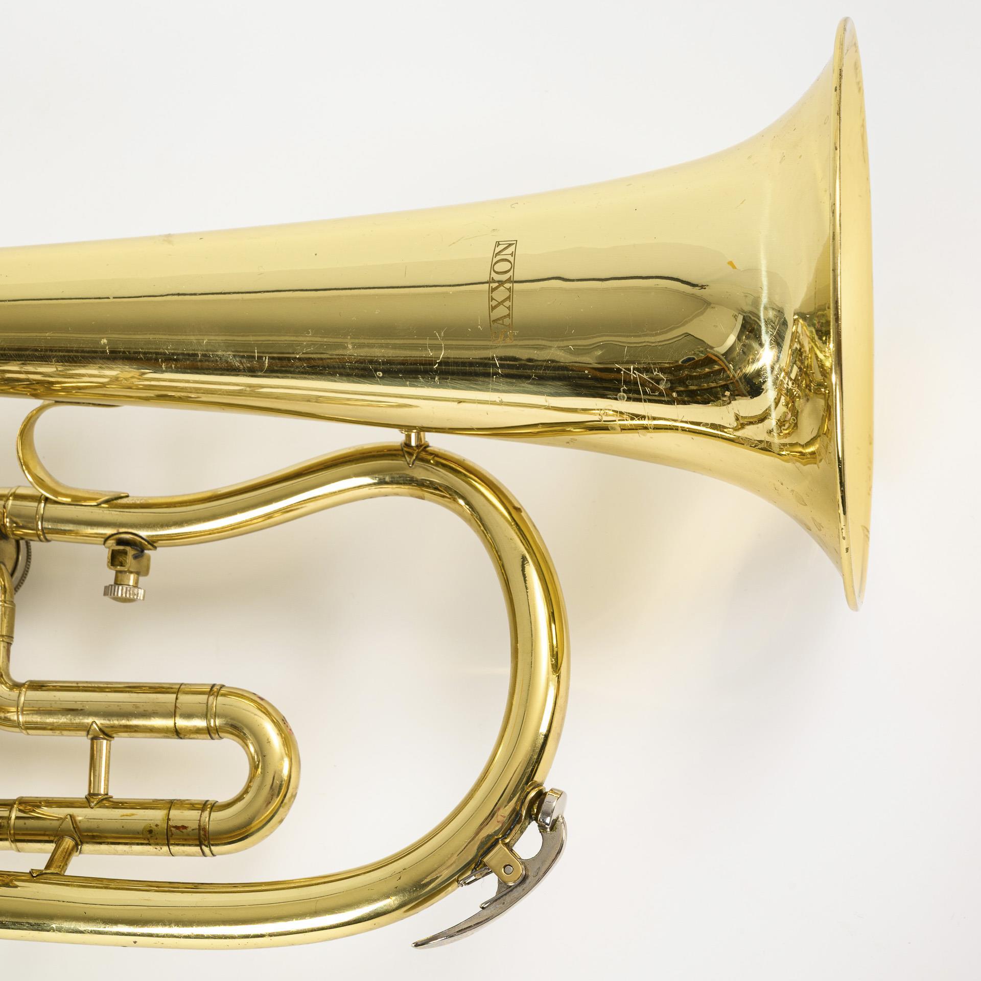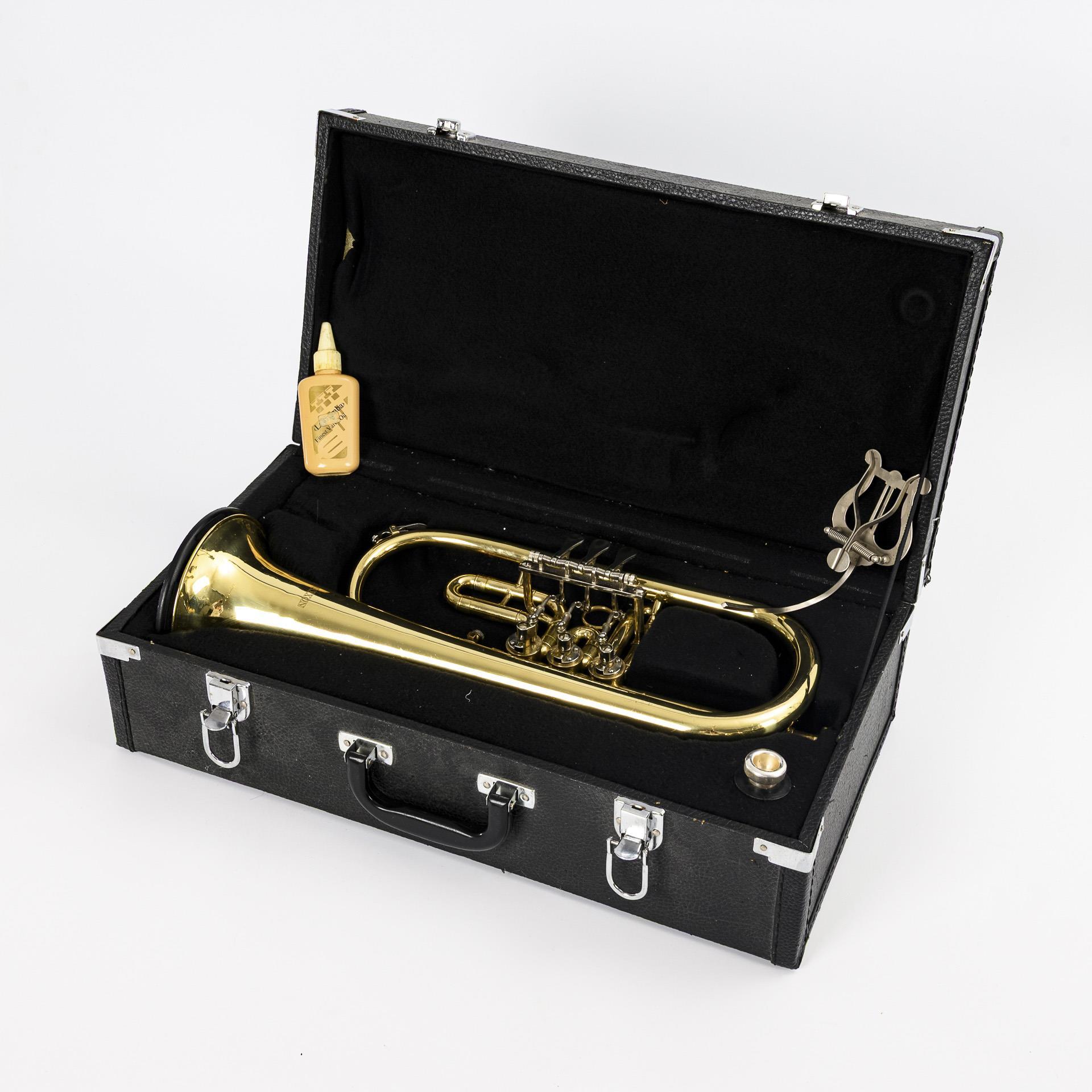 Einer Trompete ähnliches Blasinstrument mit 3 Drehventilen sowie Notenhalter im schwarzen Koffer. Dazu ein ausklappbarer Ständer "K&M". 1 Ventil schwergängig, geringe Alters-/Gebrauchsspuren am Instrument, einige am Koffer.