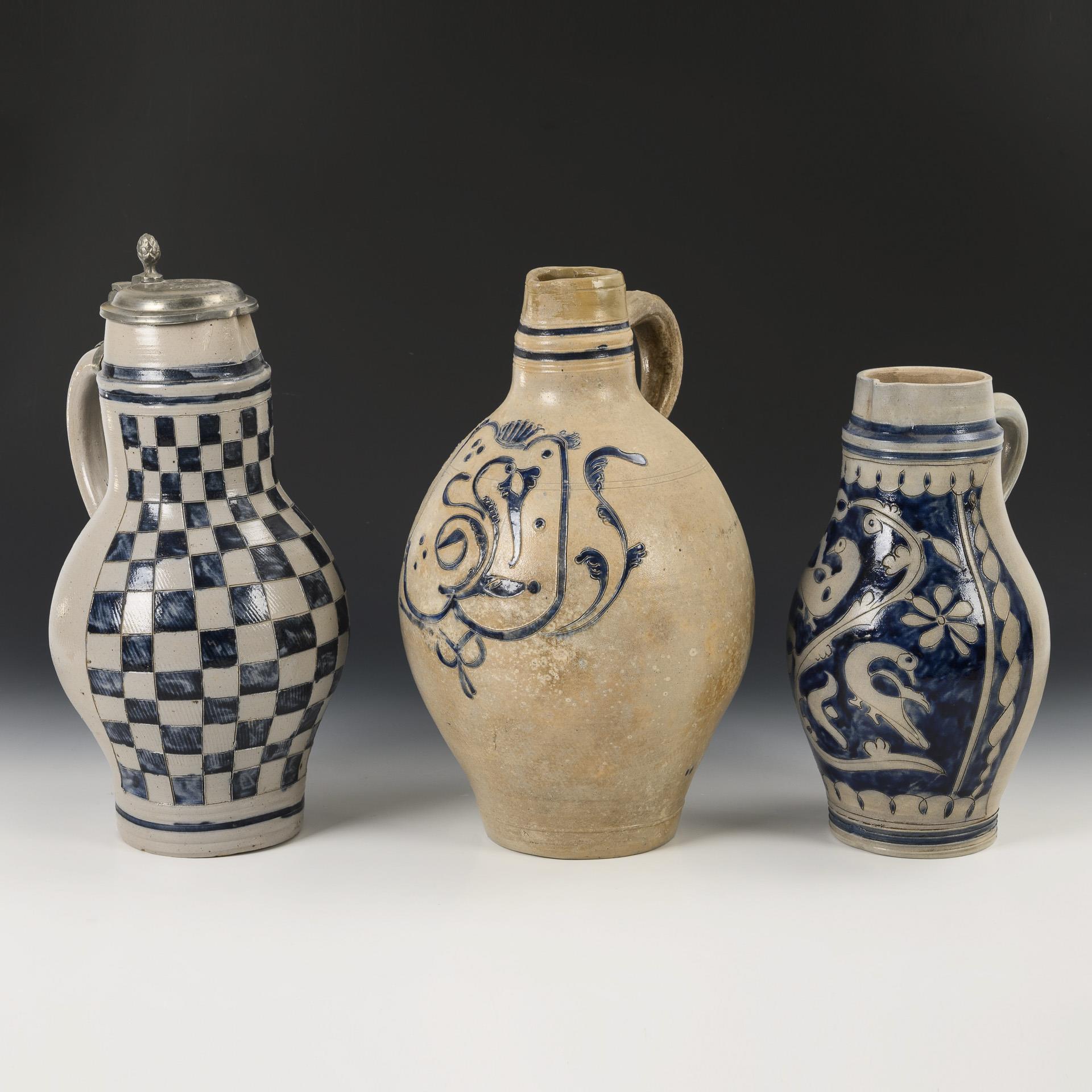 1 barocker Kugelbauchkrug mit gerilltem Enghals und hohem, gerilltem Ohrenhenkel, schauseitig ein stilisiertes Wappenmedaillon mit Bekrönung und Blattranken. 2 Birnkrüge, 1x mit Schachbrettmuster und Zinndeckel mit Zapfendrücker, 1x mit Floralranke und Vögeln, flankiert von Zopfbändern. Kugelbauchkrug am Hals restauriert, Altersspuren, partiell bestoßen.