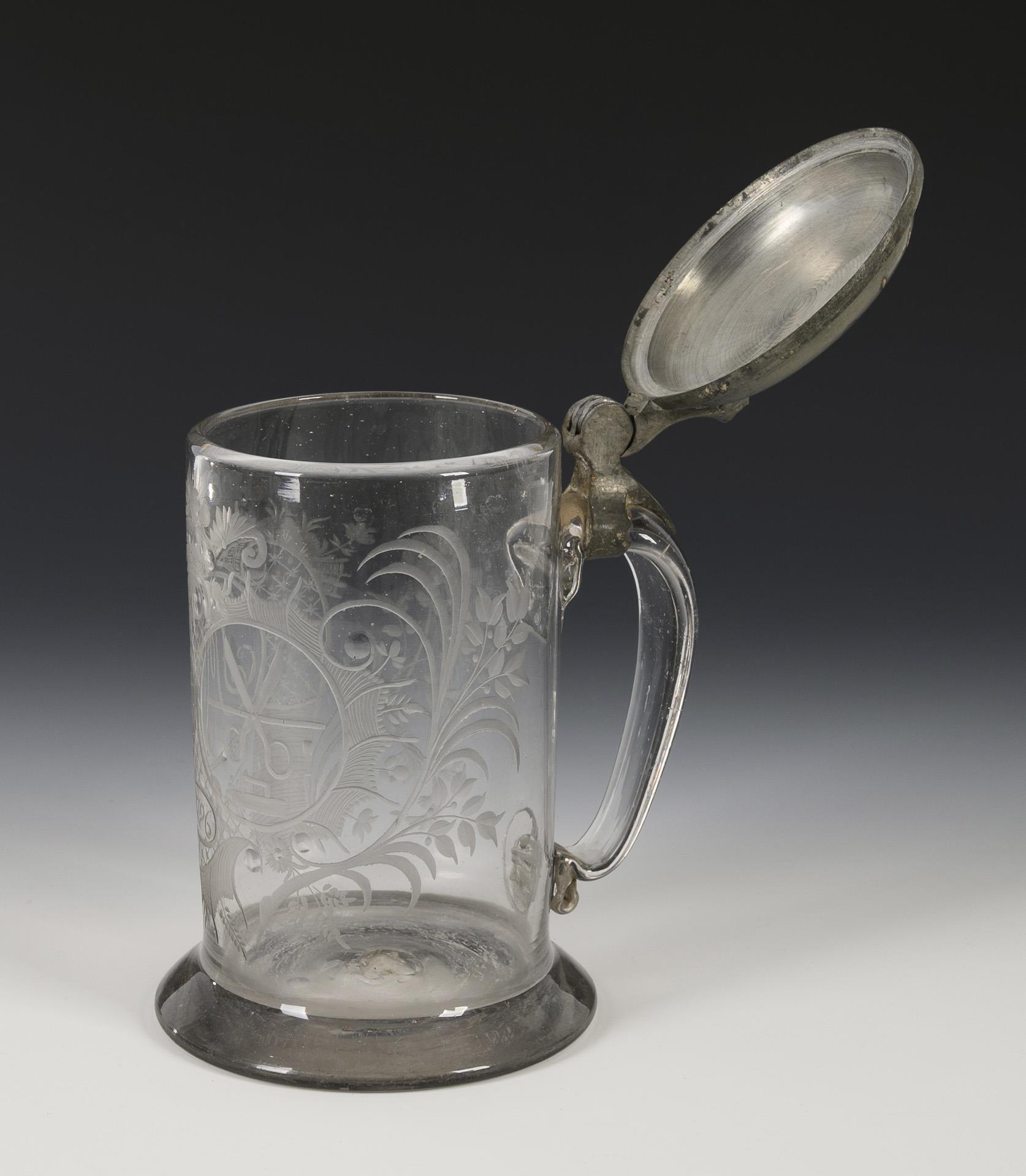 Walzenkrug mit ausgestelltem Stand, Bandhenkel und zinnmontiertem Scharnierdeckel; Abriss. Schauseitig Rocaillegravur mit Krone, geschliffenen Linsen und zwei Medaillons, darin ein ligiertes Monogramm und das Zunftzeichen des Schneiderhandwerks, datiert "1792". Deckeldrücker fehlt.