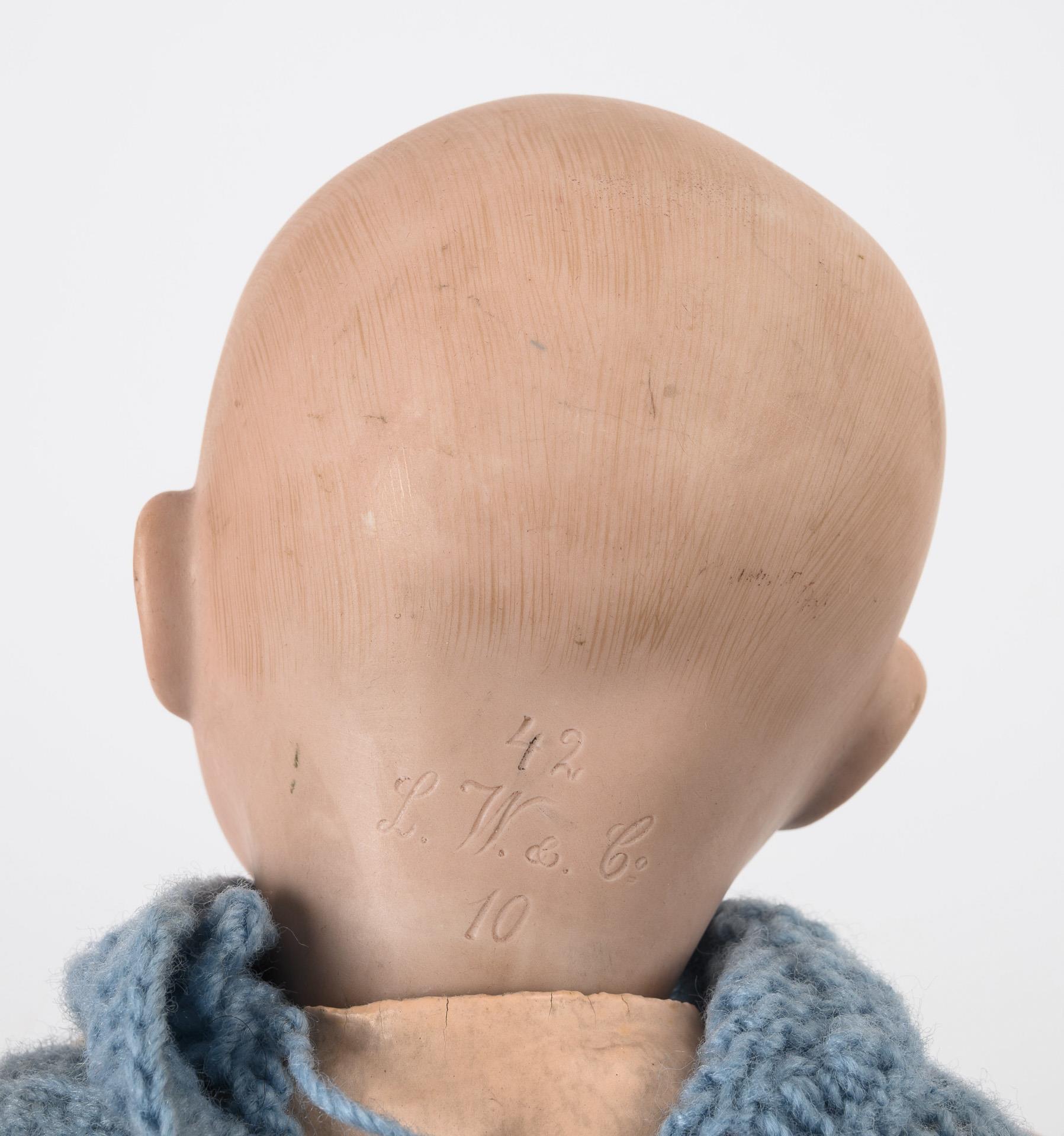Kurbelkopf, feste blaue Glasaugen, Zunge, gestrichelte Babyhaare. 5-teiliger Sitzbabykörper. Blaue Strickkleidung, schwarze Schuhe. Linke Wange mit minimalem Farbabrieb, Finger mit Reparaturen, 1 Zeh und Ferse rechts bestoßen.