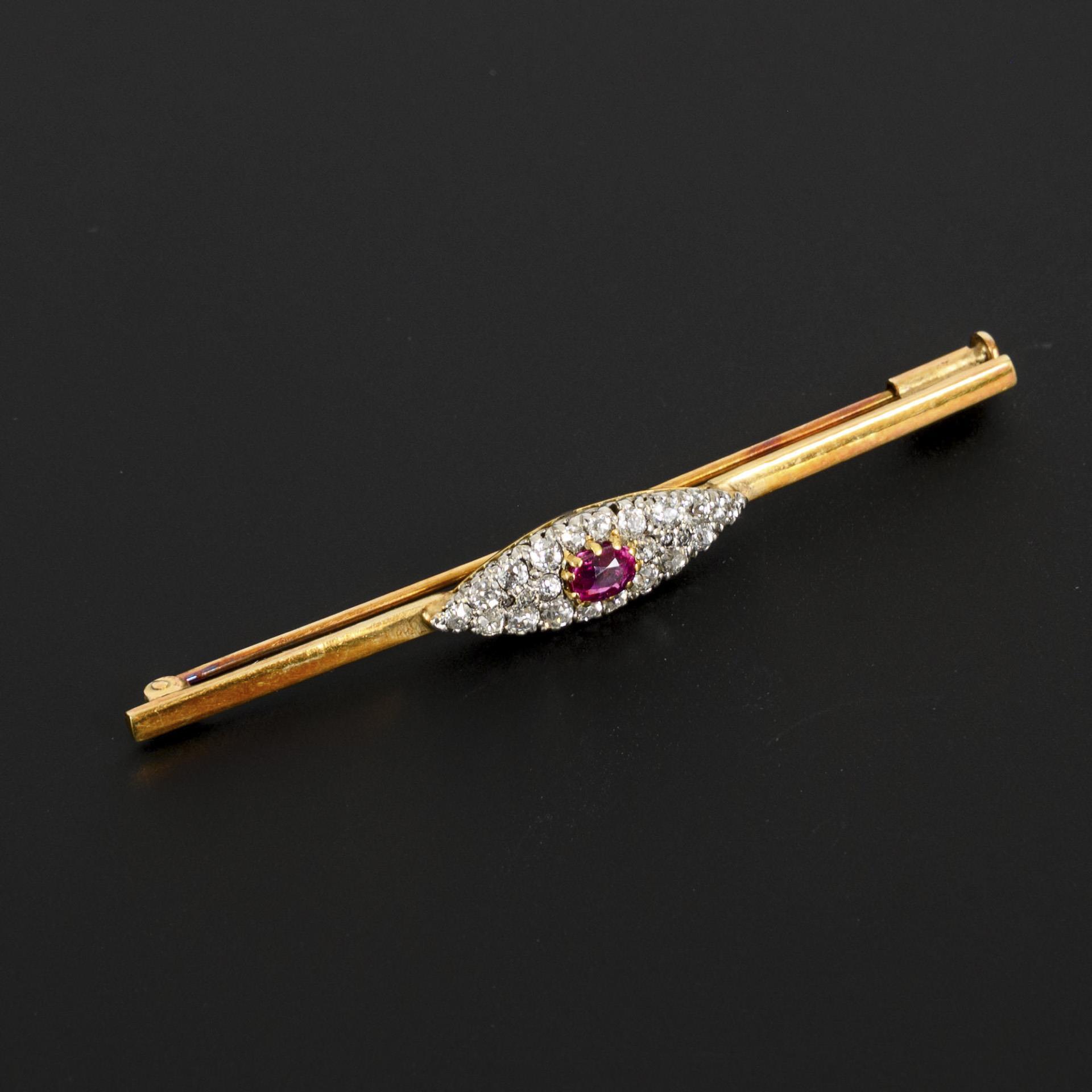 Jugendstil-Stabbrosche mit rotem Farbstein und Altschliff-Brillanten.