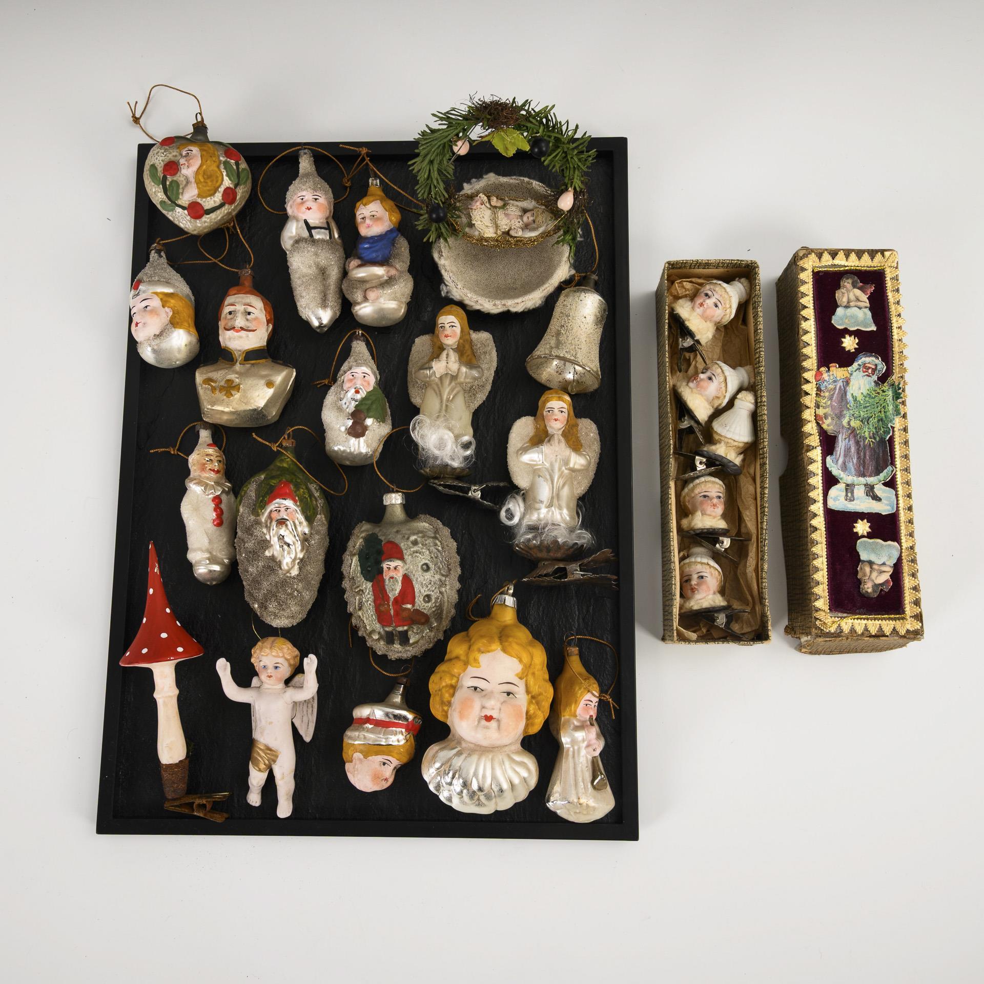 Ca. 23 Teile für den Weihnachtsbaum. Verschiedene Figuren und Köpfe, darunter 1x Kaiser Wilhelm. Dazu kleiner Kasten mit 5 Porzellanköpfchen an Metallklammern. Teils kleine Defekte.