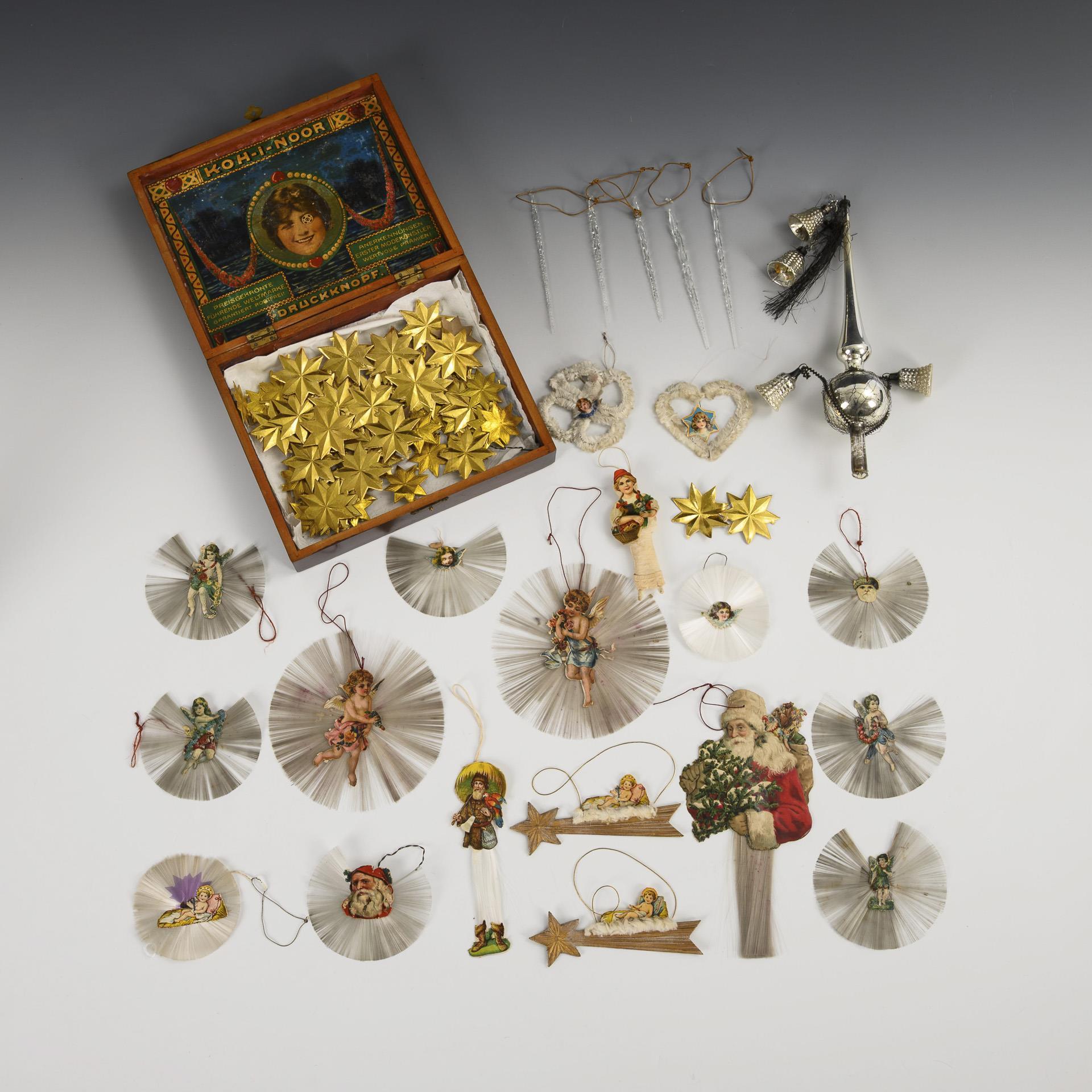 Umfangreiches Sortiment für den Weihnachtsbaum: Glasfaserschmuck mit Oblaten, Dresdner Pappe und eine Baumspitze aus Glas. Dazu mahagonifarbenes Holzkästchen (5,5 x 22 x 17,5 cm). Teils Altersspuren.