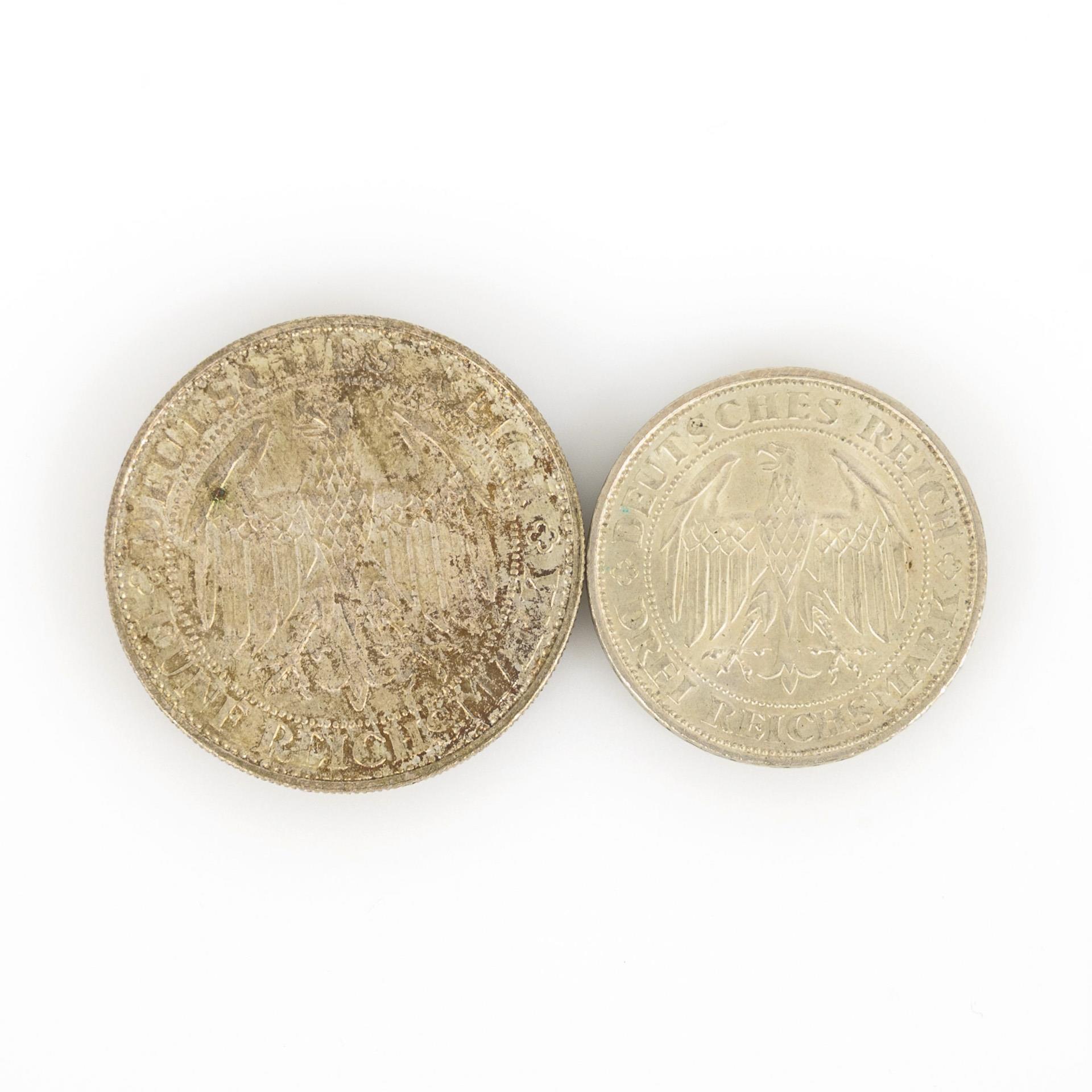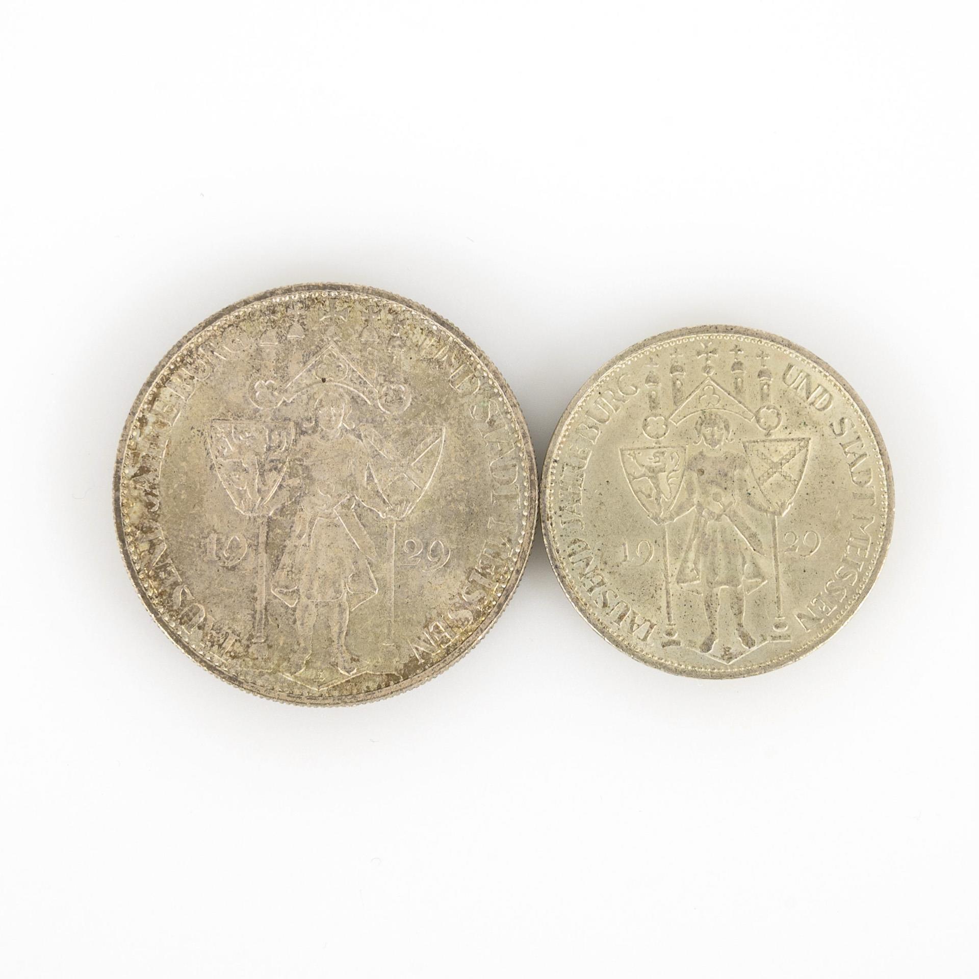 5 Reichsmark und 3 Reichsmark, "Tausend Jahre Burg und Stadt Meissen", 1929. 3 Mark Stück - Rand: Einigkeit und Recht und Freiheit", 5 Mark mit geriffeltem Rand. Zustand: vorzüglich.