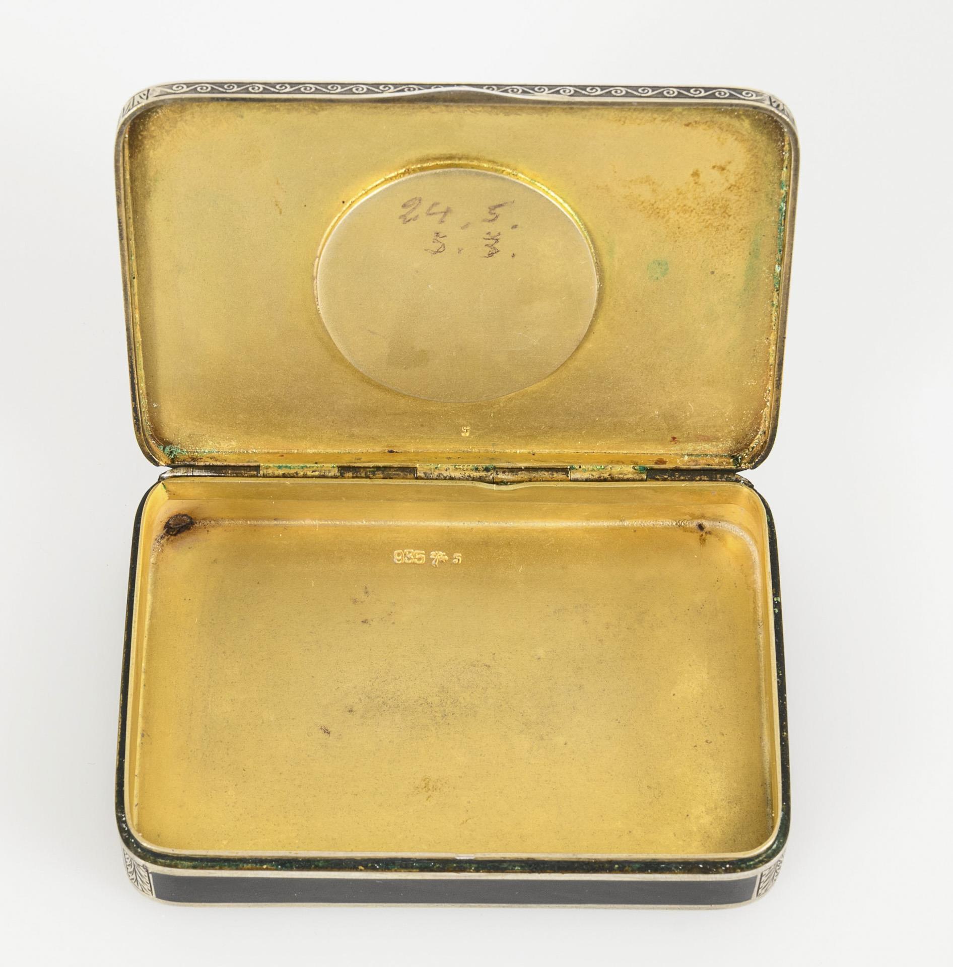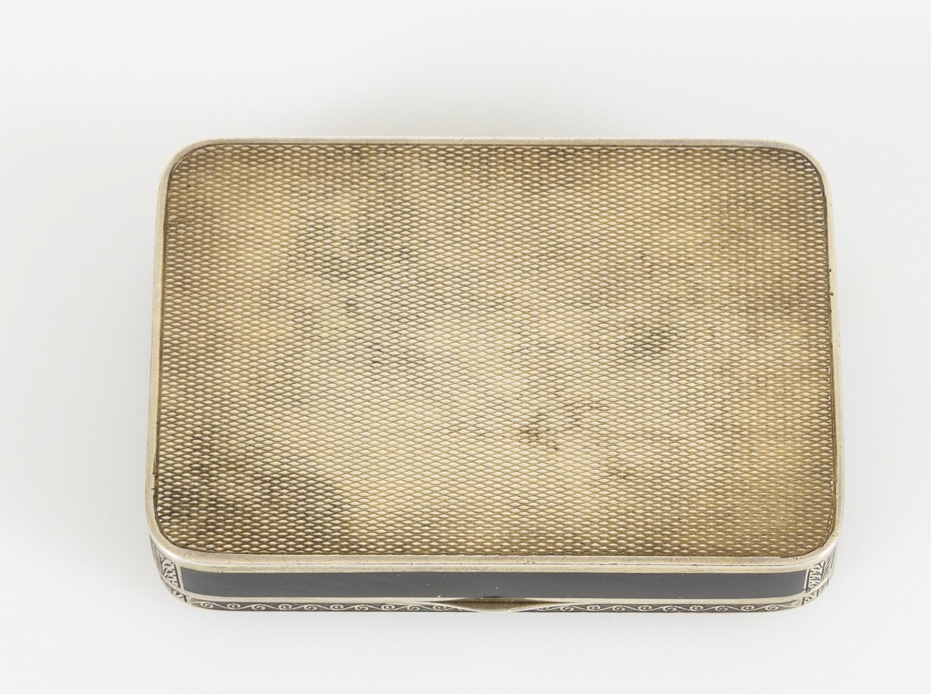 Silber, schwarzes Email, perlmutthinterlegtes Églomisé. 7,8 x 5,5 x 1,5 cm. 127,0 g.
