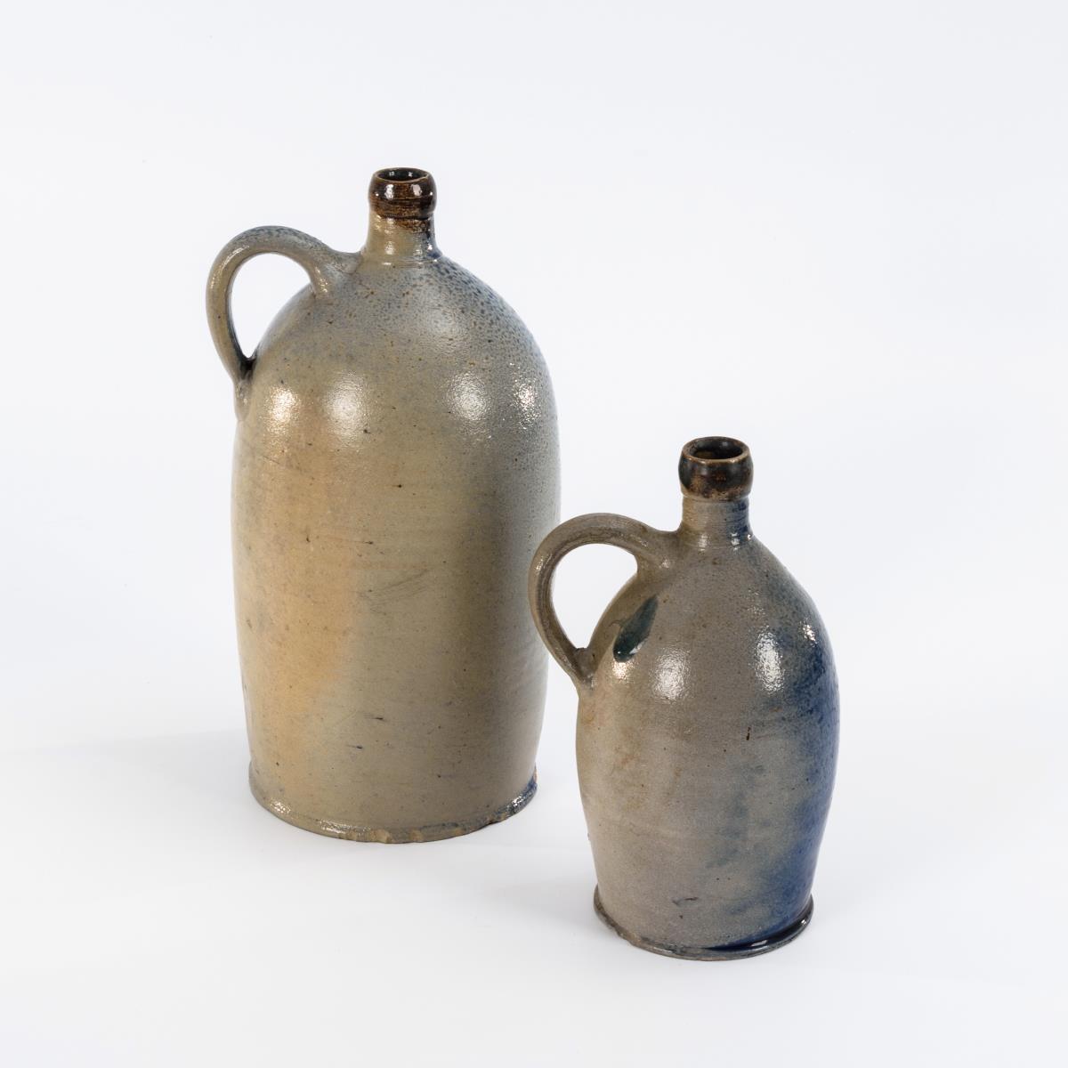 Graues und braunes, salzglasiertes Steinzeug, 2x mit kobaltblauem Smaltebewurf. H 15,5 cm - 29,5 cm.