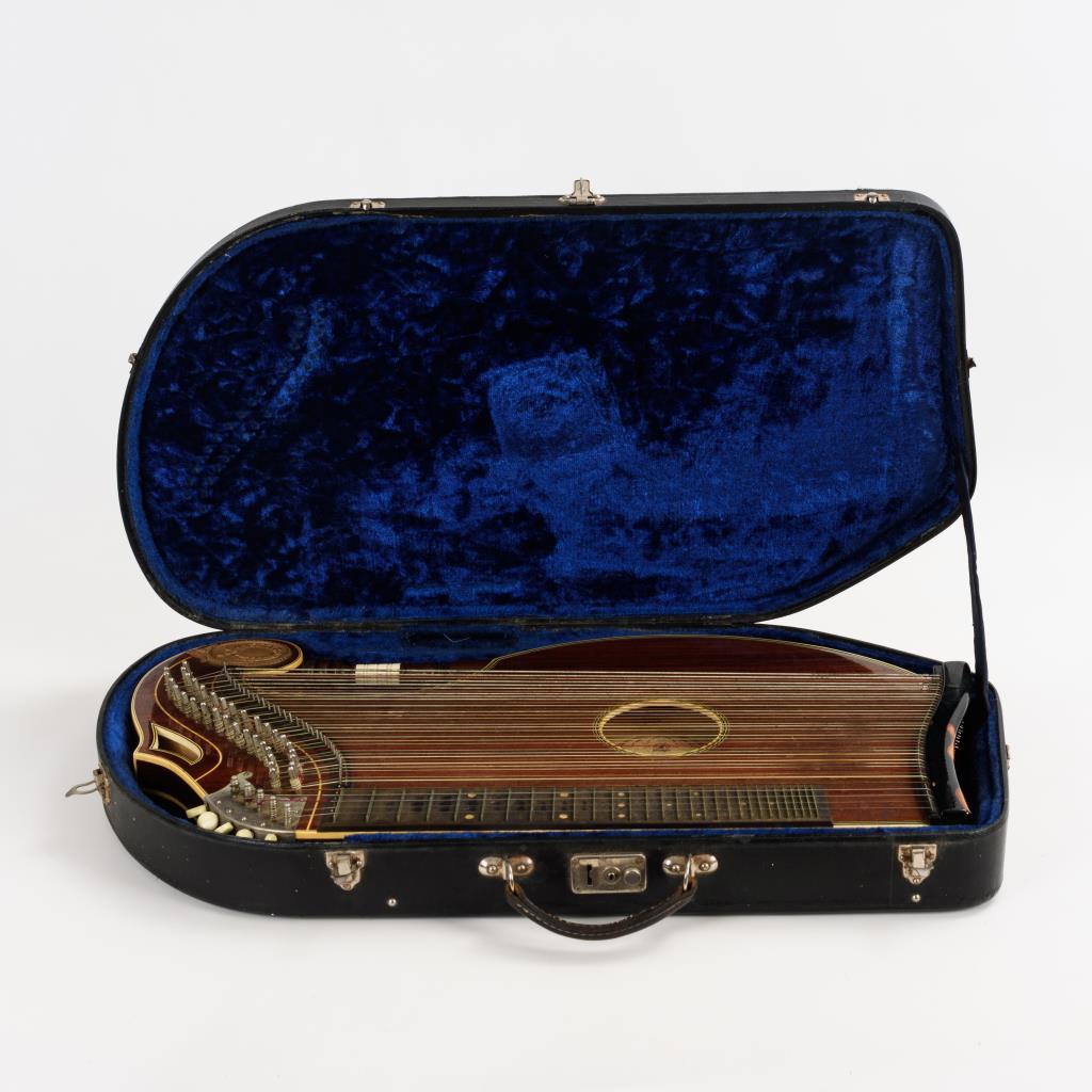 Korpus mit Einlagen und Applikationen, 5 Spielsaiten, 35 Akkordsaiten. Instrument teils etwas berieben, Koffer mit Defekten.