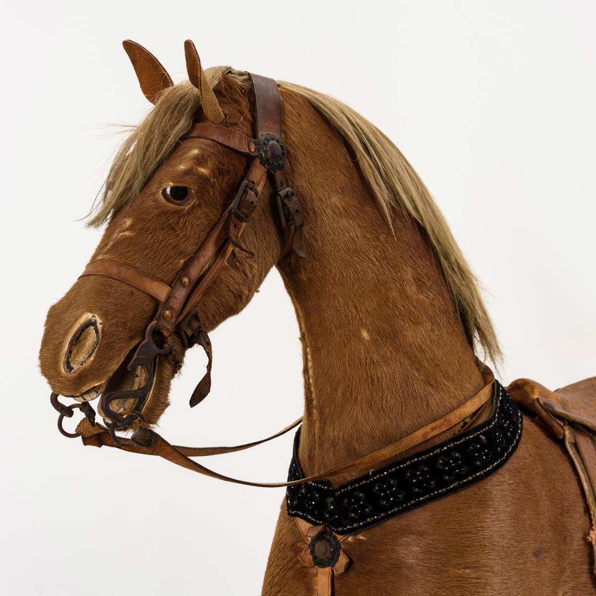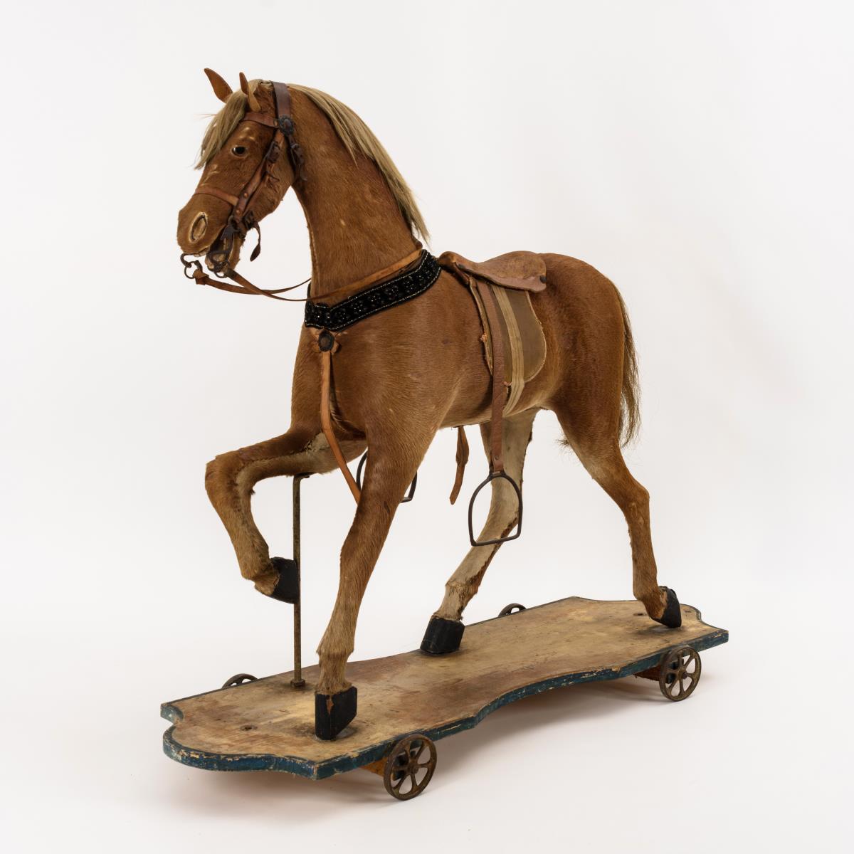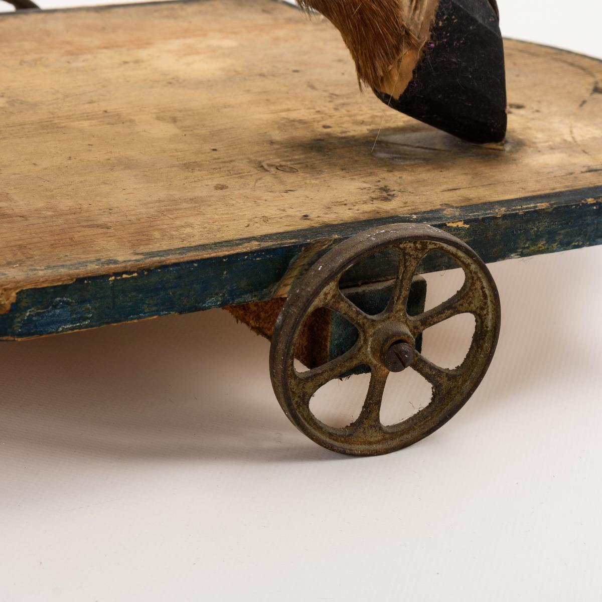 Pferd auf Räderplatte: Fellbezogener Fuchs mit Glasaugen, offenem Maul mit geschnitzten Zähnen, originaler Mähne und Schweif. Teils defektes Zaumzeug und Sattel. Nähte teils geöffnet, 1 Ohr lose, Altersspuren, Bemalung der Grundplatte berieben.